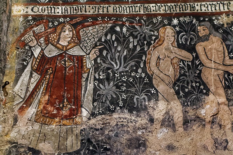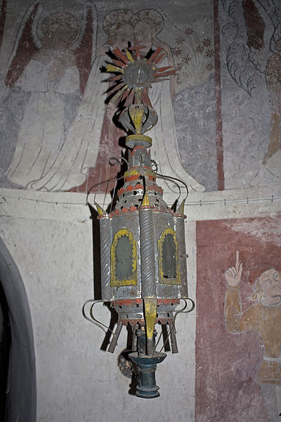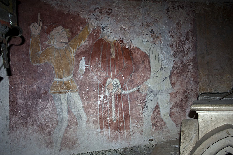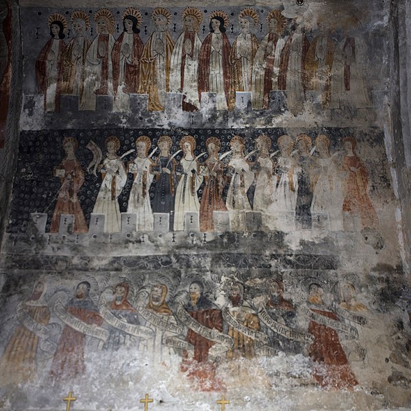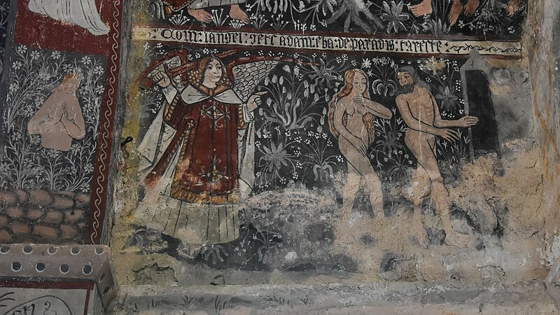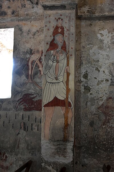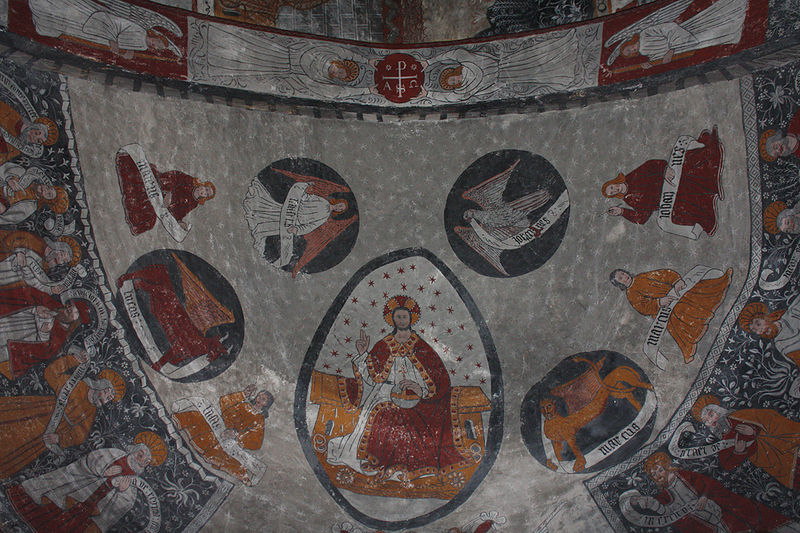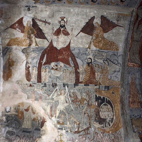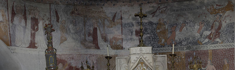 Les peintures murales, redécouvertes en 1873 sous un badigeon, sont réalisées sur un enduit rustique et, bien que d'inspiration médiévale, sont généralement datées de la seconde moitié du XVe siècle ; leur palette réduite et la sûreté du trait témoignent d'une grande habileté. Dans l'abside, au-dessus de l'autel, figure l'Assomption de la Vierge entourée des symboles des quatre évangélistes et de groupes de personnages auréolés portant des phylactères ; plus bas sont représentées la Nativité et l'Adoration des bergers ainsi que des scènes de la Passion, notamment la flagellation. La voûte sud de la première travée illustre la création et la chute d'Adam et Ève en trois tableaux, montrant la formation d'Ève, la tentation et l'expulsion du Paradis, avec des éléments symboliques comme l'Arbre de la Connaissance, le serpent et un château fort en arrière-plan. La voûte nord de la première travée montre le couronnement de la Vierge et, en dessous, le prêche et l'arrestation de saint Jean-Baptiste. La voûte sud de la deuxième travée représente la Nouvelle Jérusalem en trois zones successives évoquant le ciel et le purgatoire, avec des figures d'apôtres, de vierges portant la palme et des personnages tenant des textes de l'office des morts. La voûte nord de la deuxième travée offre la scène la plus détaillée, le Jugement dernier, divisé en trois registres : le ciel étoilé avec des anges sonnant la trompette, le monde terrestre centré sur le Christ en majesté, et la pesée des âmes par saint Michel suivie de la condamnation des damnés et de l'appel des élus. Sur les contreforts sont peints des anges, un grand saint Christophe et divers personnages invitant à l'écoute de la parole du Christ.