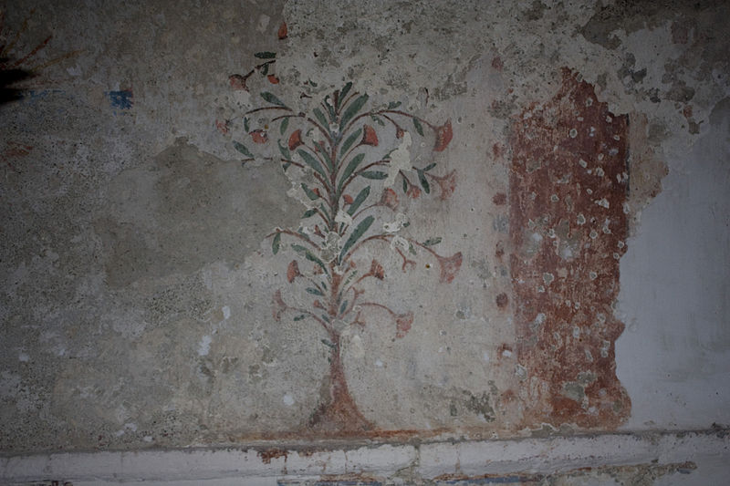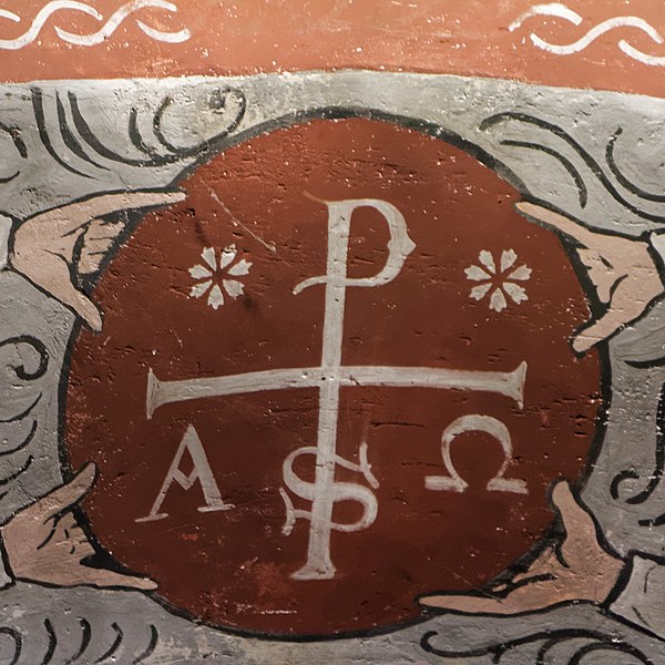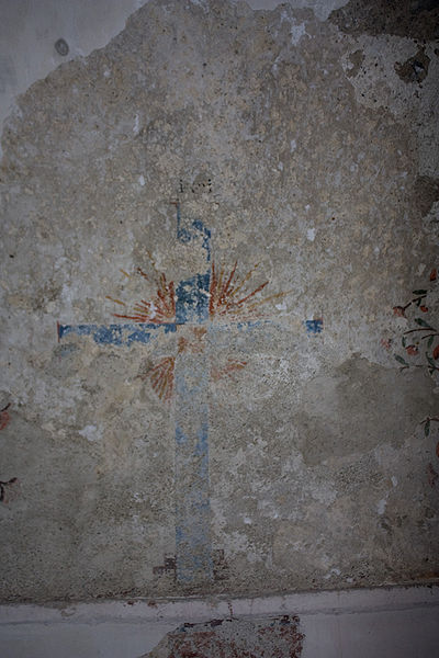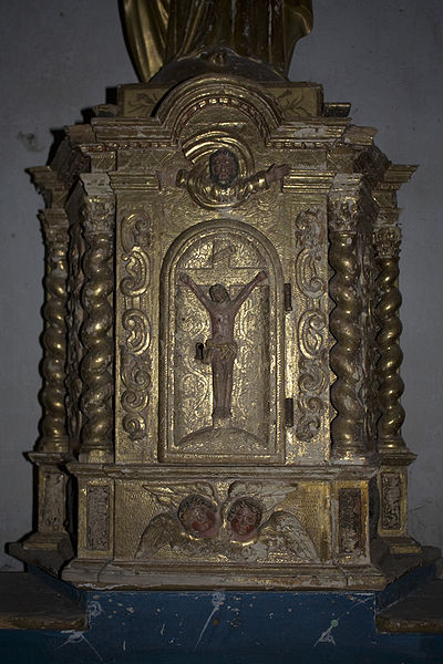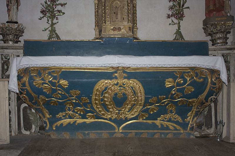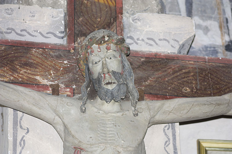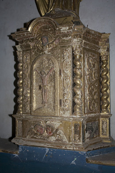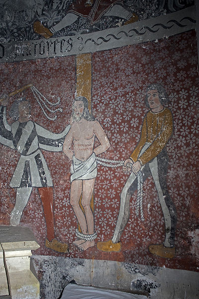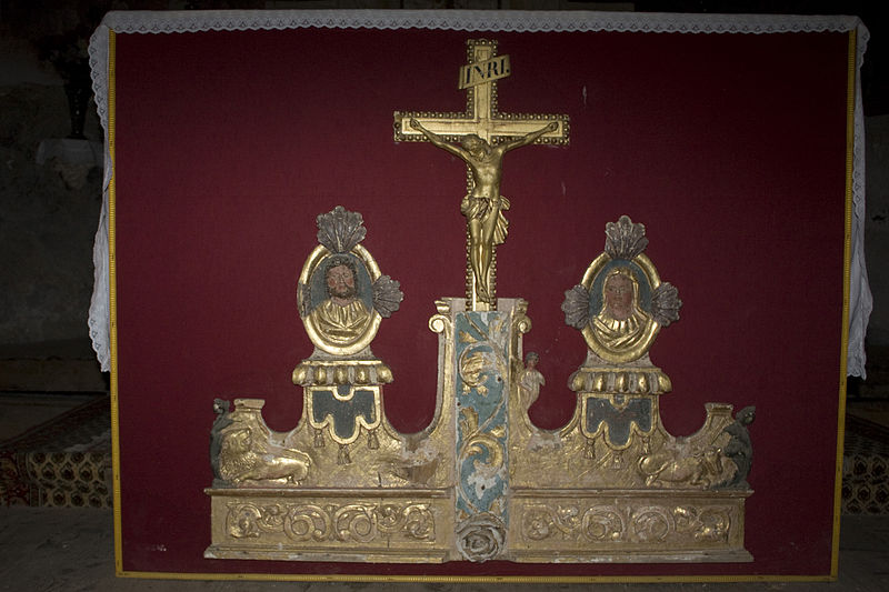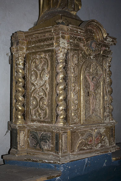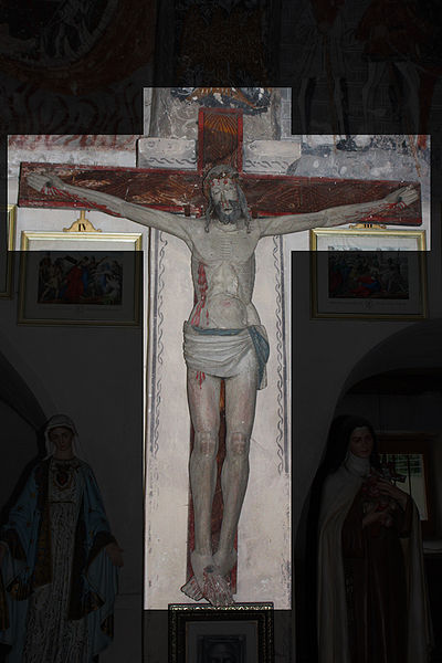 À gauche de l'autel se trouve une lanterne de procession en fer ouvragé datée de la première moitié du XIXe siècle, aujourd'hui en mauvais état en raison d'un équipement électrique inadapté et d'un montage précaire ; une seconde lanterne, plus petite, a disparu par vol. Le grand Christ, contemporain des fresques, porte les traces des tourments de la Passion et deux croix gravées sur les genoux ; il n'a apparemment jamais été restauré.