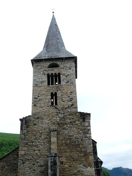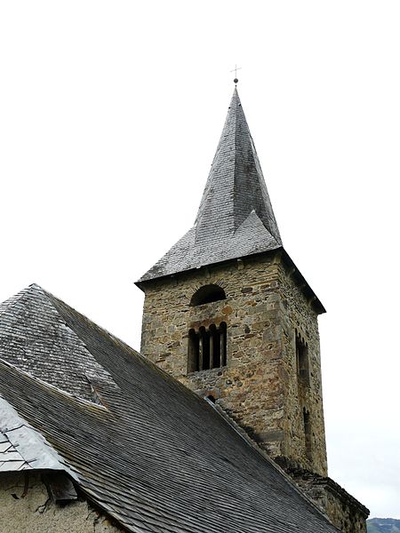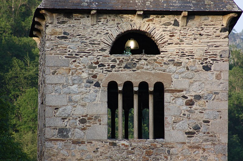La tour du clocher repose sur une base ancienne, massive et irrégulière, étayée par trois contreforts en granit, et s'allège par des ouvertures superposées divisées par des colonnettes de marbre ; elle porte la charpente en flèche recouverte d'ardoises. Le clocher abrite des cloches, dont la plus ancienne, datée de 1796, est classée au titre des monuments historiques.