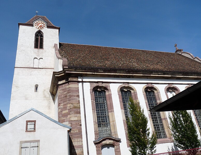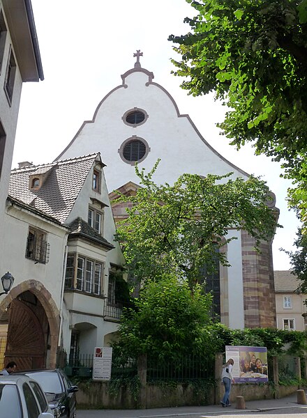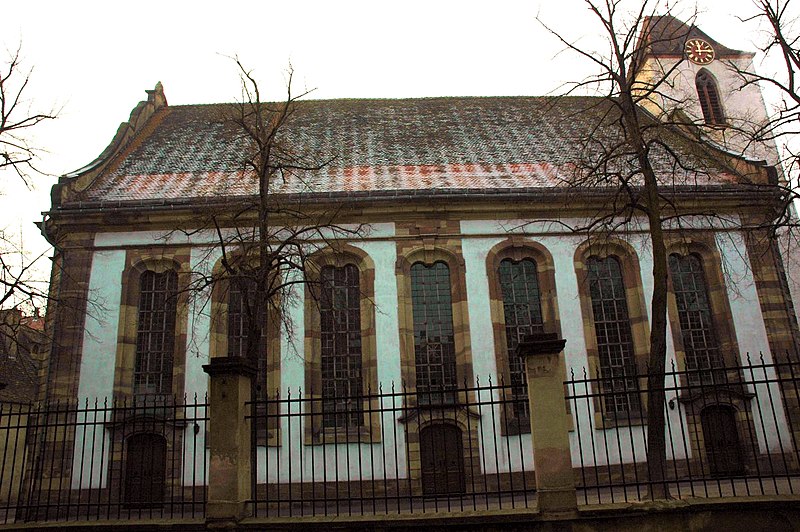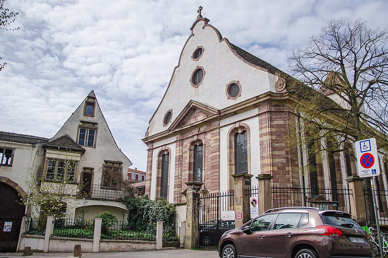 Parmi les éléments commémoratifs figurent un médaillon de Martin Bucer identique à celui de l’église Saint-Thomas et une plaque de bronze réalisée en 1929 par Albert Schultz. La mention des pasteurs successifs, gravée sous l’escalier, rappelle la continuité de la communauté depuis 1709 et porte jusqu’aux noms contemporains. Classée Monument historique le 5 mai 1988, l’église a fait l’objet de restaurations importantes ces dernières décennies, notamment de 2002 à 2015 pour l’édifice et l’orgue, la nef et la toiture ayant bénéficié d’un chantier en 2008. Située dans un faubourg populaire longtemps appelé Faubourg des Charrons puis Faubourg Blanc, puis Faubourg National, elle partage sa cour avec l’école primaire Sainte-Aurélie, construite sur un terrain paroissial entre 1843 et 1846 par Félix Fries. L’accès au public est limité en dehors des offices, de visites sur rendez‑vous ou des Journées européennes du patrimoine.