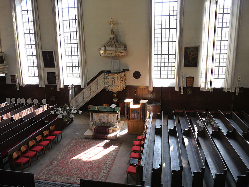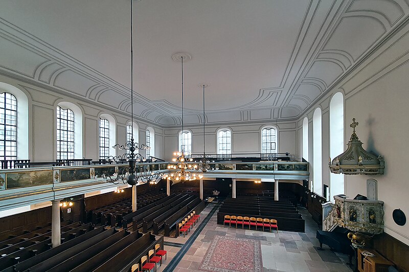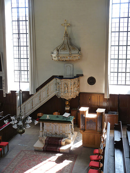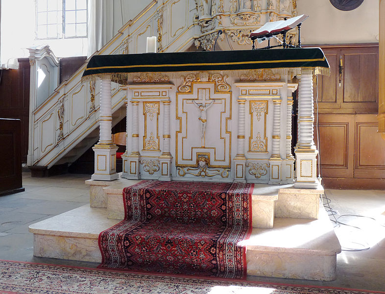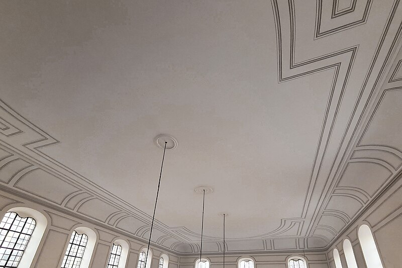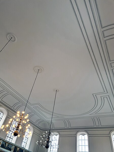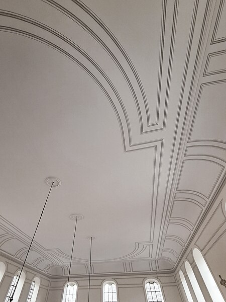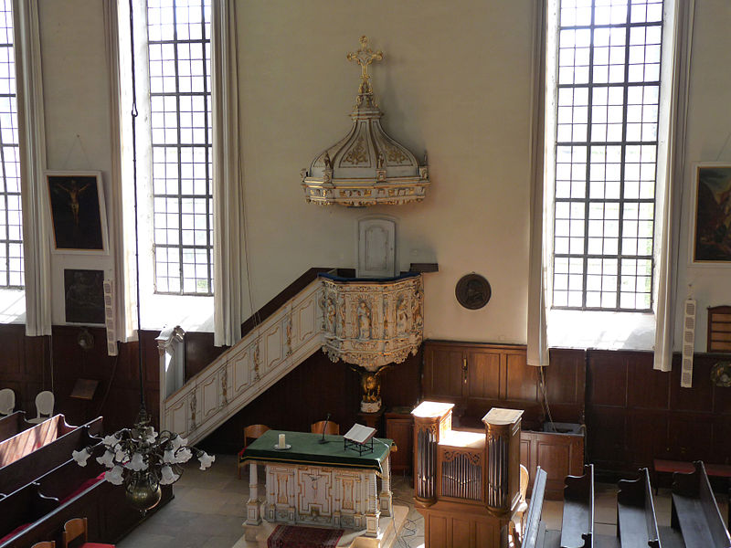 L’intérieur se distingue par un agencement baroque peint en blanc et or : l’autel et la chaire, datés du XVIIe siècle et provenant de l’ancienne église, présentent une polychromie retrouvée lors des restaurations récentes. Les archives paroissiales signalent des travaux importants entre 1668 et 1671, confiés à des artisans locaux, et l’autel et la chaire sont classés au titre des objets historiques. Des restaurations menées entre le début des années 2000 et 2014 ont permis de consolider ces ensembles et de rendre l’autel mobile afin d’accueillir des manifestations culturelles. Les dimensions intérieures sont d’environ 29 m de longueur, 18 m de largeur et 12 m de hauteur.
