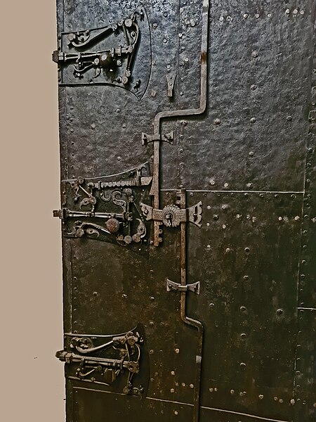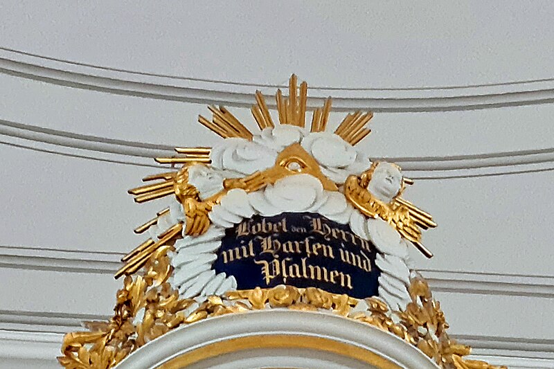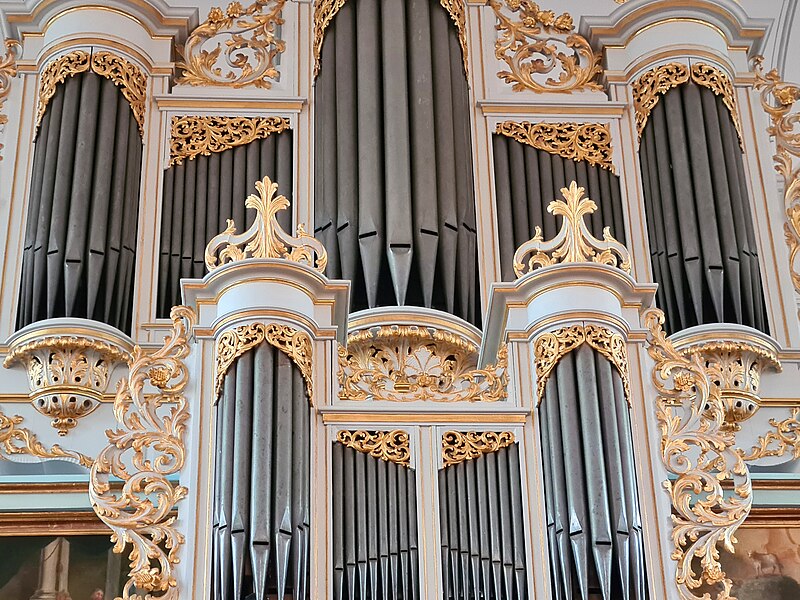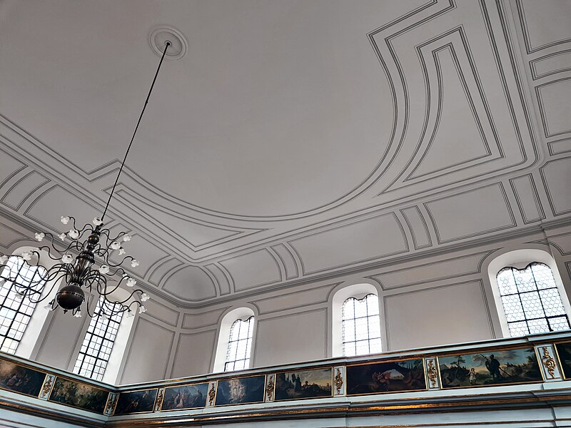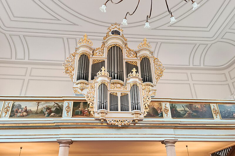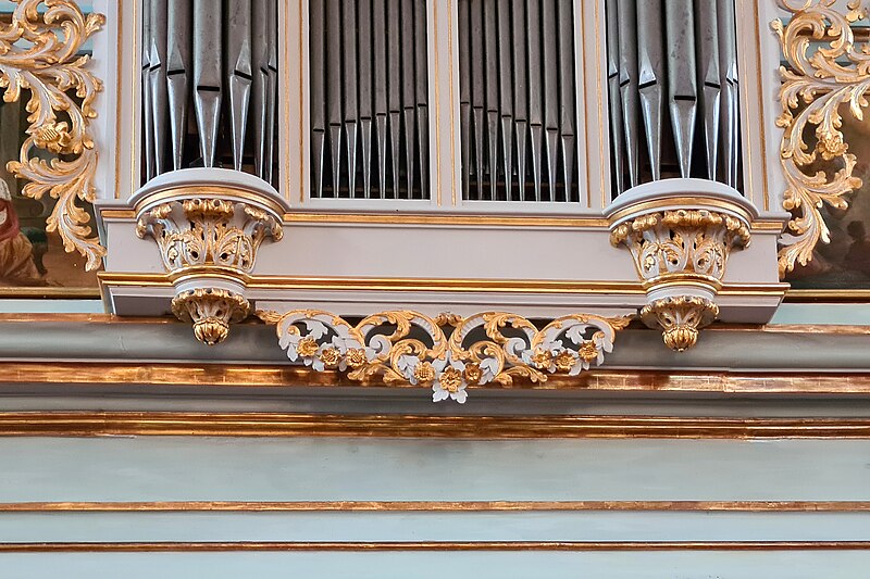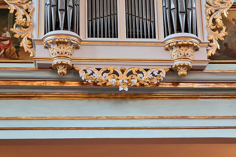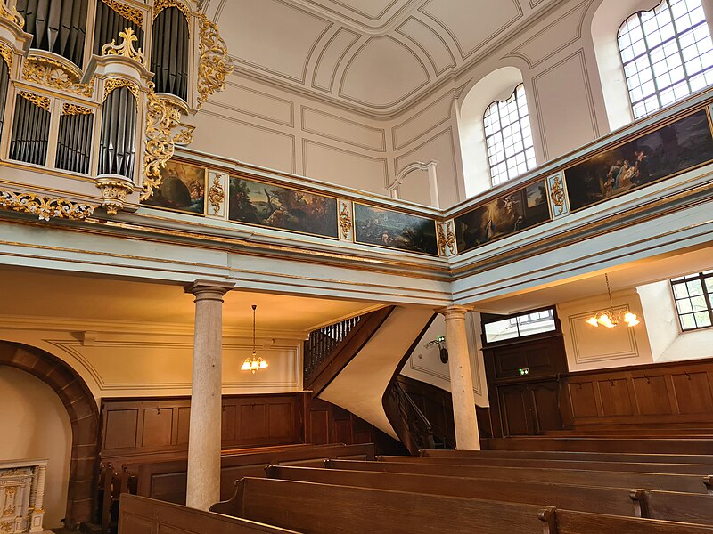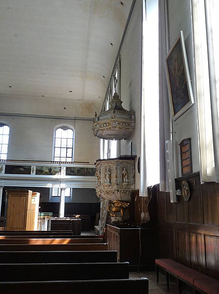 Le garde-corps des tribunes est orné de 23 toiles oblongues livrées en 1767 par Pierre-Joseph Noël et formant un cycle biblique : quatorze épisodes de l’Ancien Testament sur les retours est et ouest et neuf scènes du Nouveau Testament sur le côté nord face à la chaire, comprenant notamment l’Annonciation, la naissance et la crucifixion du Christ, ainsi que des épisodes anciens comme la chute d’Adam et Ève, l’arche de Noé ou Daniel dans la fosse aux lions. La teinte bleu-vert des garde-corps et les décors du plafond ont été restitués lors des travaux achevés en 2014.