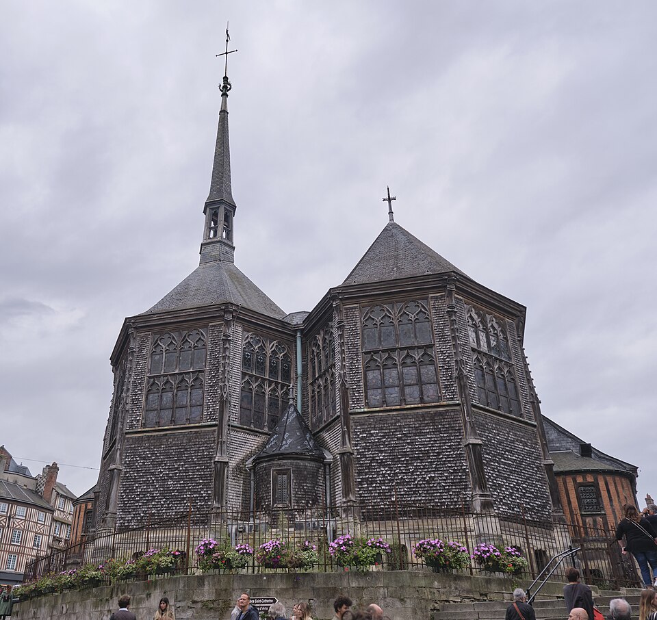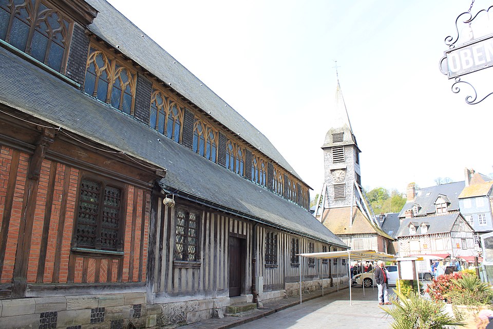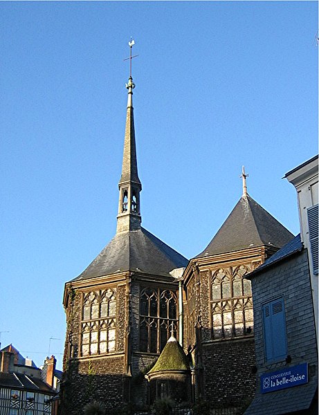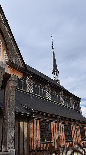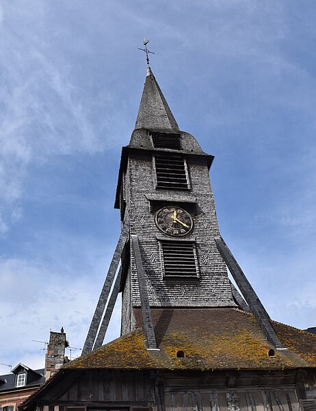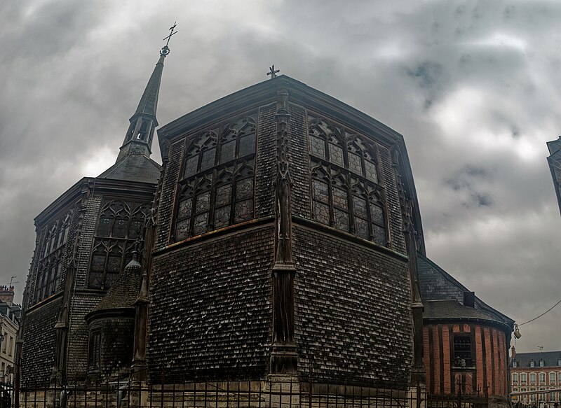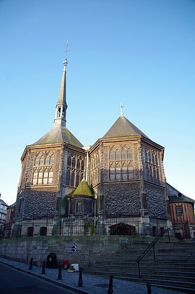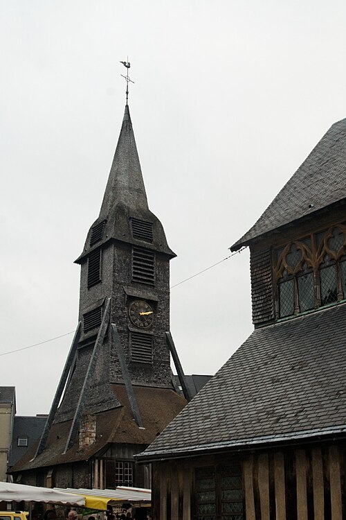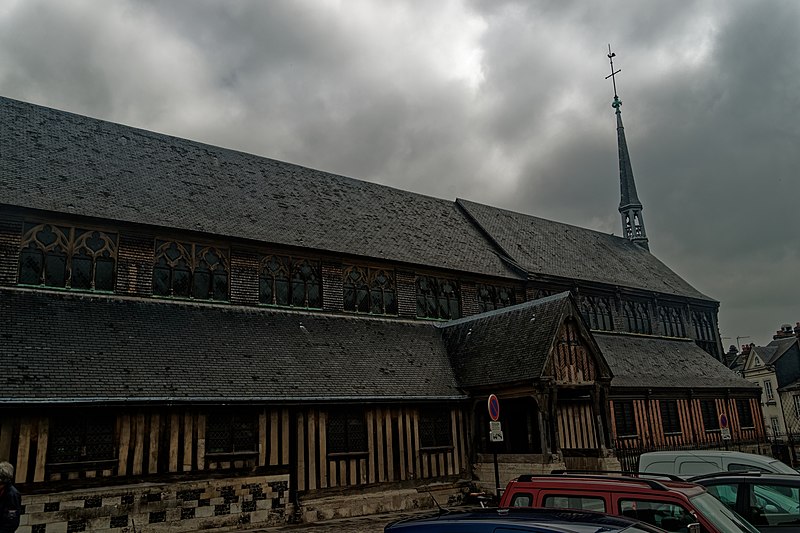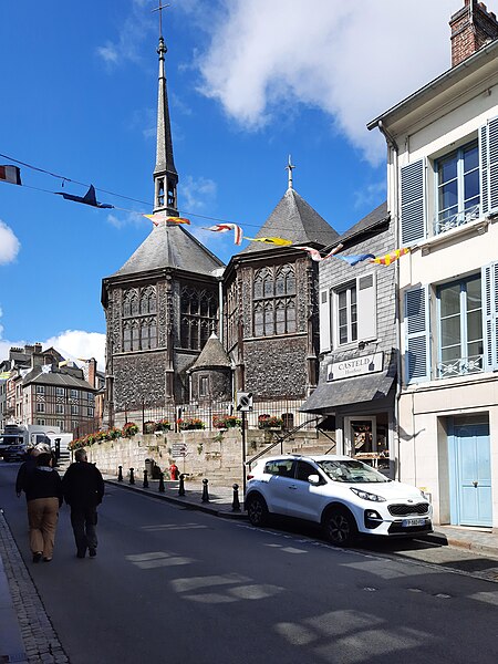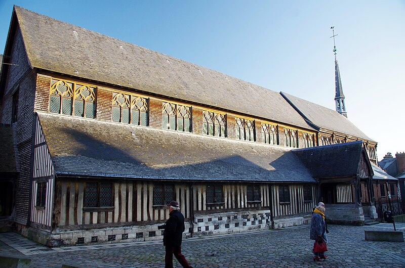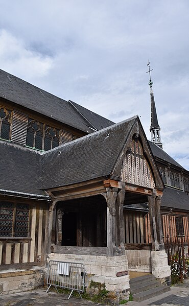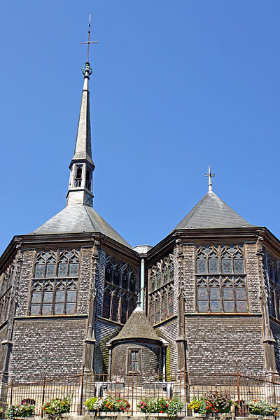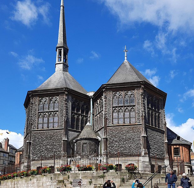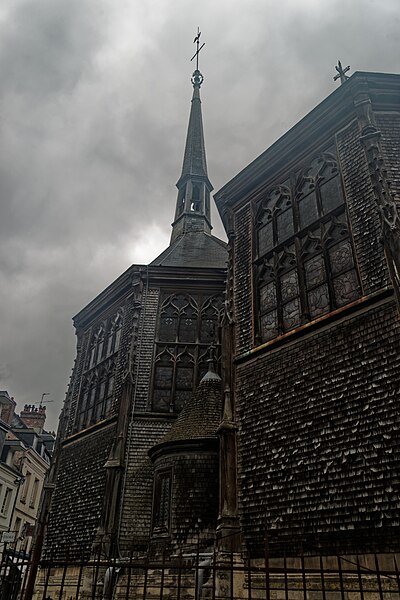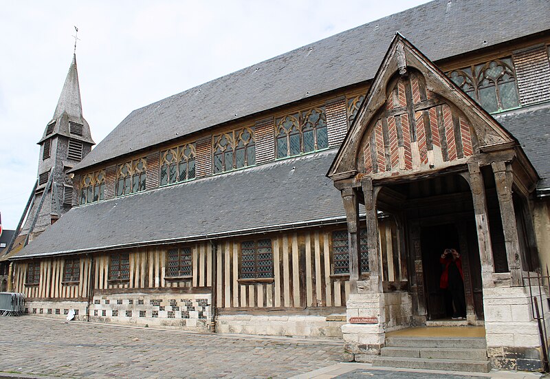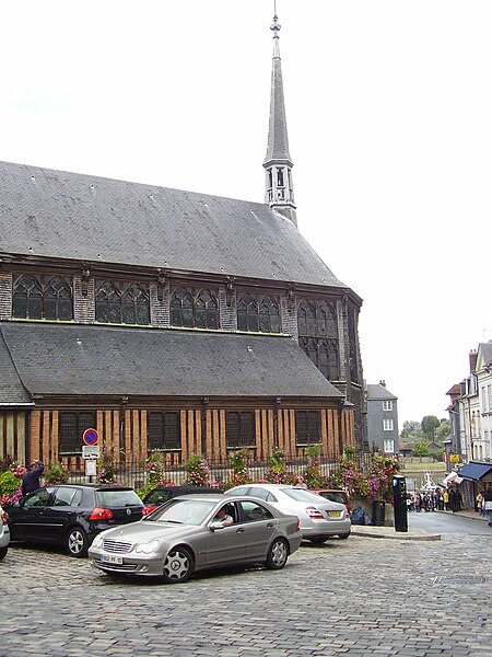 L'église Sainte-Catherine, à Honfleur dans le Calvados, est une église catholique remarquable par sa construction essentiellement en bois, particularité très rare en France. Elle se situe près du Vieux Bassin, juste derrière le quai Sainte-Catherine. Elle est dédiée à sainte Catherine d'Alexandrie, représentée tenant une roue et une épée dans une sculpture en bois placée au‑dessus du porche du clocher séparé des deux nefs. La nef gauche constitue la partie la plus ancienne, datée de la seconde moitié du XVe siècle et bâtie après la guerre de Cent Ans sur le modèle d'une halle de marché. Des éléments empruntés à la construction navale ont été employés, donnant à cette nef l'apparence d'une coque de bateau renversée. Le clocher, élevé à distance de la nef pour limiter les risques d'incendie, attire la foudre en raison de son élévation et de sa position à flanc de colline ; il abrite également une demeure. Au XVIe siècle, la nef droite a été ajoutée ; sa voûte en bois, conforme aux voûtes des modestes églises gothiques, présente une forme plus arrondie et une charpente distincte de la structure navale. Les deux nefs ont été allongées de deux travées et sont encadrées par des bas‑côtés de même longueur, également voûtés en bois. Les « maîtres de hache » des chantiers navals locaux ont réalisé cet ensemble sans recours à la scie, selon une technique ancienne évoquée par des représentations historiques. Les poutres des piliers et des bas‑côtés montrent des longueurs inégales faute de troncs de chêne suffisamment longs ; certaines assises sont en pierre, d'autres en sont dépourvues. Les travées du chœur, reprises au XIXe siècle, sont d'une qualité assez médiocre et leur toiture a été surélevée par rapport aux parties anciennes. L'édifice est partiellement recouvert de bardeaux de châtaignier appelés essentes, formant un essentage. Le porche néo‑normand, construit au début du XXe siècle sur le modèle des porches ruraux de Normandie, remplace un portail monumental néo‑classique du siècle précédent, représenté sur certaines toiles de Jongkind et de Boudin. Le portail sud est de style Renaissance. L'église conserve un orgue classique provenant de la paroisse Saint‑Vincent de Rouen et un balcon Renaissance orné de personnages musiciens. Des vitraux du XIXe siècle décorent les fenêtres orientées vers le chœur, et un Portement de Croix d'Erasmus Quellinus II, de 4,30 m sur 4,30 m, est exposé à l'ouest du chœur. L'édifice, dépourvu de transept, ne comporte pas de chapelles matérialisées dans les bas‑côtés, qui sont uniquement ponctués de statues récentes représentant des saints locaux tels que Marcouf et Thérèse de Lisieux. L'ensemble a été classé au titre des monuments historiques en 1875.