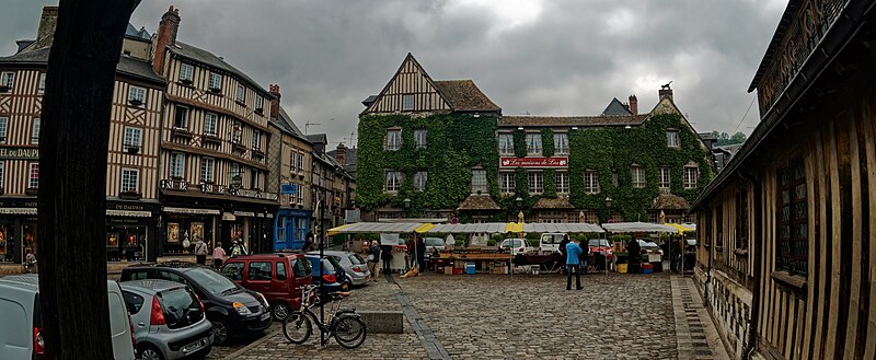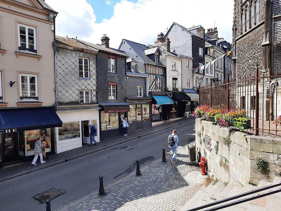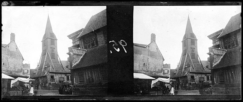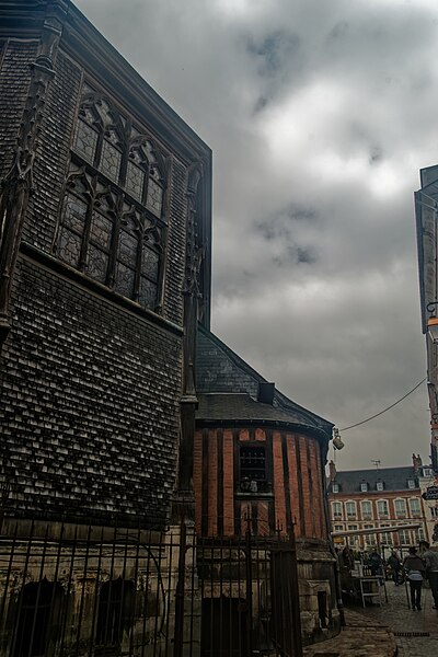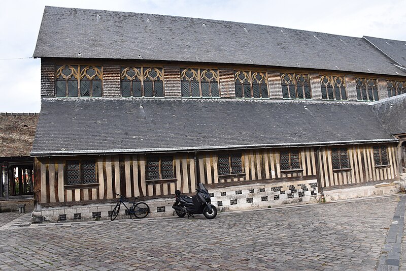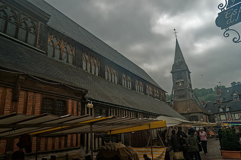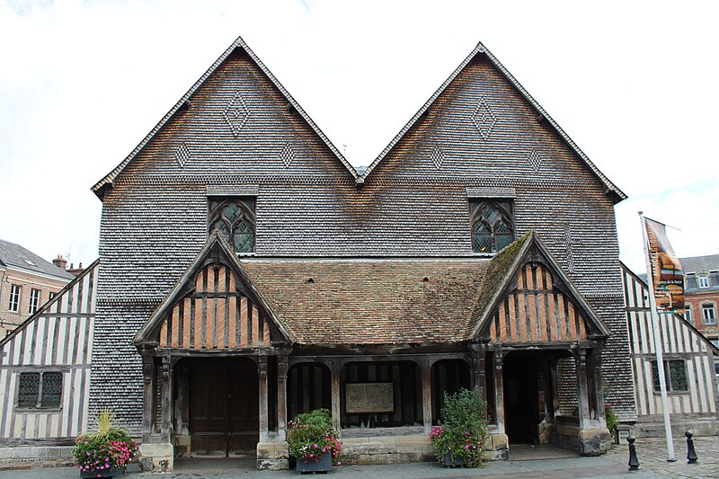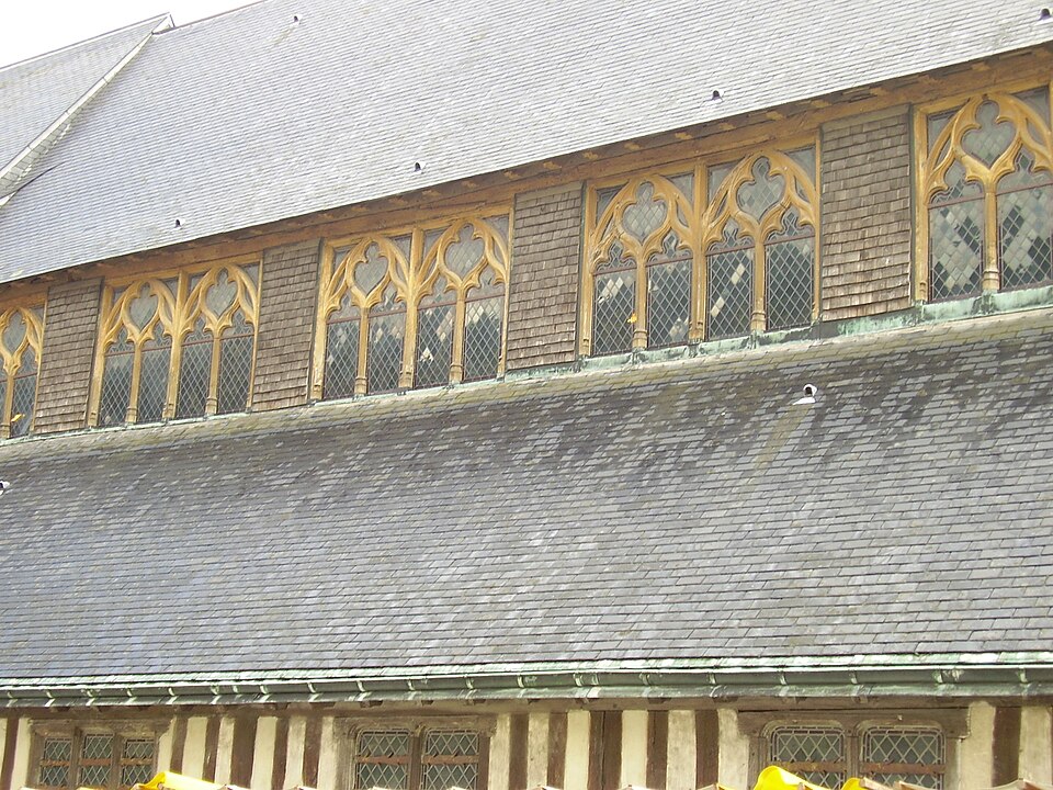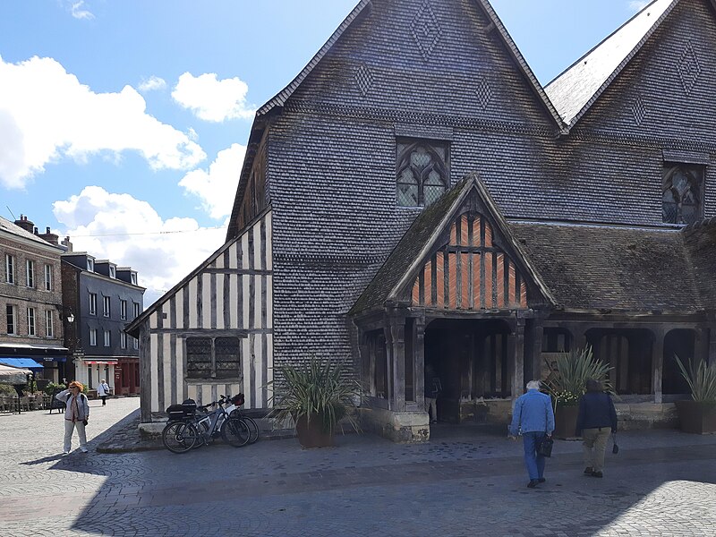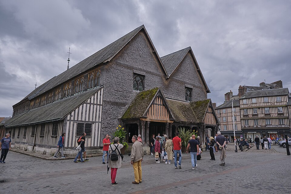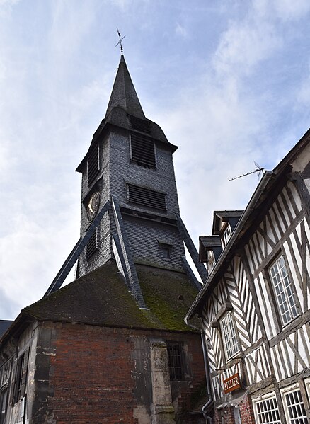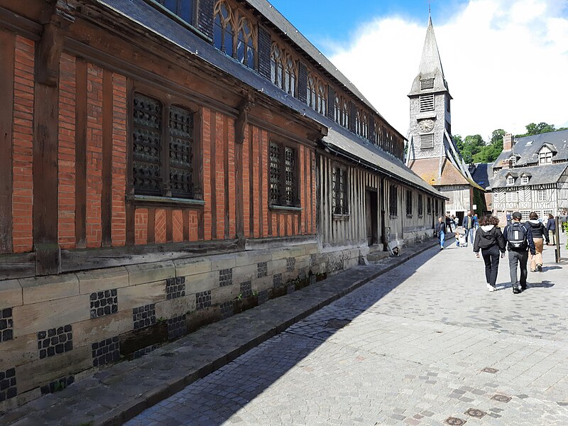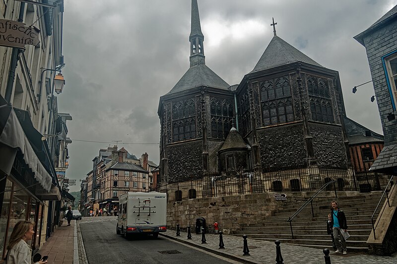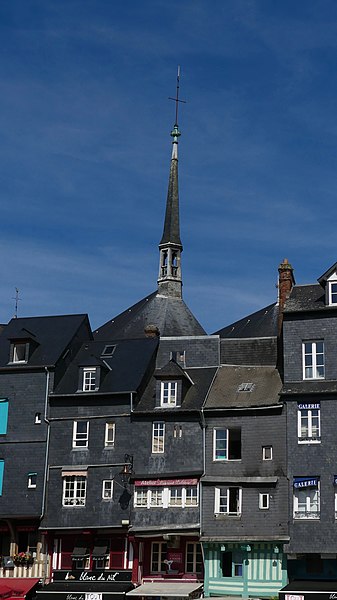 L'église Sainte-Catherine, à Honfleur dans le Calvados, est une église catholique remarquable par sa construction essentiellement en bois, particularité très rare en France. Elle se situe près du Vieux Bassin, juste derrière le quai Sainte-Catherine. Elle est dédiée à sainte Catherine d'Alexandrie, représentée tenant une roue et une épée dans une sculpture en bois placée au‑dessus du porche du clocher séparé des deux nefs. La nef gauche constitue la partie la plus ancienne, datée de la seconde moitié du XVe siècle et bâtie après la guerre de Cent Ans sur le modèle d'une halle de marché. Des éléments empruntés à la construction navale ont été employés, donnant à cette nef l'apparence d'une coque de bateau renversée. Le clocher, élevé à distance de la nef pour limiter les risques d'incendie, attire la foudre en raison de son élévation et de sa position à flanc de colline ; il abrite également une demeure. Au XVIe siècle, la nef droite a été ajoutée ; sa voûte en bois, conforme aux voûtes des modestes églises gothiques, présente une forme plus arrondie et une charpente distincte de la structure navale. Les deux nefs ont été allongées de deux travées et sont encadrées par des bas‑côtés de même longueur, également voûtés en bois. Les « maîtres de hache » des chantiers navals locaux ont réalisé cet ensemble sans recours à la scie, selon une technique ancienne évoquée par des représentations historiques. Les poutres des piliers et des bas‑côtés montrent des longueurs inégales faute de troncs de chêne suffisamment longs ; certaines assises sont en pierre, d'autres en sont dépourvues. Les travées du chœur, reprises au XIXe siècle, sont d'une qualité assez médiocre et leur toiture a été surélevée par rapport aux parties anciennes. L'édifice est partiellement recouvert de bardeaux de châtaignier appelés essentes, formant un essentage. Le porche néo‑normand, construit au début du XXe siècle sur le modèle des porches ruraux de Normandie, remplace un portail monumental néo‑classique du siècle précédent, représenté sur certaines toiles de Jongkind et de Boudin. Le portail sud est de style Renaissance. L'église conserve un orgue classique provenant de la paroisse Saint‑Vincent de Rouen et un balcon Renaissance orné de personnages musiciens. Des vitraux du XIXe siècle décorent les fenêtres orientées vers le chœur, et un Portement de Croix d'Erasmus Quellinus II, de 4,30 m sur 4,30 m, est exposé à l'ouest du chœur. L'édifice, dépourvu de transept, ne comporte pas de chapelles matérialisées dans les bas‑côtés, qui sont uniquement ponctués de statues récentes représentant des saints locaux tels que Marcouf et Thérèse de Lisieux. L'ensemble a été classé au titre des monuments historiques en 1875.