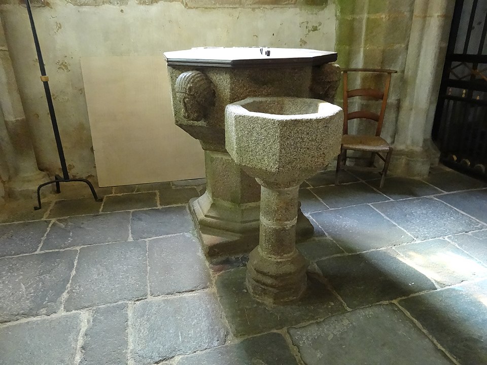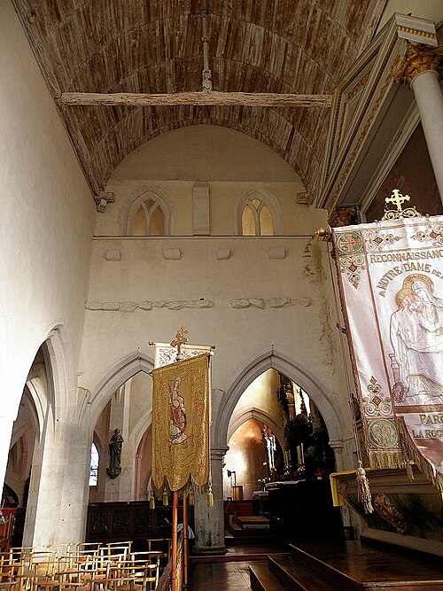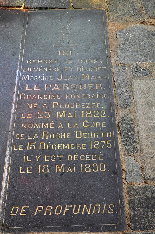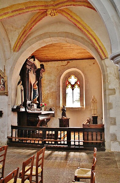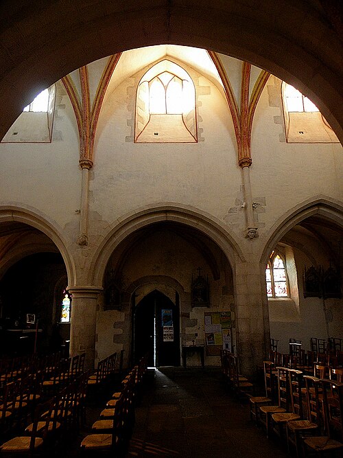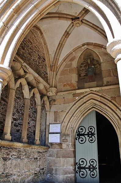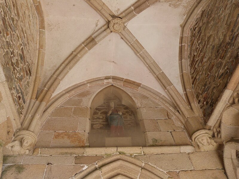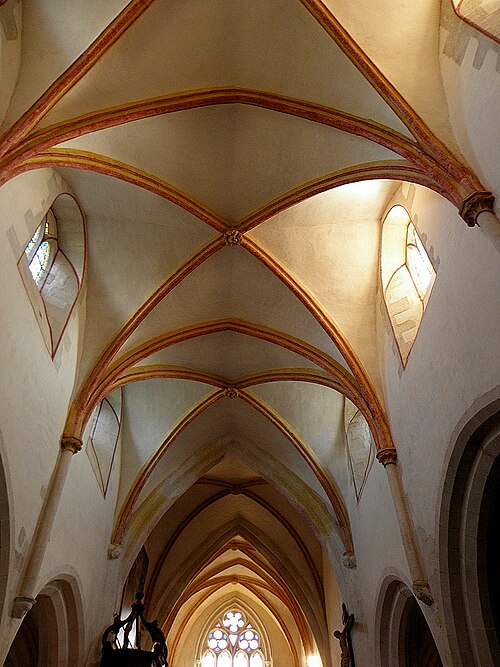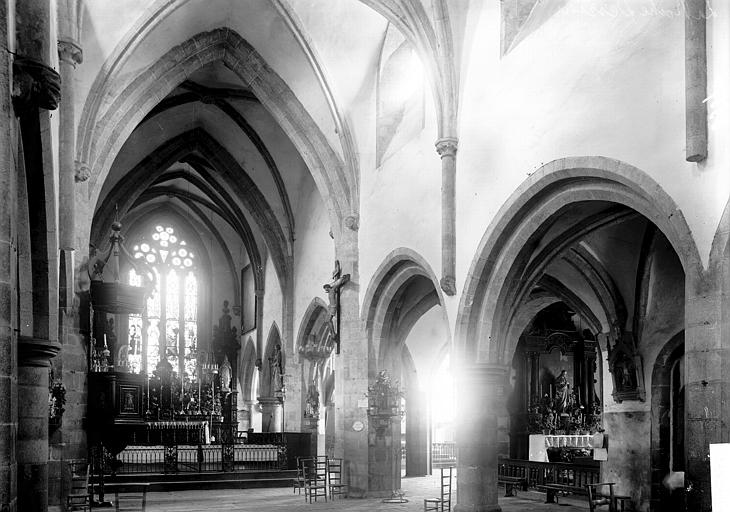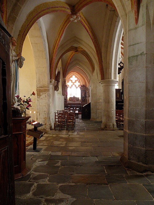 L'église Sainte-Catherine, église catholique de La Roche-Derrien (Côtes-d'Armor, France), illustre la transition locale du roman au gothique. Sa construction commence à la fin du XIIIe siècle et l'édifice conserve plusieurs éléments de cette phase, notamment la chapelle des fonts, la première travée de la nef et des vestiges du porche ouest. Après la bataille de 1347, l'église est très endommagée puis partiellement reconstruite, peut-être par le même maître d'œuvre que celui de la cathédrale de Tréguier, comme le suggèrent des éléments communs : décor de chapiteaux, frise sous la corniche du clocher, voûtes très surbaissées et profils des arcs d'ogives. En 1376, Rolland de Kersaliou et Meance Toupin, seigneur et dame de Kersaliou, font édifier au sud du chœur une grande chapelle ; à la même époque une petite chapelle est aménagée dans le bas-côté nord, avec enfeu et tombe. Une bulle pontificale de 1389 mentionne que l'église nécessite d'importantes réparations ; la partie centrale de la façade ouest, la tour du clocher et le porche sud semblent relever de cette campagne. Après la destruction du château et des remparts par Jean IV en 1394, le connétable Olivier de Clisson fait fortifier l'église, transformations dont certaines sont encore visibles aujourd'hui. Ces aménagements comprennent la maçonnerie renforcée à l'angle nord-est avec un escalier intégré et percé de meurtrières, ainsi que l'agrandissement d'une chapelle à l'angle nord-ouest pour en faire un corps de garde ou un magasin. En 1793 la flèche est détruite par la foudre, les verrières sont brisées et la maçonnerie éprouvée ; l'église fait l'objet d'une restauration totale en 1820, au cours de laquelle la flèche est rebâtie et une nouvelle sacristie édifiée contre le chevet. Le clocher est de nouveau frappé par la foudre en 1833 puis réparé. Une restauration menée en 1890 entraîne la refonte complète du pignon du porche sud, et la chapelle nord du Rosaire est reconstruite en 1894 sur ses anciennes fondations. En 1927, la maîtresse-vitre de la chapelle sud reçoit un vitrail représentant la bataille de La Roche-Derrien. Au revers de la façade occidentale, préservés derrière l'orgue installé au XIXe siècle, subsistent des vestiges de polychromie du XIVe siècle. L'édifice a été classé au titre des monuments historiques en 1913. On peut également se reporter aux fonts baptismaux de La Roche-Derrien, aux peintures murales locales et aux listes départementales des monuments historiques et des églises des Côtes-d'Armor pour compléter la documentation sur ce patrimoine.