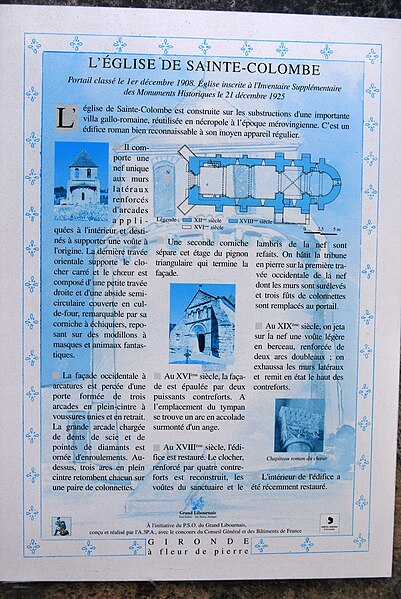 L'église Sainte-Colombe est un édifice catholique romane du XIIe siècle situé à Sainte-Colombe, en Gironde. Elle se trouve dans le bourg, le long de la route départementale D17E2, entre Saint-Genès-de-Castillon au nord et Saint-Magne-de-Castillon au sud. Construite sur les substructions d'une importante villa gallo-romaine réutilisée comme nécropole à l'époque mérovingienne, l'église présente une nef unique dont les murs latéraux sont renforcés par des arcades appliquées. La dernière travée orientale, correspondant à l'avant-choeur voûté en croisée d'ogives et pourvu de chapiteaux très archaïques, porte le clocher carré. Le chœur se compose d'une petite travée droite et d'une abside semi-circulaire couverte en cul-de-four ; la corniche du chevet repose sur des modillons sculptés de marques, d'animaux fantastiques et de personnages. Une mosaïque antique s'étend sous le sol à l'entrée de l'église. La façade occidentale, articulée par des arcatures, est percée d'un portail formé de trois arcades en plein cintre aux voussures unies et en retrait ; la large arcade décorée de dents de scie et de pointes de diamant est ornée de rouleaux. Au-dessus, trois arcs en plein cintre retombent chacun sur une paire de colonnettes, et une seconde corniche sépare cet étage du pignon triangulaire. L'édifice a connu plusieurs campagnes de restauration : au XVIIe siècle la façade a été épaulée de deux contreforts, au XVIIIe siècle l'édifice a fait l'objet de réparations, et au XIXe siècle une voûte légère en berceau a été posée sur la nef tandis que les contreforts ont été remis en état. Le portail a été classé au titre des monuments historiques par arrêté du 1er décembre 1908, et le reste de l'église a été inscrit par arrêté du 21 décembre 1925.
