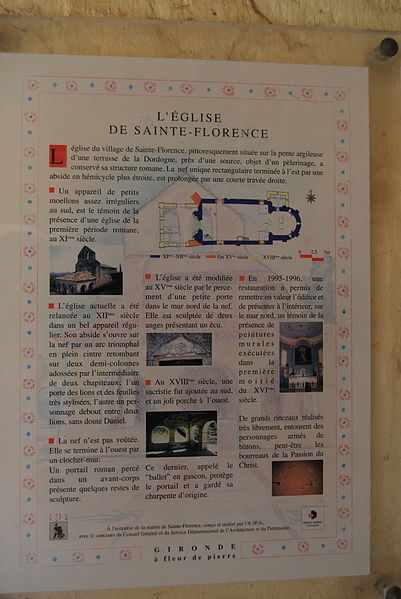 L'église Sainte-Florence, de style roman, se situe dans le village éponyme de la Gironde, le long de la D18 entre Saint-Jean-de-Blaignac et Saint-Pey-de-Castets. Petit édifice à nef unique, elle est implantée près d'une source qui a fait l'objet d'un pèlerinage. La nef rectangulaire, non voûtée, se termine à l'est par une abside en hémicycle, plus étroite, prolongée par une courte travée droite. Des vestiges témoignent de l'existence d'une église antérieure au XIe siècle, tandis que l'édifice actuel date du XIIe siècle. L'abside s'ouvre sur la nef par un arc triomphal en plein cintre reposant sur deux demi-colonnes engagées, dont les chapiteaux sont sculptés : l'un représente des lions et des feuilles, l'autre un personnage debout flanqué de deux lions. À l'ouest, l'édifice se termine par un clocher-mur ; le portail roman, percé dans un avant-corps, conserve quelques restes de sculpture. Au XVe siècle, une porte percée dans le mur nord de la nef a été sculptée de deux anges présentant un écu. Au XVIIIe siècle, une sacristie a été ajoutée au sud en 1727 et un porche a été construit à l'ouest ; ce porche protège le portail et a conservé sa charpente d'origine. À l'intérieur, le mur sud porte des fragments de décor peint de la fin de l'époque gothique. L'édifice a été inscrit au titre des monuments historiques par arrêté du 16 avril 2002.