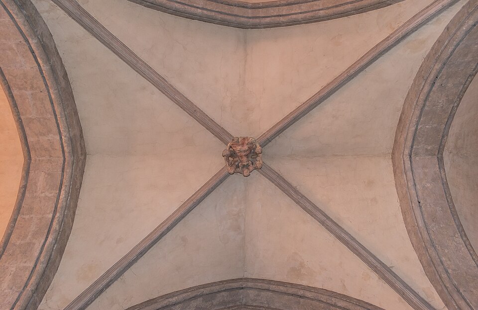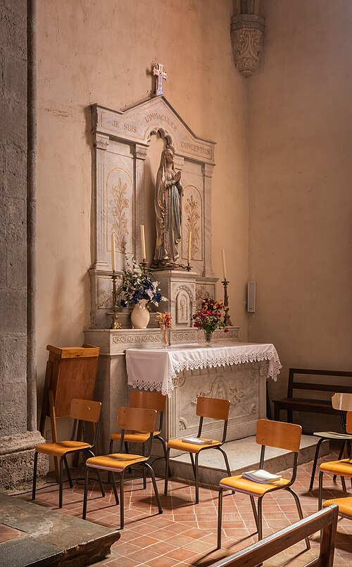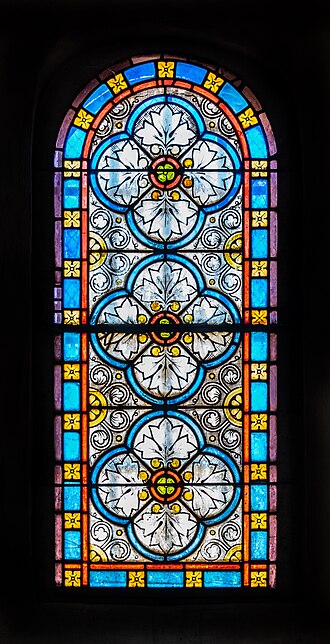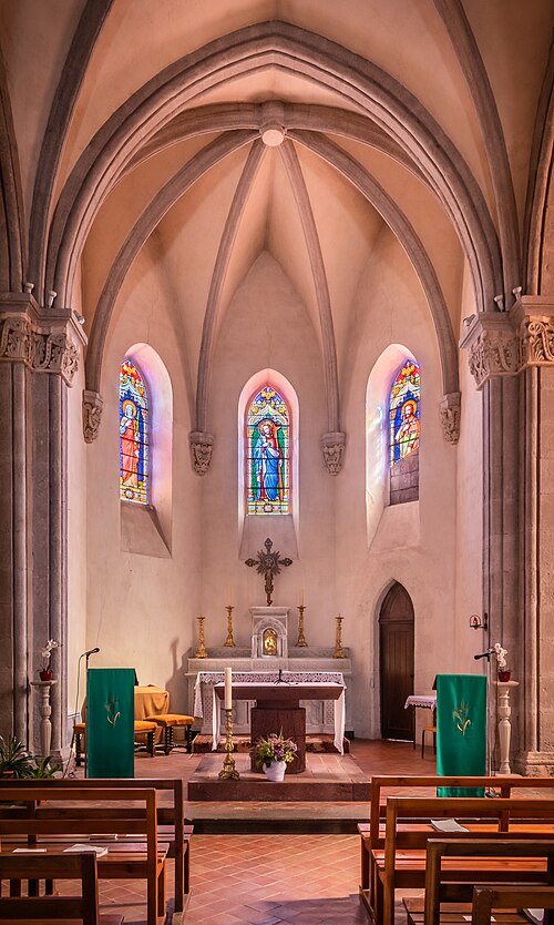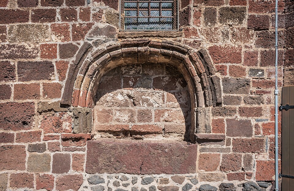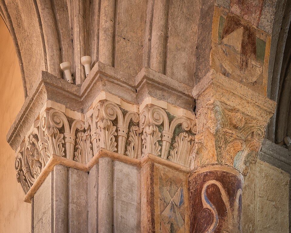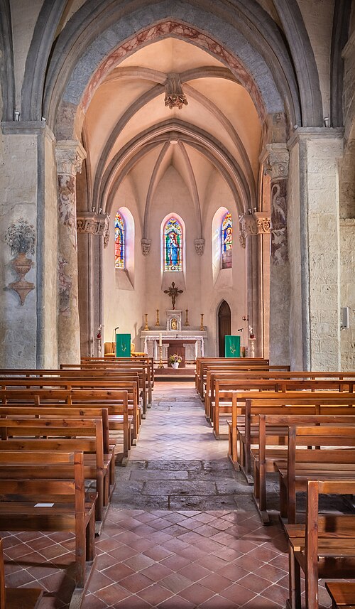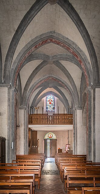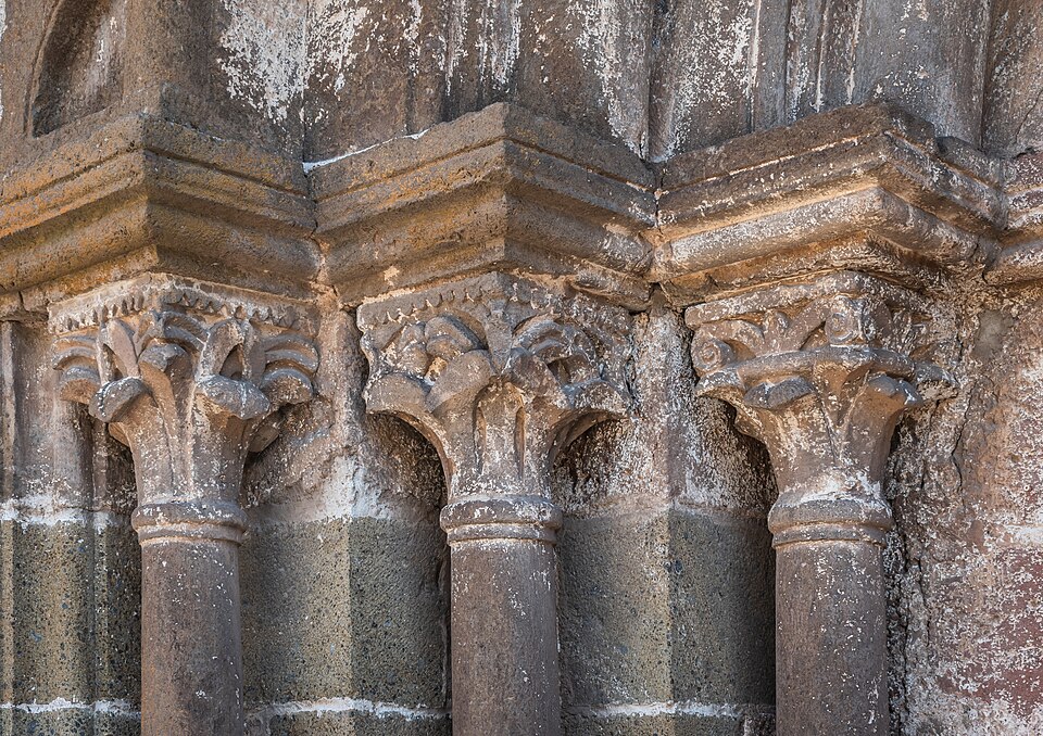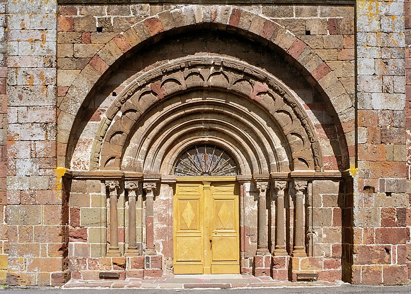Ce type d'arc à voussure polylobée est une variante héritée de l'architecture omeyyade de Cordoue, diffusée dans l'architecture romane française par l'influence des pèlerins le long des routes de Saint-Jacques‑de‑Compostelle, et en particulier le long de la via Podiensis qui passe par Bains. Un arc très semblable se trouve sur la façade de l'église Saint‑Blaise de Dore‑l'Église, non loin de la via Podiensis. La partie haute de la façade méridionale est ornée d'une arcature composée de trois arcs en plein cintre reposant sur de fines colonnettes; deux arcades sont aveugles et la centrale est percée d'une fenêtre légèrement remaniée.