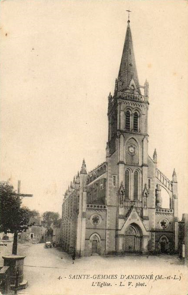 L'église paroissiale de Sainte-Gemmes-d'Andigné, désignée Sainte-Marguerite, est située en Maine-et-Loire ; elle a été édifiée à partir de 1865 par l'architecte Alfred Tessier sur l'emplacement d'une première église du XIIe siècle et est dédiée à sainte Gemmes. Conçue dans le goût néo-gothique et inspirée de l'art ogival du début du XIIIe siècle, elle présente une silhouette basilicale dominée par un clocher-porche surmonté d'une flèche octogonale en pierre. L'intérieur reprend les principes de l'architecture gothique rayonnante : la nef est articulée en travées et flanquée de chapelles, tandis que le chœur se termine par une abside à pans. L'édifice se distingue par son dallage à motifs, ses portes en menuiserie ornées de ferrures ouvragées et par des arcs-boutants qui épaulent les murs extérieurs. Le décor intérieur est varié : clés de voûte polychromes, enduits simulant des joints, peintures dans les chapelles et mobilier de style néo-gothique composent un ensemble homogène. Paul Audfray a réalisé plusieurs œuvres pour l'église, notamment des médaillons et trois grandes toiles marouflées datées des années 1923-1928, qui forment une composition commémorative en hommage aux victimes de la Première Guerre mondiale. Les vitraux originaux ont été restaurés dans les années 1986-1987. La petite église médiévale, agrandie à la fin du XVIIIe siècle par une chapelle et ayant reçu une relique en 1784, fut démolie au cours du dernier tiers du XIXe siècle pour laisser place à la construction actuelle ; la première pierre du nouvel édifice fut posée et bénie le 19 avril 1865. Un accident s'y produisit dans la nuit du 27 au 28 janvier 1881 lorsque l'un des clochetons s'effondra à travers la toiture, causant la mort de trois femmes et blessant plusieurs personnes. Menacée de démolition en 2013, l'église a fait l'objet d'une procédure de protection initiée début 2013, laquelle a abouti à son inscription au titre des monuments historiques le 6 février 2014. L'édifice conserve en outre un maître-autel, des stalles et divers éléments de mobilier néo-gothique qui témoignent de la ferveur et du goût décoratif de la période.