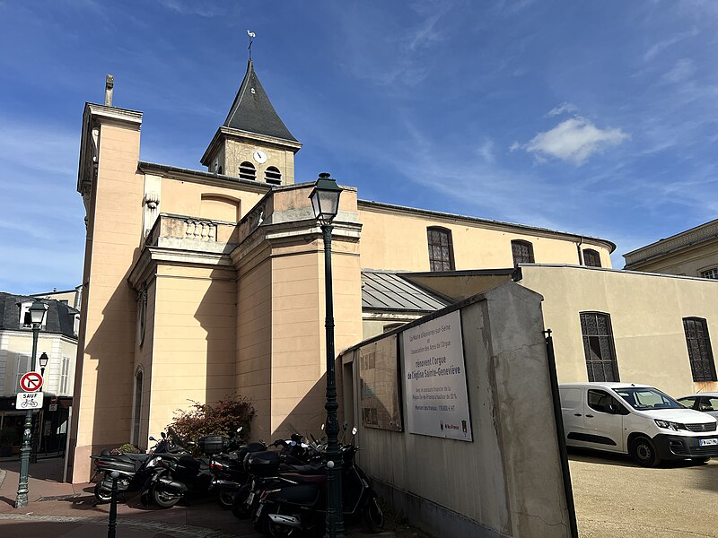 L'église Sainte‑Geneviève, ancienne église paroissiale d'Asnières‑sur‑Seine (Hauts‑de‑Seine, Île‑de‑France), se situe à la jonction de la rue de l'Église et de la rue du Cardinal Verdier, contre l'ancien château d'Asnières, à proximité de la rue Pierre‑Brossolette. Elle est inscrite au titre des monuments historiques depuis le 6 avril 1929. Une église dédiée à sainte Geneviève est attestée depuis plusieurs siècles : un édifice est mentionné dès 1158 dans une bulle du pape Adrien IV et une consécration est documentée en 1541 par l'évêque de Sébaste Jean Guillaume. La tradition évoque également une puissante famille de Geneviève, originaire de Nanterre, dont les pâturages s'étendaient sur les emplacements actuels de Gennevilliers et d'Asnières. Le bâtiment actuel a été reconstruit entre 1703 et 1711 à l'emplacement d'une église du XVIe siècle ; il comprenait à l'origine un chœur, une nef de trois travées et deux collatéraux. La nouvelle église fut consacrée le 6 septembre 1711 par Jean‑Baptiste‑Louis‑Gaston de Noailles et les reliques de l'autel furent transférées de l'abbaye de Saint‑Denis. Au début du XVIIIe siècle, l'abbé Jacques Jubé, de tendance janséniste, fut curé et introduisit des réformes liturgiques locales. En 1730 on enterra dans l'église les entrailles de la duchesse de Brunswick‑Lunebourg, et l'édifice conservait encore quelques fragments de pierres tombales du XVe siècle. De 1813 à 1815 une importante campagne de restauration a notamment entraîné la reconstruction de la voûte. En 1810, les corps enfouis autour de l'église furent transférés sur un terrain de 600 mètres carrés rue du Ménil, agrandi en 1841 et formant le cimetière dit « ancien » d'Asnières. Le clocher fut reconstruit par l'architecte Lequeux en 1867, et l'empereur Napoléon III et l'impératrice offrirent deux cloches en 1868 ; la guerre de 1870 endommagea le clocher et deux nouvelles cloches furent installées en 1872. Sous la direction du même architecte, l'ensemble de l'édifice fit l'objet d'importantes restaurations à partir de 1872. De 1929 à 1932 l'architecte Bourdeau prolongea la nef d'une travée, construisit la façade occidentale puis ajouta deux bas‑côtés. Aujourd'hui l'église présente le plan et les modifications issus de ces différentes campagnes de construction et de restauration. La messe dominicale y est célébrée actuellement le dimanche à 8 h 30 et 10 h 30, ainsi que le samedi à 18 h 30 pour la messe anticipée. Pour approfondir, des notices et ressources bibliographiques et en ligne (Mérimée, Structurae, Clochers de France, GCatholic, l'Observatoire du patrimoine religieux, MusicBrainz) ainsi que la liste des monuments historiques des Hauts‑de‑Seine proposent des compléments d'information.
