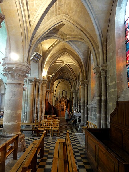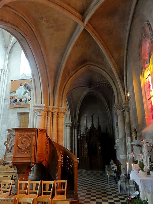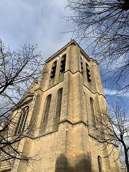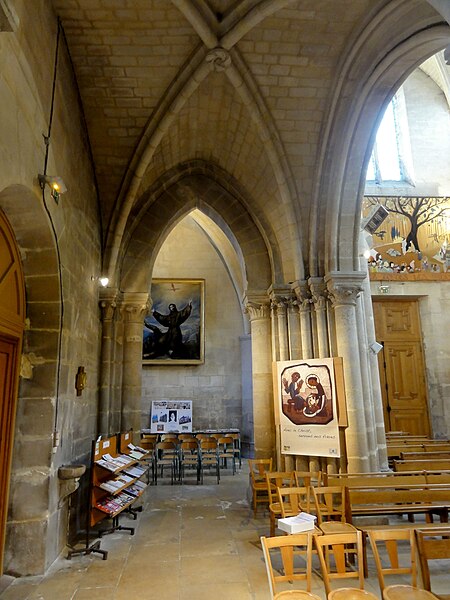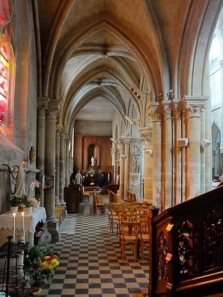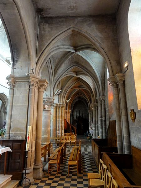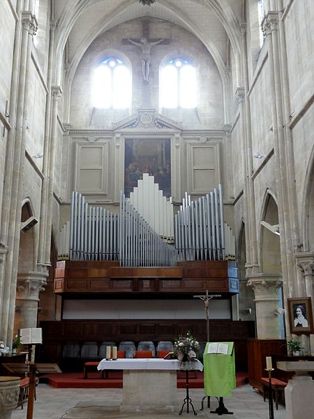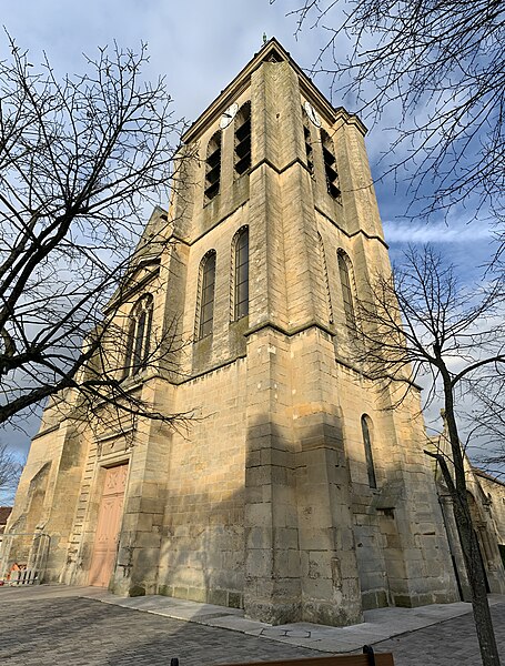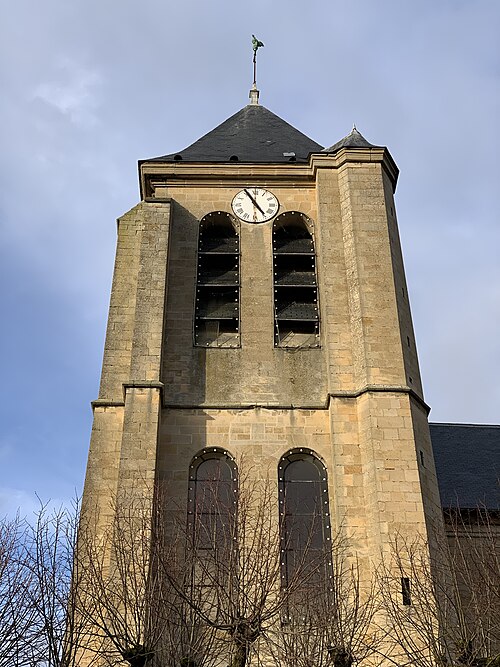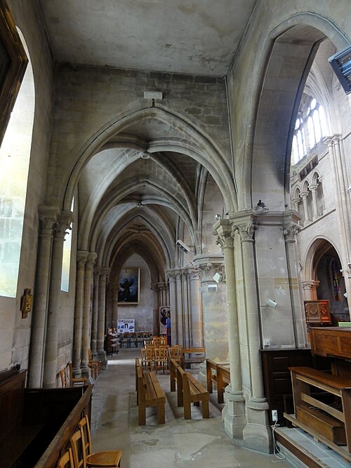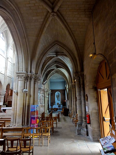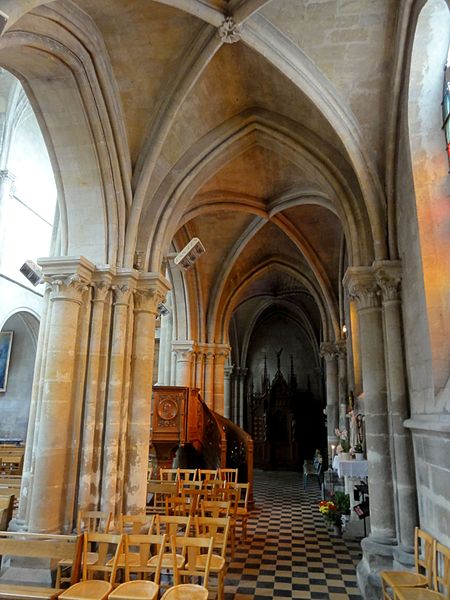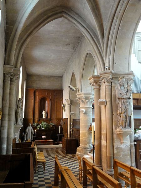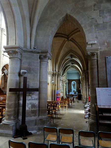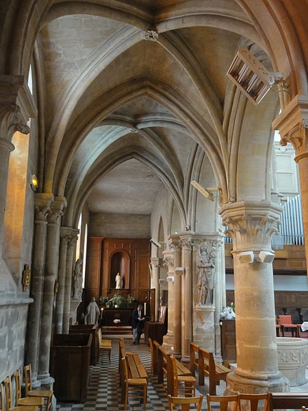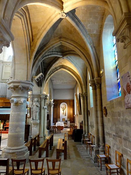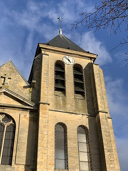 L'église Sainte-Geneviève de Gouvieux (Oise) est un édifice très composite dont les parties les plus anciennes remontent autour de 1200. Derrière une façade de style classique et des murs en grande partie remaniés aux XVIIIe et XIXe siècles se devine un noyau de gothique primitif d'environ huit cents ans. L'implantation sur un sol instable et des fondations insuffisantes ont entraîné de nombreux désordres, reprises et consolidations au cours des siècles. À l'intérieur, les remaniements sont surtout visibles au niveau des étages des fenêtres hautes et dans les dernières travées des bas-côtés, où les voûtes anciennes ont disparu. Les voûtes d'ogives d'origine ont été remplacées en 1861 par des fausses voûtes en bois et plâtre, selon les plans de l'architecte Antoine Drin et grâce au financement d'Antoine Amic. L'édifice résulte de deux campagnes de construction rapprochées : les quatre travées orientales datent de la fin du XIIe siècle et présentent l'influence de Notre‑Dame de Paris et du chœur de Saint‑Leu‑d'Esserent, tandis que les deux travées occidentales, attribuées aux années 1220, relèvent du courant inspiré par Soissons et Chartres. Des reconstructions importantes aux XVIIe et XVIIIe siècles ont rebâti la façade occidentale, le clocher, le mur du bas-côté sud et le chevet, effaçant en grande partie le caractère primitif sur la face sud. Malgré ces transformations, l'église conserve des éléments architecturaux remarquables — piliers, colonnettes, chapiteaux et alternances de supports rappelant les grands chantiers de l'Île‑de‑France — et demeure représentative de l'architecture religieuse régionale. Le plan est simple et rectangulaire : une nef de six travées sans transept, flanquée de bas‑côtés qui comportent une travée supplémentaire, et un chevet plat précédé d'une sacristie. La base du clocher occupe la première travée du bas‑côté sud et le porche donnant sur le portail méridional date de la fin du XIXe siècle. L'église est située au nord du centre de Gouvieux, rue Corbier‑Thiebaut (RD 612), le portail sud s'ouvrant sur une route qui contourne l'édifice ; le chevet donne sur un terrain privé mais une venelle étroite permet d'en faire le tour. La paroisse relève historiquement du diocèse de Beauvais jusqu'au Concordat, dépendait du doyenné de Beaumont et de l'archidiaconé de Clermont, le collateur étant le chapitre de la cathédrale de Senlis, et a sainte Geneviève pour patronne. Les registres paroissiaux remontent au XVIIe siècle et l'histoire détaillée de la paroisse est surtout connue à partir du Concordat de 1801. La vie paroissiale a connu des épisodes marquants : réorganisation de la fabrique et ventes de places au XIXe siècle, transfert du cimetière en 1832, donations et soutiens notables (dont ceux de la baronne James de Rothschild à la fin du XIXe siècle), tensions liées à la loi de séparation en 1905 et une mission paroissiale en 1913. La Première Guerre mondiale a causé la perte de cent trois paroissiens et le monument aux morts a été inauguré en 1921. Au XXe siècle, l'église a été équipée d'électricité en 1922, d'un chauffage modernisé en 1929, gravement endommagée lors des bombardements de 1940 et réparée progressivement dans les années suivantes; la restauration majeure du clocher et des voûtes s'est déroulée entre la fin des années 1980 et 1990 après une inscription aux monuments historiques le 12 avril 1988. Un orgue offert par les Jésuites en 1998 a été restauré jusqu'en 2004 et installé sur le mur du fond du chœur, et une série de vitraux non figuratifs a été posée jusqu'en février 2006 grâce à des dons. Le mobilier comporte trois objets classés au titre des monuments historiques : les fonts baptismaux en pierre calcaire du XIVe siècle, une Vierge à l'Enfant en pierre calcaire du second quart du XIVe siècle et un tableau intitulé "L'Extase de saint François", attribué aujourd'hui à Luca Giordano et offert en 1879. Sont également inscrits des éléments tels que un confessionnal néogothique en chêne (daté de 1852 et offert en 1888) et un tableau représentant sainte Geneviève d'après une gravure de Carle Van Loo; d'autres œuvres et sculptures notables datent du XVIe au XIXe siècle. Des stalles du XVIe siècle sont placées contre le mur du chevet depuis le réaménagement de 1669, mais il n'existe pas de dalles funéraires ou de plaques antérieures à la Révolution. L'ensemble présente un extérieur marqué par une façade classique plaquée sur l'ancienne élévation occidentale, un clocher au profil sobre coiffé d'une pyramide ardoisée et des arcs‑boutants ajoutés au nord pour tenter de contrebuter les poussées, sans réussir à empêcher la dégradation des voûtes. Aujourd'hui l'église reste un lieu de culte actif : la paroisse, toujours indépendante et formant la « paroisse de Thève‑et‑Nonette — paroisse Sainte‑Thérèse de l'Enfant Jésus », célèbre des messes dominicales et plusieurs offices en semaine.