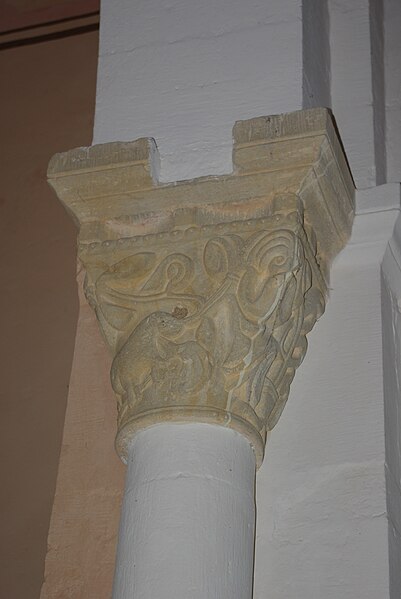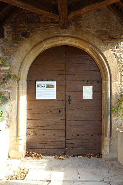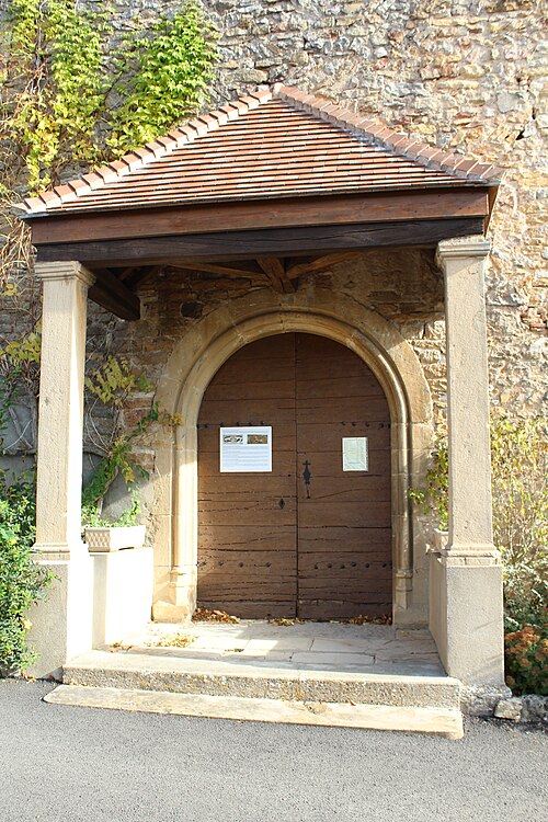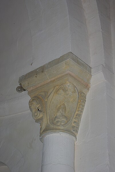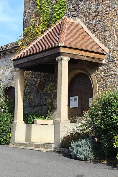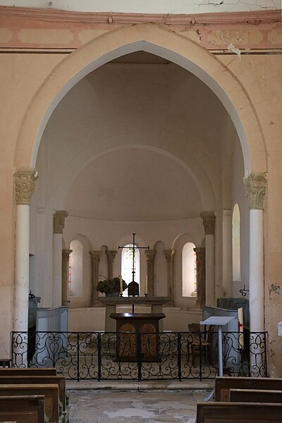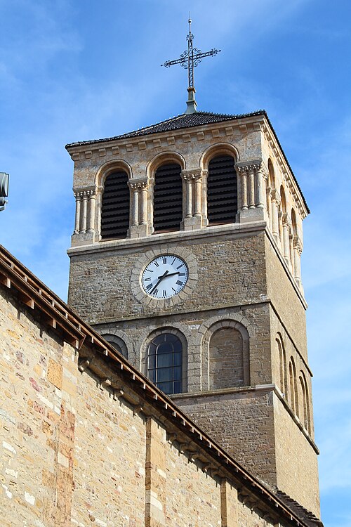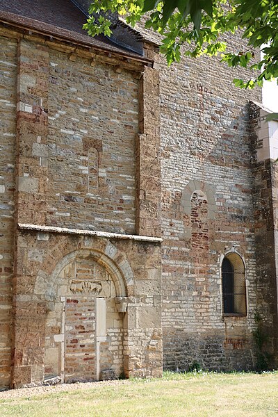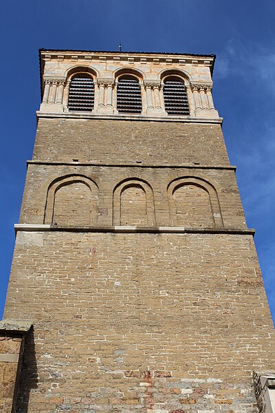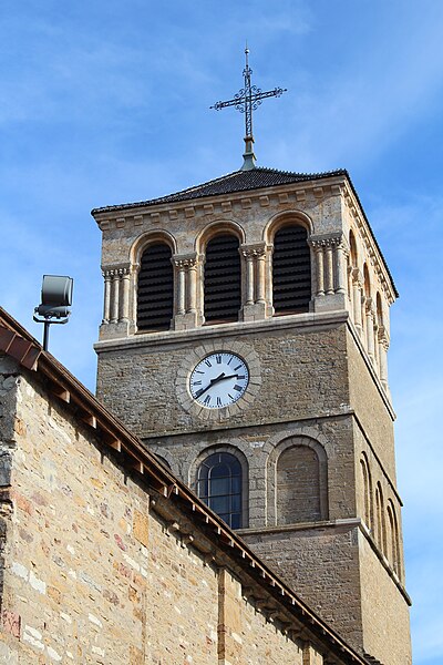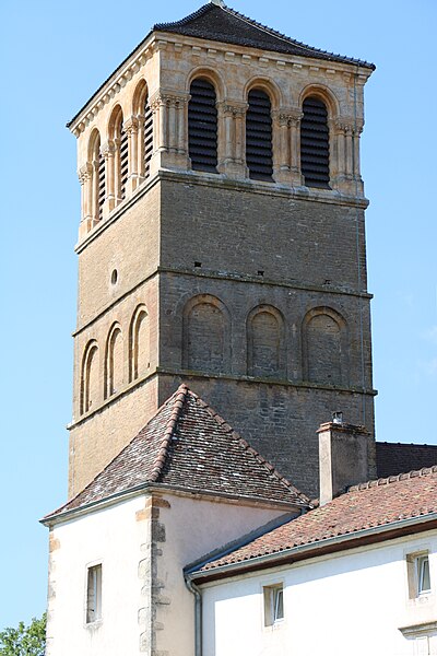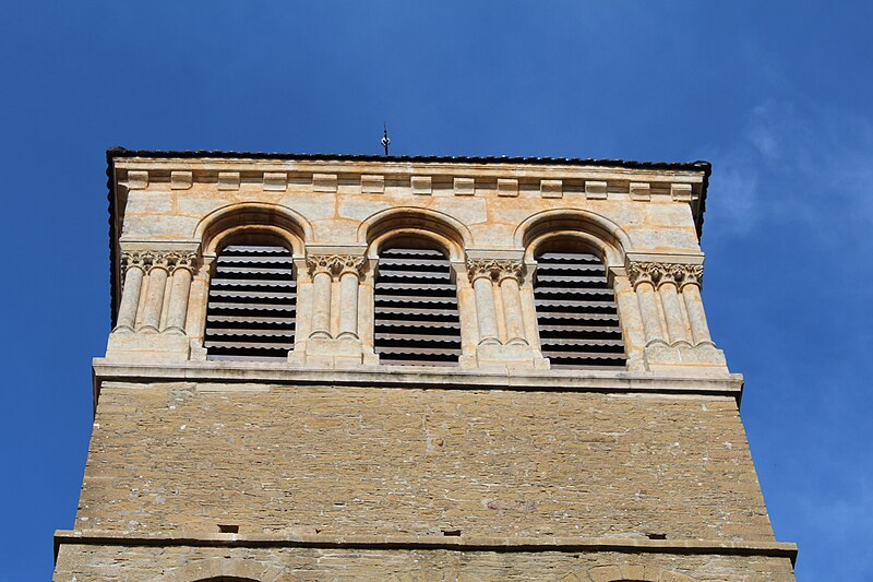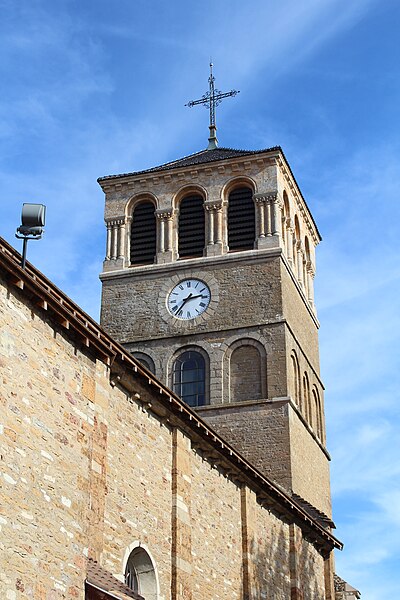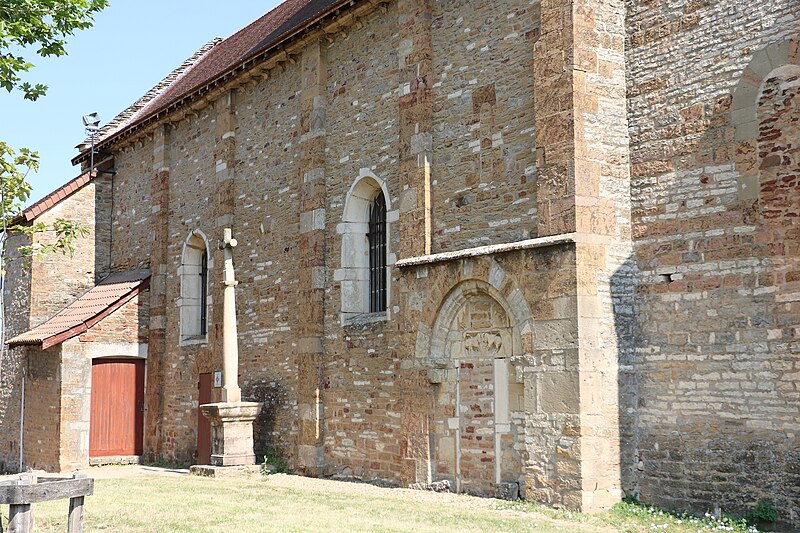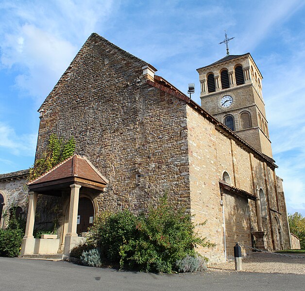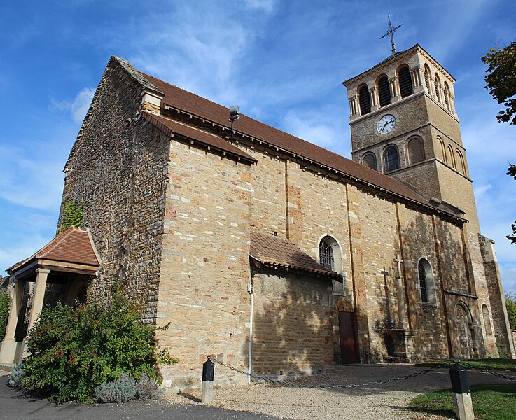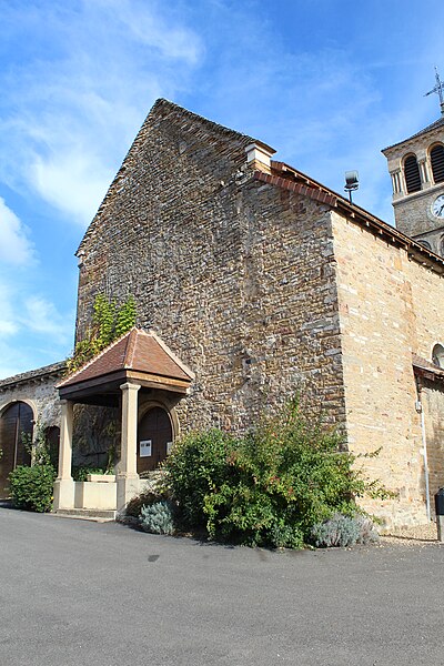 L'église présente une nef unique plafonnée, prolongée par une travée carrée sous le clocher et par une abside formant le chœur ; la nef est éclairée par quatre fenêtres en plein cintre et l'abside par trois baies séparées par des colonnettes. Sur la façade sud, un linteau de porte, probablement un réemploi, montre deux animaux sculptés assez grossièrement, peut‑être des lions, se faisant face et séparés par un arbre, d'inspiration orientale, et un autre linteau représente un coq, interprété parfois comme un vestige de culte ancien. Le clocher, carré et massif, compte trois étages ; il renferme une cloche de 1 035 kg, fondue en 1872 par Burdin aîné, fondeur à Lyon. Contre le mur sud de la nef se trouve une croix de pierre datée de 1768, provenant de l'ancien cimetière qui jouxtait l'église et fut transféré hors du bourg au XIXe siècle. L'église, consacrée et rattachée au diocèse d'Autun, reste un lieu de culte catholique relevant de la paroisse Notre‑Dame‑des‑Coteaux‑en‑Mâconnais, qui en est affectataire au titre de la loi de 1905.