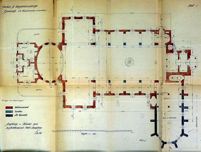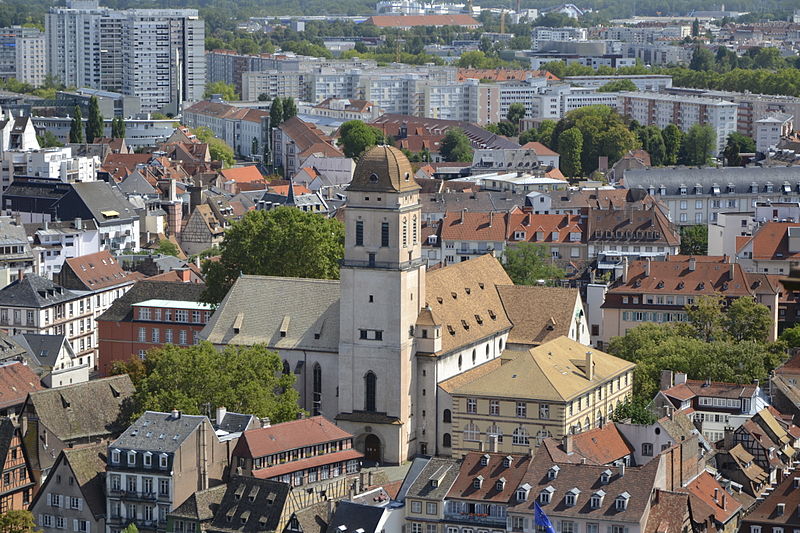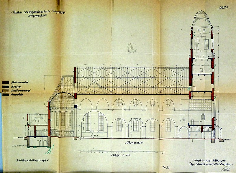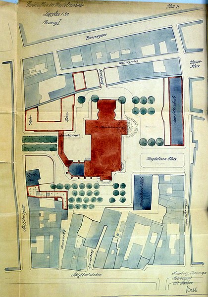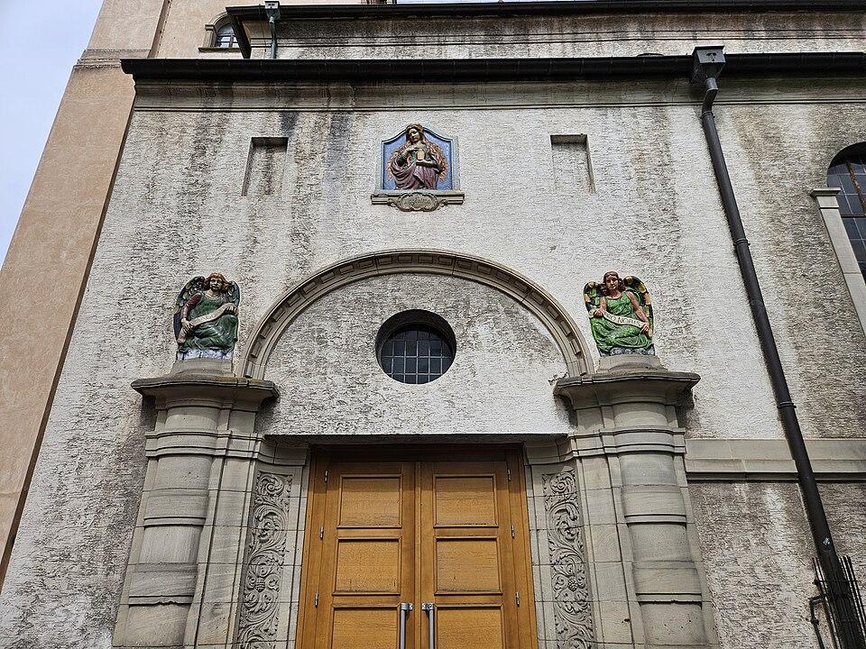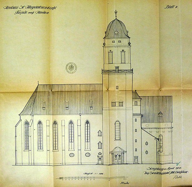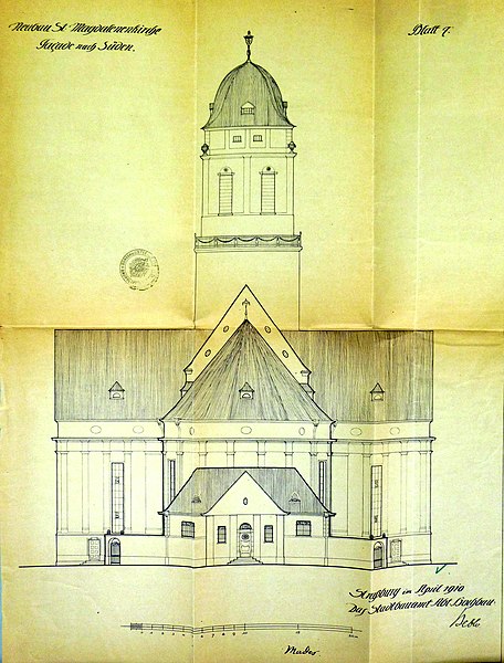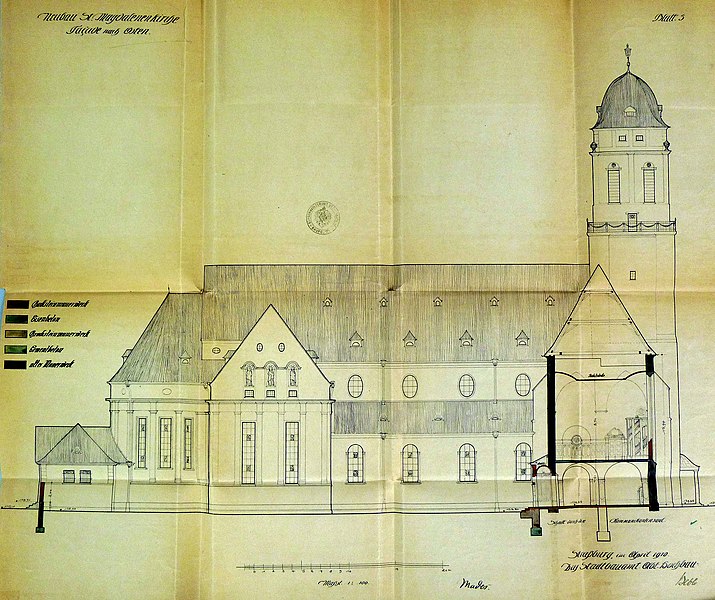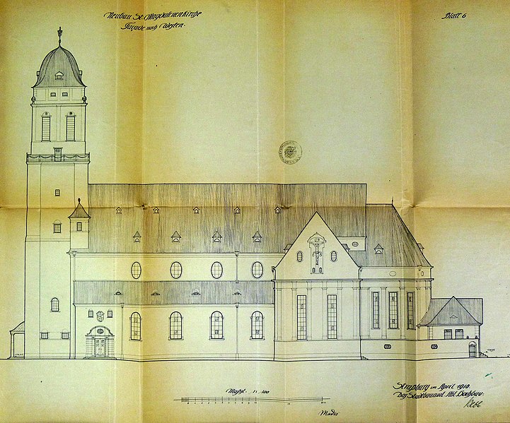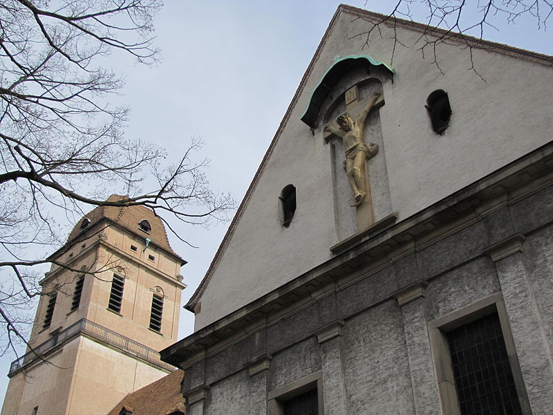 À la fin du XVIIIe siècle, la paroisse desservait également le sud de la ville, en dehors des enceintes. L’église actuelle, perpendiculaire à l’ancien bâtiment, a été construite en 1907 d’après un projet de Fritz Beblo, et se voulait plus spacieuse et aérée. Gravement endommagée par un bombardement anglo-américain le 11 août 1944, elle a été reconstruite à l’identique en 1958.