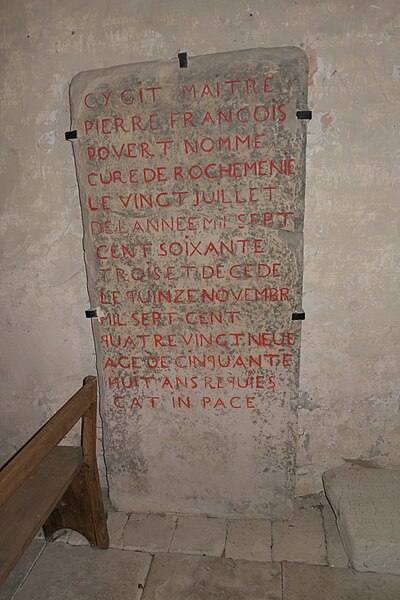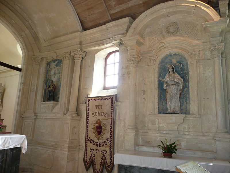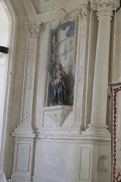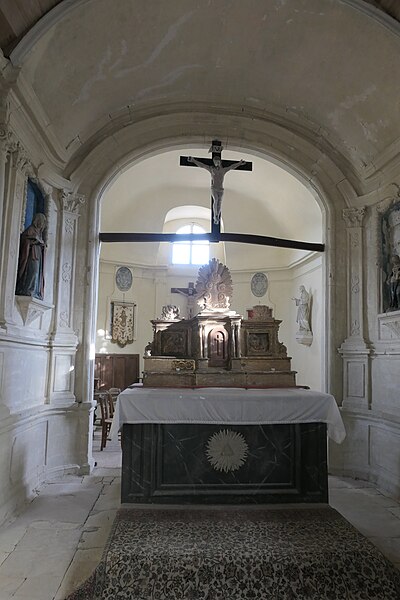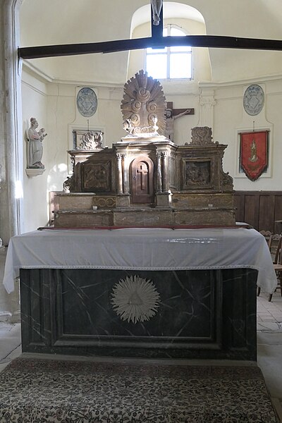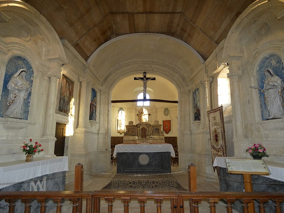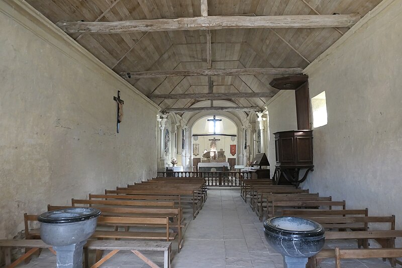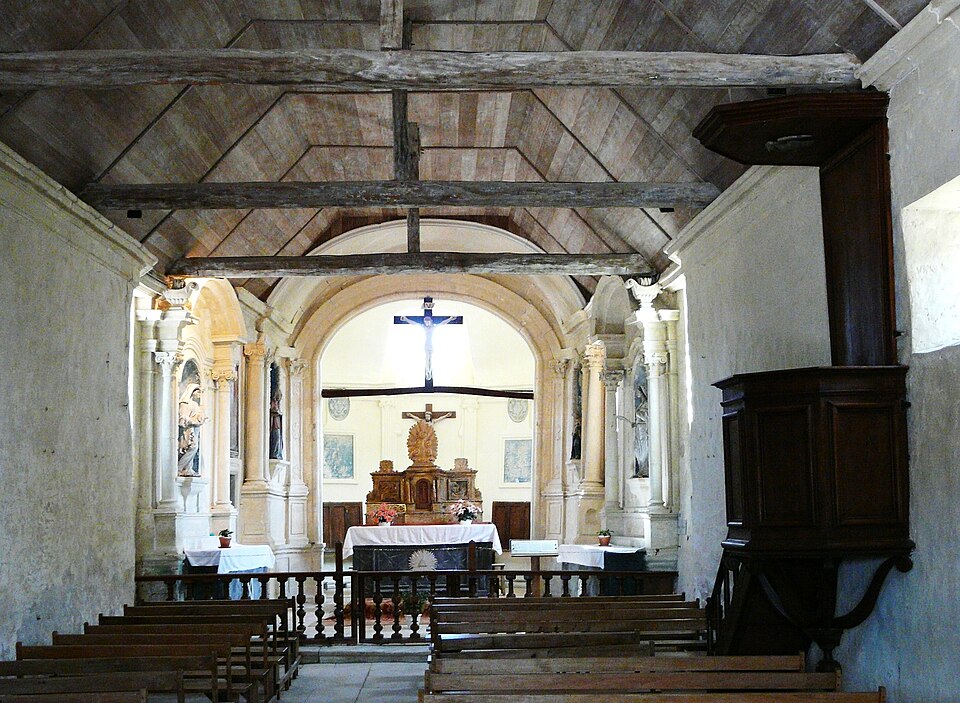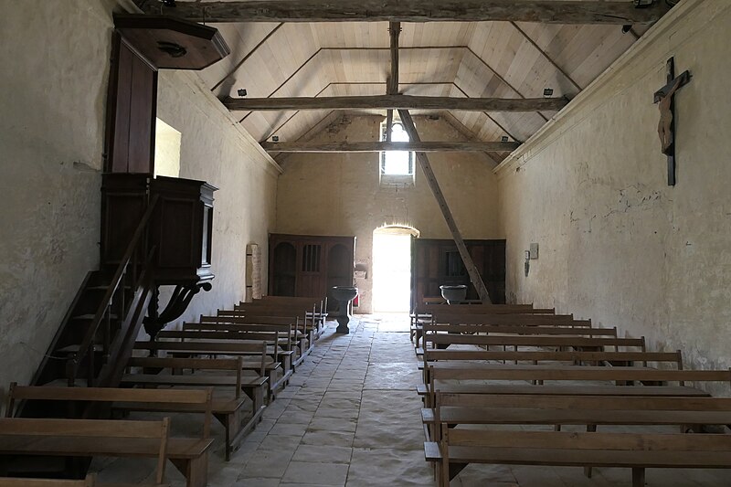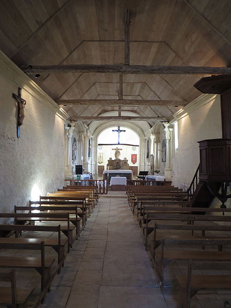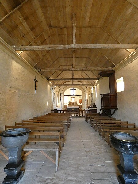 L'intérieur est sobre et comprend une nef unique de style classique sans transept, une charpente rustique et une voûte lambrissée en bois du XVIe siècle rénovée en 2007 ; les murs sont blanchis à la chaux. Le sol est recouvert de dalles funéraires sur lesquelles subsistent encore des inscriptions ; les registres paroissiaux mentionnent plus de cinquante inhumations à l'intérieur, principalement des ecclésiastiques et des personnes de condition aisée, tandis que les défunts plus modestes étaient enterrés autour de l'église ou en fosse commune. Le chœur est lumineux ; à l'entrée de l'abside se trouve un autel dont la première pierre fut posée en 1731, surmonté d'un tabernacle de style Louis XIV et flanqué d'un Christ ancien en bois. Plusieurs statues polychromes ornent l'édifice, dont une sainte Catherine d'Alexandrie et une autre figure tenant un livre, attribuées au XVIe siècle, ainsi que quatre statues de saints du XVIIIe siècle offertes par le curé Pierre Pauvert et achevées puis bénies le 27 septembre 1772, œuvres du sculpteur Sébastien Johan Leysner. On remarque enfin une niche destinée à brûler des « rousines », chandelles de chanvre imprégnées de résine utilisées comme cierges pour obtenir des grâces.