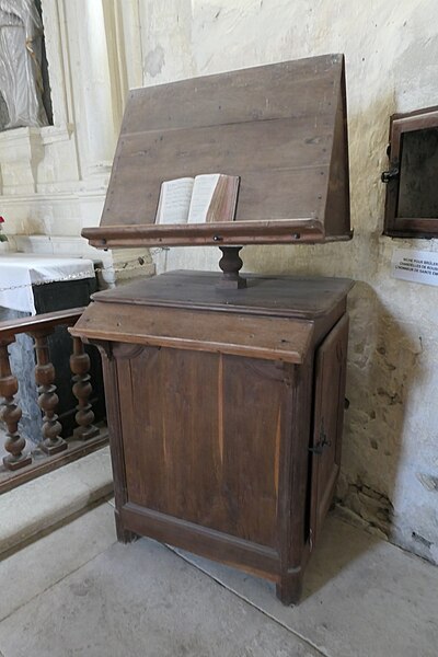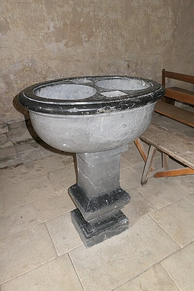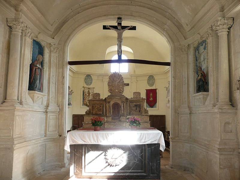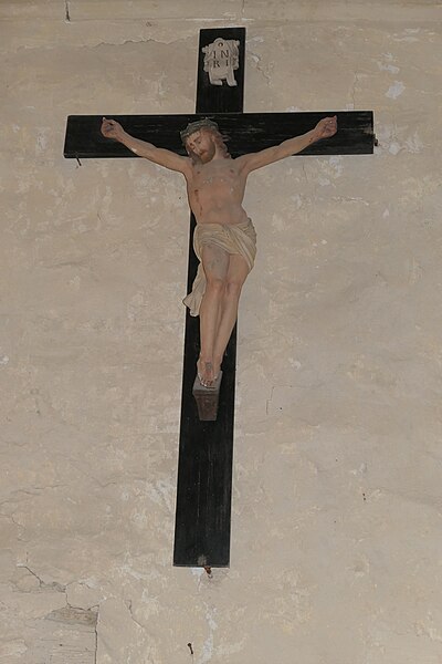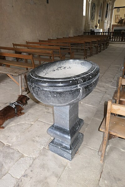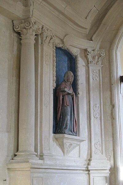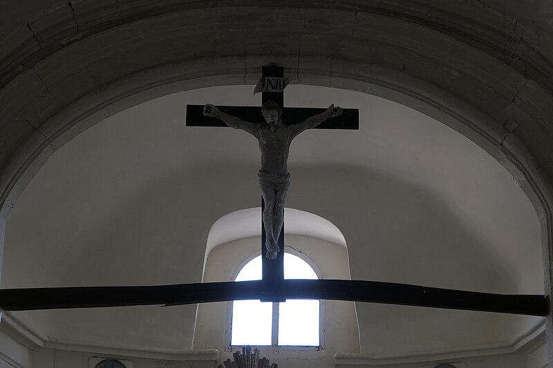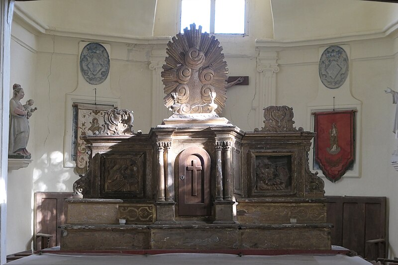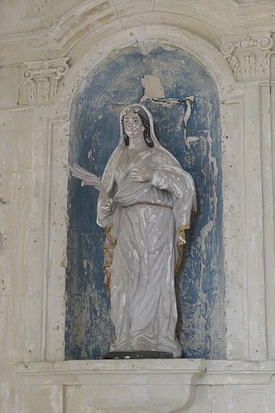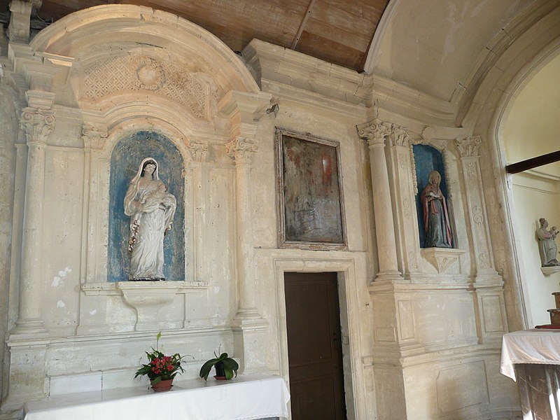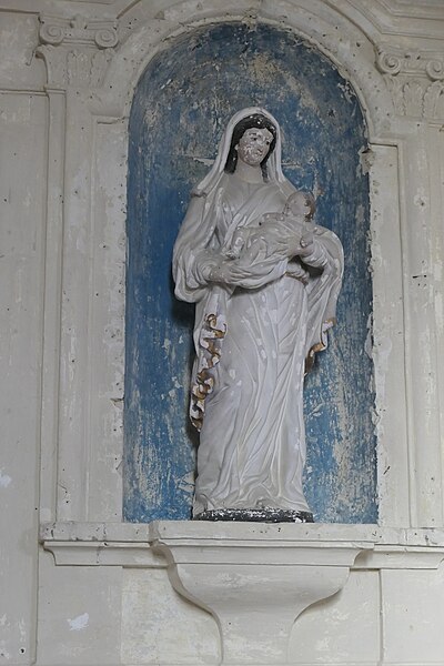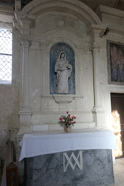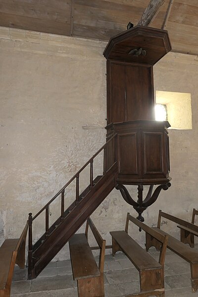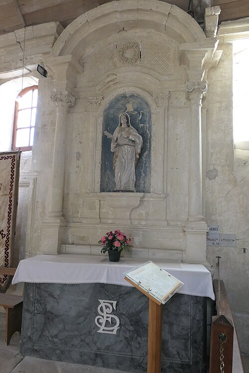 L'intérieur est sobre et comprend une nef unique de style classique sans transept, une charpente rustique et une voûte lambrissée en bois du XVIe siècle rénovée en 2007 ; les murs sont blanchis à la chaux. Le sol est recouvert de dalles funéraires sur lesquelles subsistent encore des inscriptions ; les registres paroissiaux mentionnent plus de cinquante inhumations à l'intérieur, principalement des ecclésiastiques et des personnes de condition aisée, tandis que les défunts plus modestes étaient enterrés autour de l'église ou en fosse commune. Le chœur est lumineux ; à l'entrée de l'abside se trouve un autel dont la première pierre fut posée en 1731, surmonté d'un tabernacle de style Louis XIV et flanqué d'un Christ ancien en bois. Plusieurs statues polychromes ornent l'édifice, dont une sainte Catherine d'Alexandrie et une autre figure tenant un livre, attribuées au XVIe siècle, ainsi que quatre statues de saints du XVIIIe siècle offertes par le curé Pierre Pauvert et achevées puis bénies le 27 septembre 1772, œuvres du sculpteur Sébastien Johan Leysner. On remarque enfin une niche destinée à brûler des « rousines », chandelles de chanvre imprégnées de résine utilisées comme cierges pour obtenir des grâces.