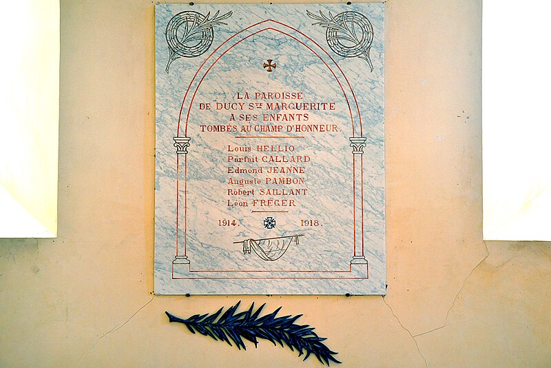 L'église Sainte-Marguerite est une église catholique implantée dans la commune de Ducy-Sainte-Marguerite, dans le département du Calvados. Charles de Cingal, seigneur de Ducy, mort le 6 décembre 1636, y est enterré avec son père Girard; une ceinture funèbre portant leurs armoiries attestait de leur droit de patronage, que Charles défendit contre Jean et Jacques de Cingal selon un arrêt du parlement de Rouen du 8 juillet 1611. Selon Arcisse de Caumont, la tour latérale nord appartient à deux périodes : d’origine romane, elle a été surélevée et achevée au XIIIe siècle par une flèche souvent citée pour son élégance et son audace dans le département. Le chœur date du XVe siècle. Le clocher est classé au titre des monuments historiques depuis le 14 juin 1909 et le reste de l’édifice est inscrit depuis le 12 avril 1927. Au-dessus du portail, une représentation d’un couple enlacé se trouve sous une sculpture grossière d’un lion. Un tableau intitulé Vierge de pitié, attribué à Luis Morales, est classé au titre d’objet depuis 1934 ; volé en 1976, il a été retrouvé plusieurs années plus tard et est désormais conservé au musée des Beaux-Arts de Caen, une reproduction photographique en grandeur réelle étant visible dans l’église. La chaire à prêcher, datée du XVIIe siècle, est classée au titre d’objet depuis 1907. De nombreux éléments mobiliers et tableaux ont été inscrits au titre d’objets en 1977 ; parmi eux figurent La Dormition de la Vierge (XVIIIe siècle), Christ au roseau (XVIIIe siècle), une Immaculée Conception (XVIIIe siècle) — copie de Murillo disparue lors du cambriolage de 1976 — ainsi que Sainte Marguerite et Saint Jean et la Vierge au pied de la Croix (XIXe siècle). L’ensemble de ces protections porte sur l’église, son portail, la nef, la chaire à prêcher, la reproduction photographique de la Vierge de pitié et plusieurs tableaux cités ci‑dessus.