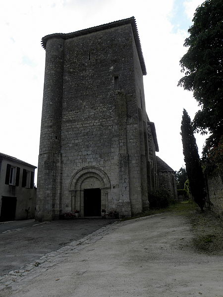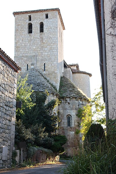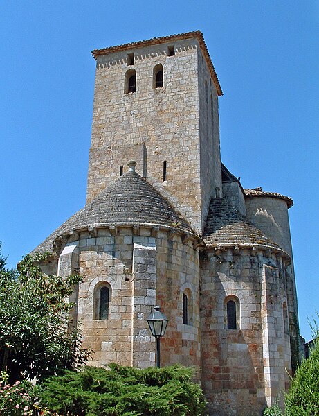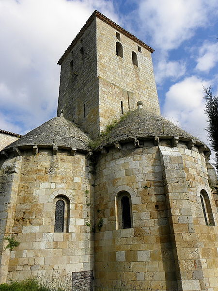 L'église Sainte-Marie d'Aubiac, située au cœur du bourg en Lot-et-Garonne, présente un plan en croix latine. Elle se compose d'un porche ouvrant sur la nef, d'un transept autour duquel s'articulent trois absides et d'une tour carrée au-dessus du porche, dont les caractéristiques évoquent une tour de défense. L'accès à la tour se fait par une vis logée dans une tourelle en saillie au niveau du premier étage. Le transept s'élève sur deux étages au-dessus des voûtes en cul-de-four des absides ; son premier niveau est rythmé par des colonnes aux chapiteaux sculptés. Les absides s'ouvrent sur une travée carrée voûtée d'une coupole, surélevée par un étage formant tambour. La tour-lanterne, posée sur la cella carrée soutenant les trois absides, évoque les grandes réalisations carolingiennes. La nef a été édifiée au XIIe siècle en deux campagnes. Les sources documentaires sont rares : la première mention explicite remonte au testament de Pierre de Galard en 1281. En 1317, la paroisse de Sainte-Marie d'Aubiac fut détachée de l'évêché d'Agen pour être rattachée à l'évêché de Condom ; au XVIe siècle l'église est encore un prieuré, elle est unie à l'abbaye de Clairac en 1741, puis la paroisse revient à l'évêché d'Agen en 1802. Les historiens, dont Georges Tholin et Marcel Durliat, soulignent la difficulté d'établir une histoire complète en l'absence d'archives, mais ils s'accordent sur l'originalité du chœur triconque. Pour Tholin, l'édifice remonte au commencement du XIe siècle et, selon lui, des éléments tels qu'un petit appareil à la base de l'abside septentrionale témoignent d'un substrat carolingien sur lequel une architecture romane ultérieure a été reconstruite. Durliat propose que l'architecte roman ait réutilisé les substructures d'un triconque antérieur pour édifier le chœur, en modifiant ensuite le tracé et l'axe de la nef là où elle n'existait pas. Des plans triconques comparables sont connus ailleurs, notamment à l'abbatiale de Tourtoirac (avant la destruction d'une abside en 1909) et dans d'autres églises du Grand Sud-Ouest, ce qui situe Sainte-Marie dans un ensemble de monuments régionaux partageant ce type de configuration. L'édifice est classé au titre des monuments historiques en 1908.