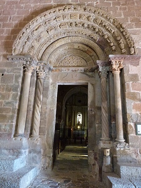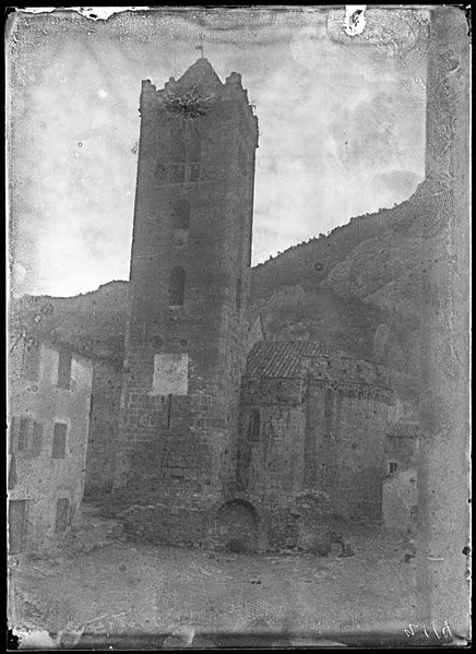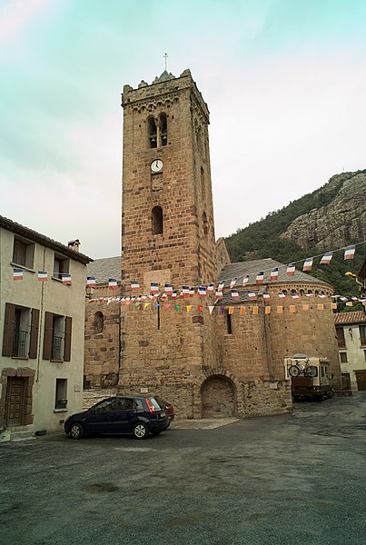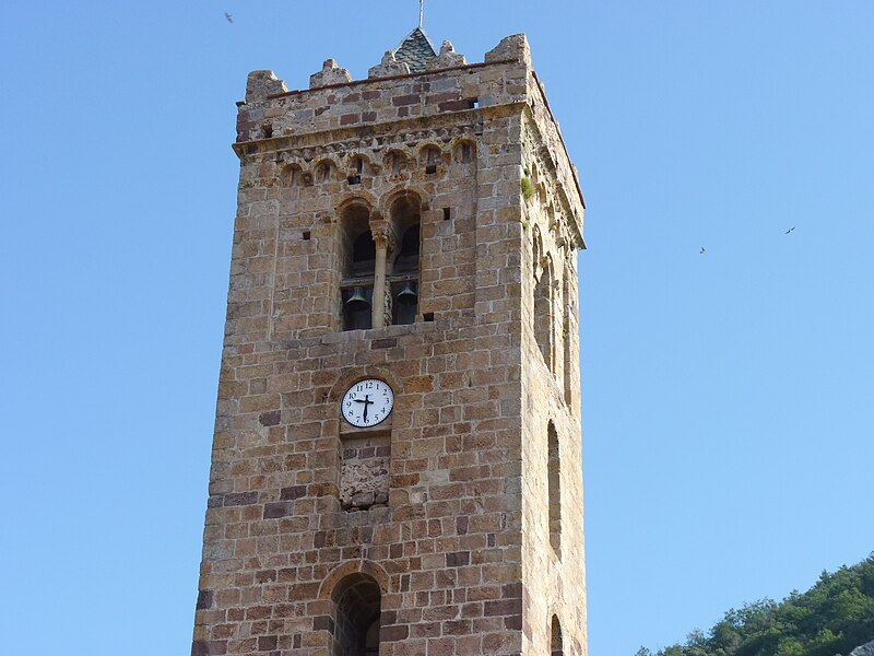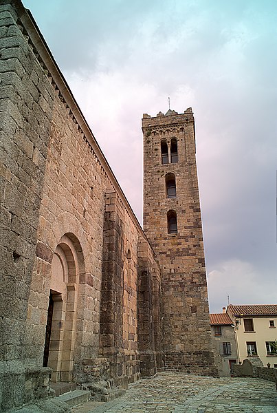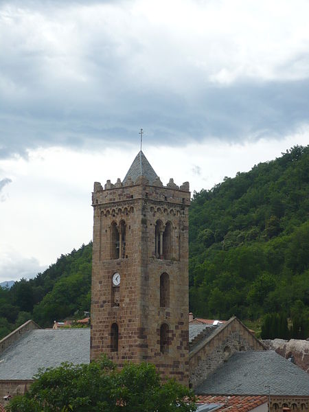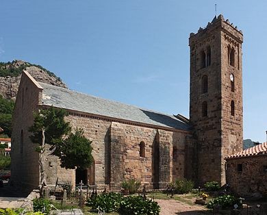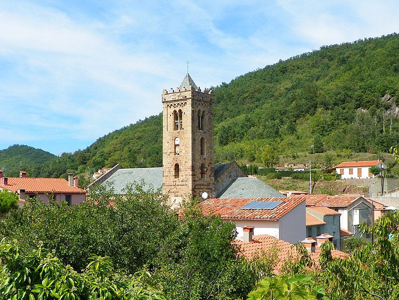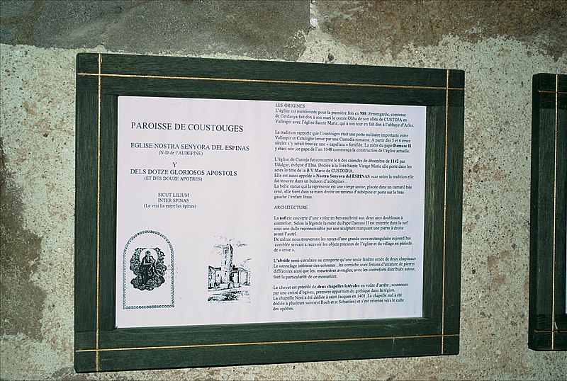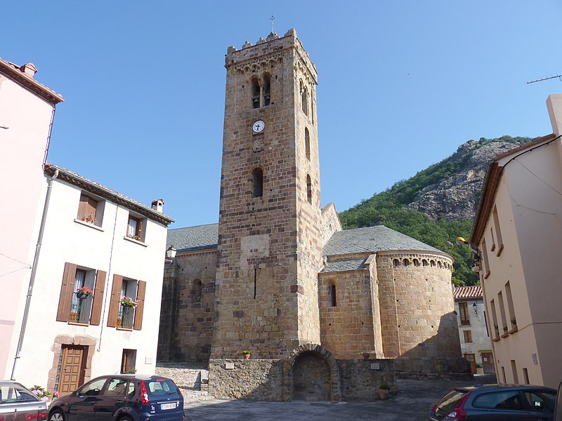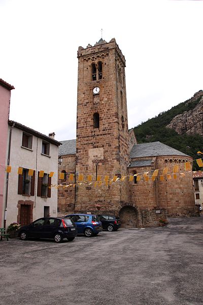 L'église Sainte-Marie se situe au centre du village de Coustouges, dans le Vallespir, département des Pyrénées-Orientales en Occitanie. Elle est aujourd'hui l'église paroissiale de la commune ; autrefois, elle dépendait d'un monastère bénédictin. L'édifice a été inscrit sur la liste des monuments historiques de 1840. Le village se trouve à l'extrémité du vallon de Saint-Laurent-de-Cerdans, sur une route de passage vers l'Espagne, très fréquentée au Moyen Âge en direction de Maçanet de Cabrenys. Aux XIXe siècle, des auteurs comme Prosper Mérimée et Isidore Taylor attribuèrent une origine antique et des destructions successives de l'église, évoquant notamment le pape Damase Ier, les Wisigoths et les Arabes, ainsi qu'une reconstruction au IXe siècle ; ces récits ont depuis été considérés comme légendaires, faute de textes anciens et en raison des éléments fournis par l'étude architecturale, les seuls vestiges romains repérés sur la commune étant des monnaies. Les premières attestations documentaires datent du haut Moyen Âge : Coustouges apparaît dans un acte de 936, et l'église est mentionnée pour la première fois dans un testament de 979 par lequel Miron, comte et évêque, lègue la dîme perçue sur l'alleu de Coustouges à l'abbaye Sainte-Marie d'Arles. L'alleu et son église furent ensuite transmis à des seigneurs locaux avant d'être confirmés à l'abbaye d'Arles, possession attestée notamment par une bulle pontificale de Serge IV en 1011. L'édifice actuel a été entrepris par l'abbaye d'Arles, qui en conserva la propriété jusqu'à la Révolution ; il remplace une construction plus ancienne et a été consacré le 26 novembre 1142 par l'évêque d'Elne Udalgar de Castellnou, en présence de l'abbé d'Arles Raymond Ier. En 1291, l'abbé Raymond II d'Esbac y établit un curé, ce qui semble marquer un développement de la vie paroissiale. L'église présente une nef unique voûtée, renforcée par des contreforts, et un plan intérieur composé de la nef et du chœur prolongé par une abside semi-circulaire. Le portail, richement sculpté dans le style roman, précède une porte d'entrée en fer forgé attribuée au XIIe siècle ; le clocher se présente sous la forme d'une tour carrée. Une grille remarquable du XIIe siècle ferme la porte du presbytère et l'église conserve une Vierge de l'Espinàs datée du XVIIe siècle. Il est signalé que le clocher serait surmonté d'un paratonnerre radioactif de type Hélita, mentionné dans la base de données INAPARADS.