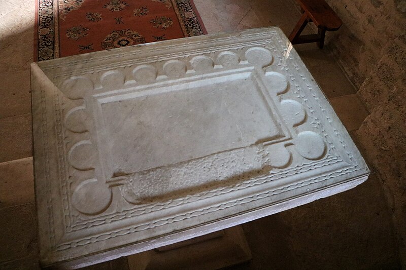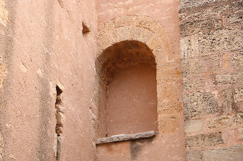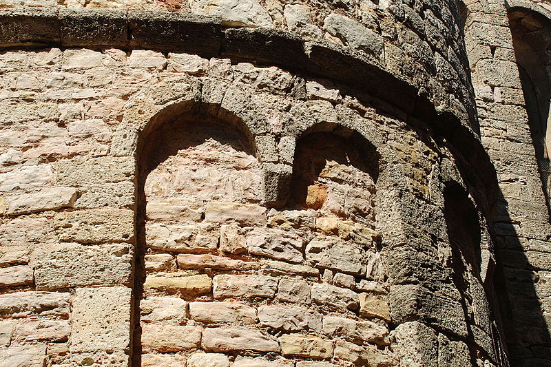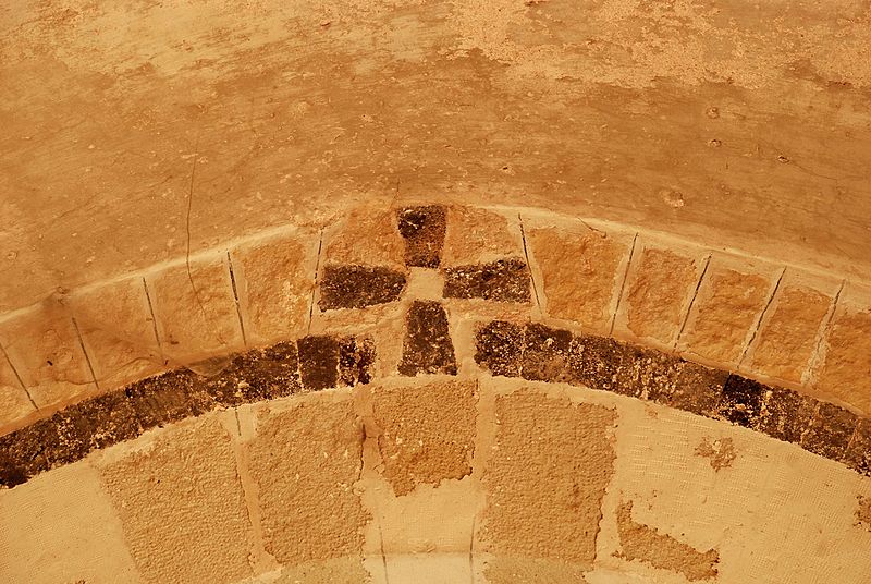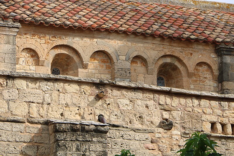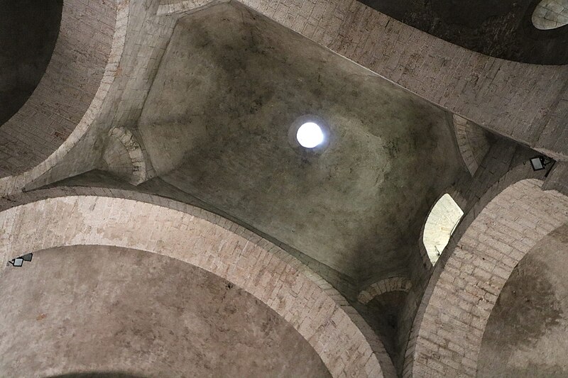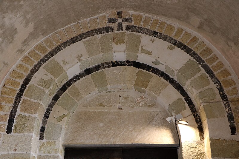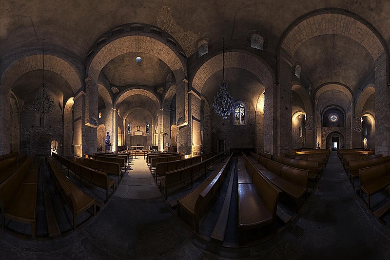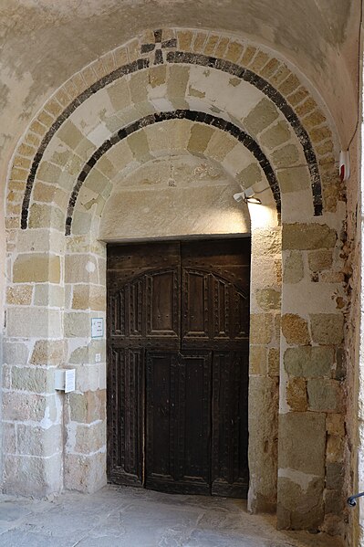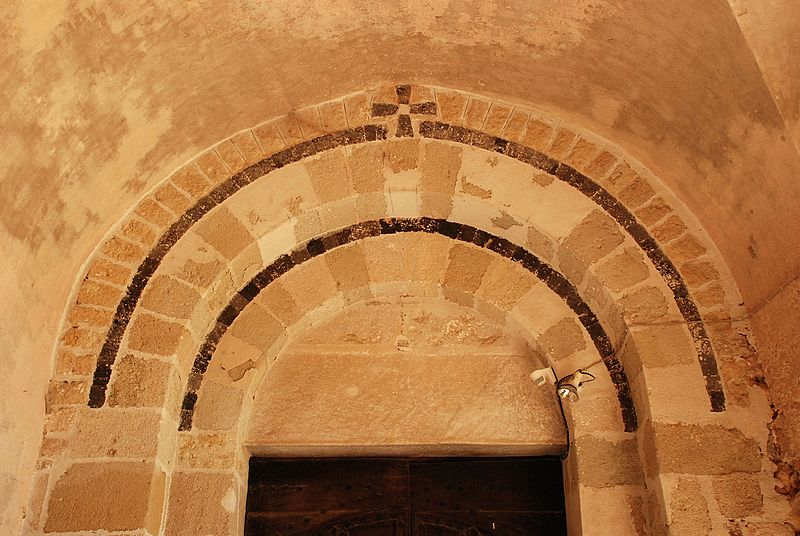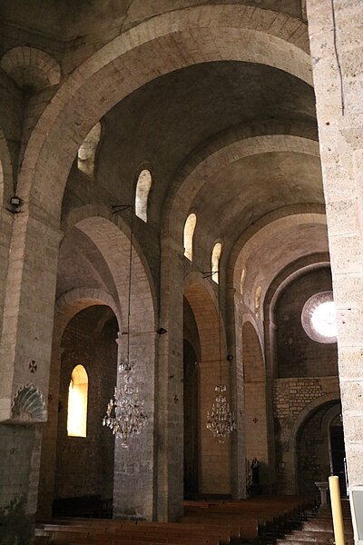 La nef est voûtée en berceau et n’est éclairée que par six étroites baies au sud ; la croisée du transept est surmontée d’une coupole allongée et les bas-côtés sont voûtés d’arêtes. Chaque nef se termine par une abside en cul-de-four ; l’abside centrale pourrait avoir comporté deux rangs de fenêtres, les arcades supérieures ayant peut-être un rôle décoratif seulement. Sous chacun des clochers se trouve une petite coupole octogonale portée par des trompes. La porte principale, à l’ouest et dans l’axe de la nef, est ornée d’une croix inscrite dans un cercle et d’une archivolte en lave noire. Vers le XVe siècle, le bas-côté sud a été sommairement crénelé, traduisant un usage défensif partiel.