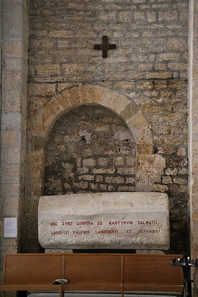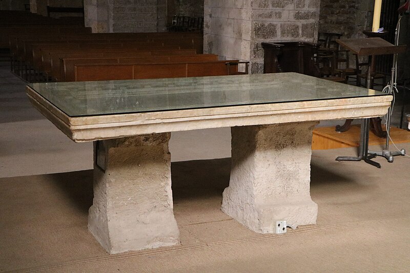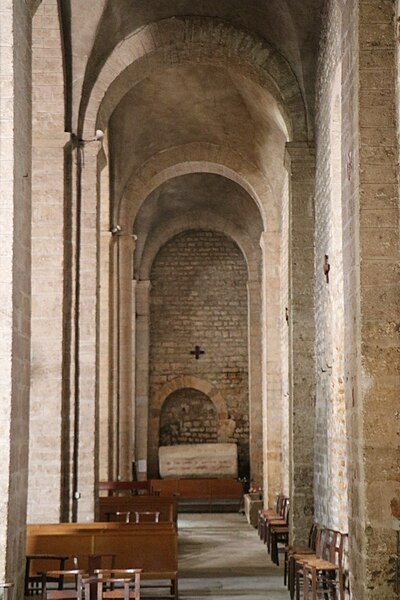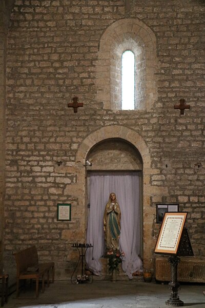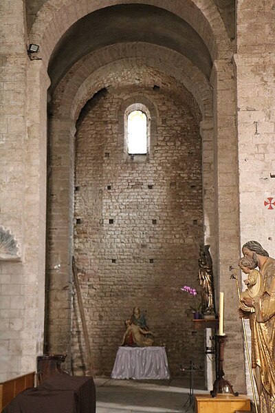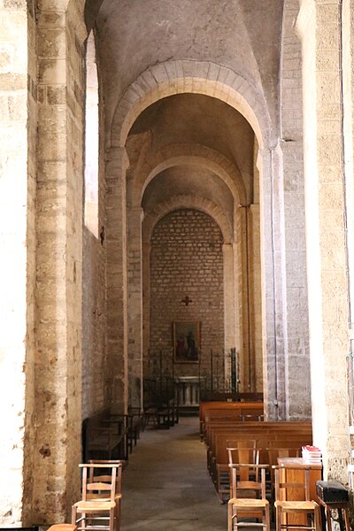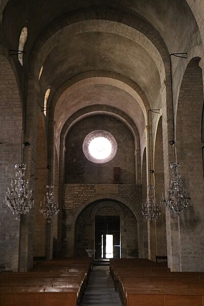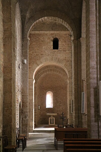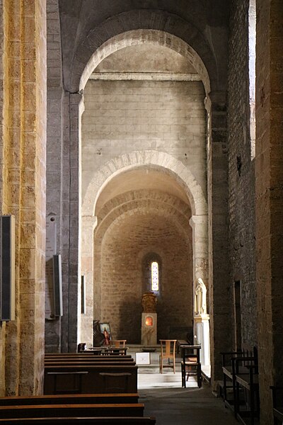 À l’intérieur, la disposition et les voûtements soulignent la monumentalité du plan et la qualité des élévations ; l’église possède également des vitraux qui rythment la lumière. Parmi les mobiliers anciens, on note deux autels à lobes en marbre du XIe siècle : l’un occupe l’absidiole gauche, l’autre, qui sert de maître-autel, est reconnu pour la finesse de sa décoration et fait partie des plus beaux autels à lobes languedociens.