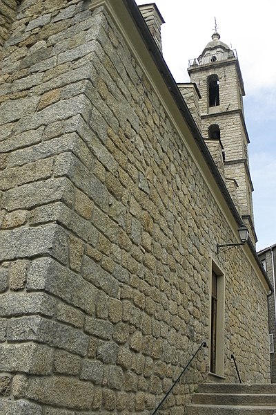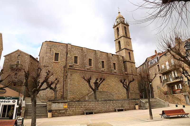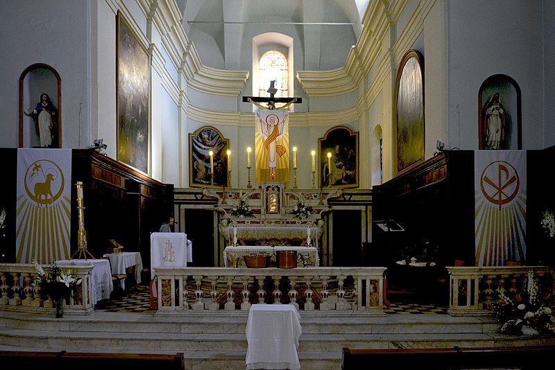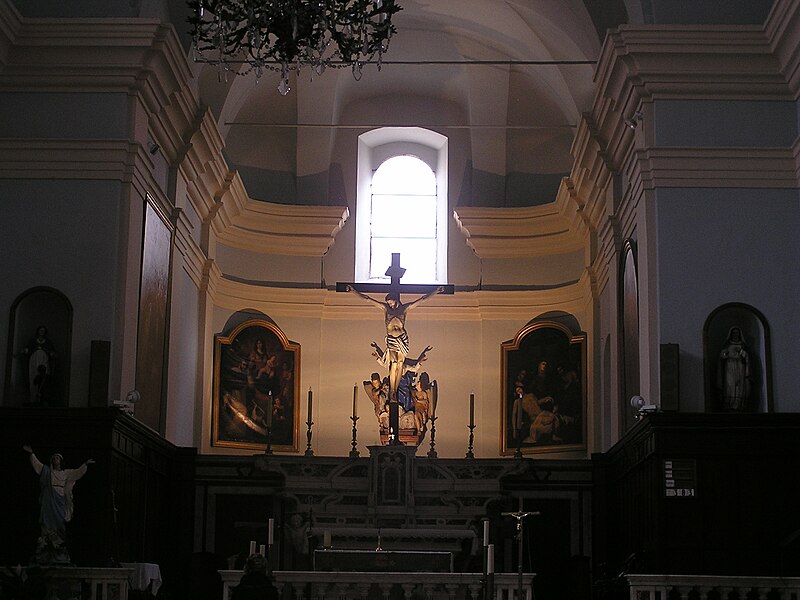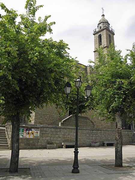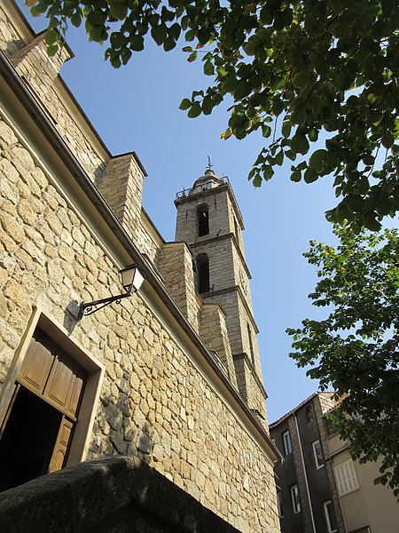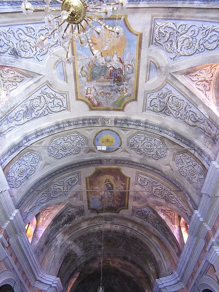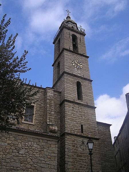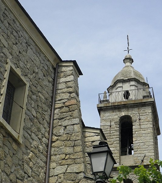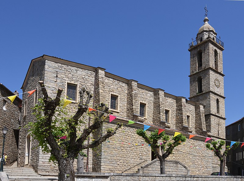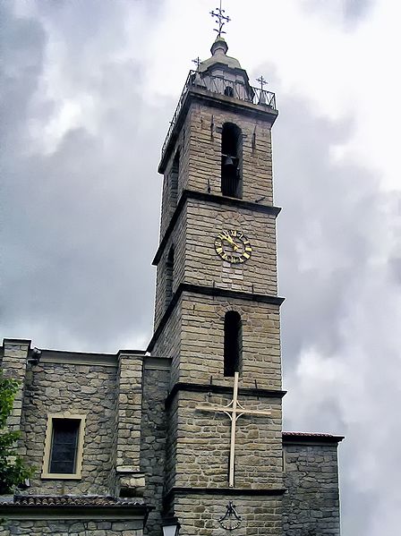 La construction commence en 1766, l'ancienne église s'étant effondrée l'année précédente. Les travaux se poursuivent tout au long du XIXe siècle, tandis que la construction du clocher débute en 1768. La façade-pignon est percée d'une porte à deux vantaux et de deux hautes fenêtres en demi-cercle. La nef, couverte d'une voûte, est séparée du chœur par une balustrade en marbre polychrome. Le clocher, composé de trois niveaux aveugles et de trois niveaux percés de baies, est couronné d'un clocheton à coupole.