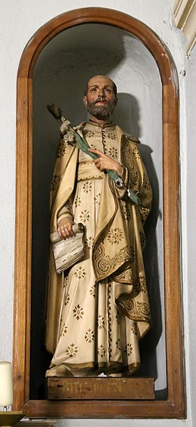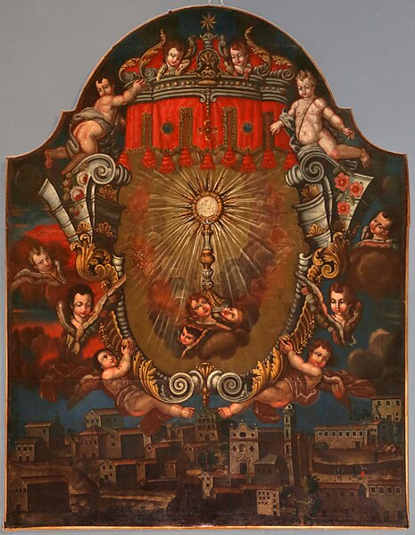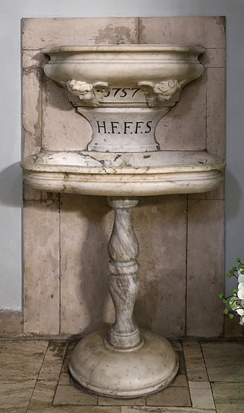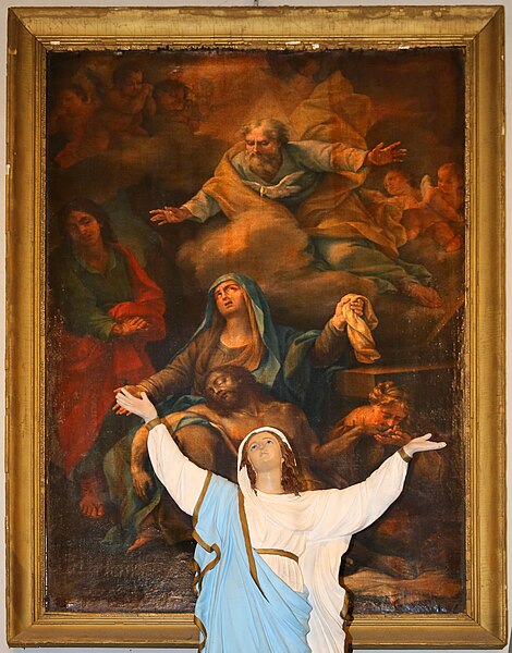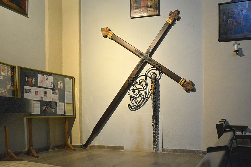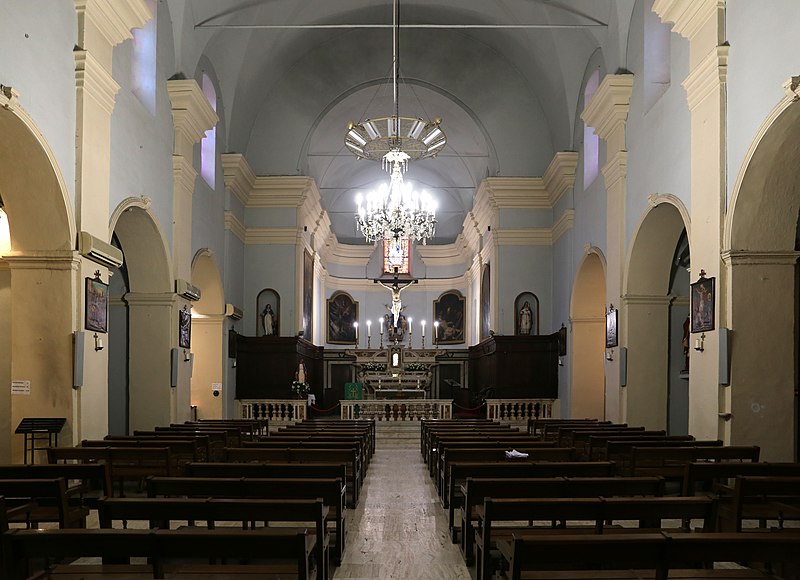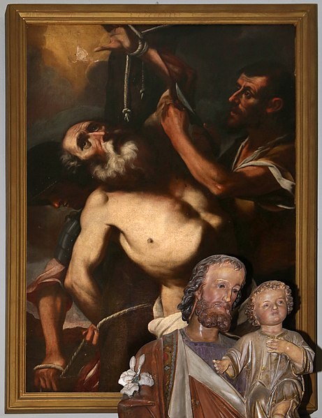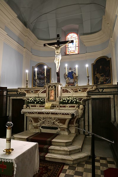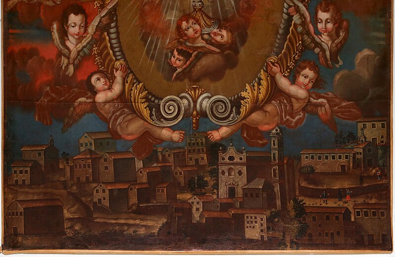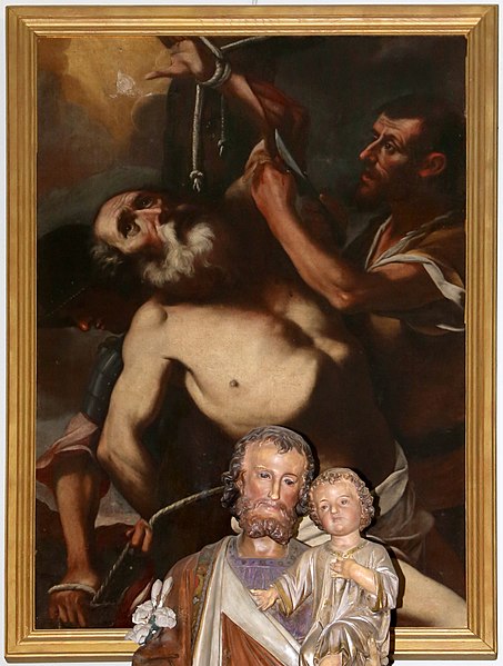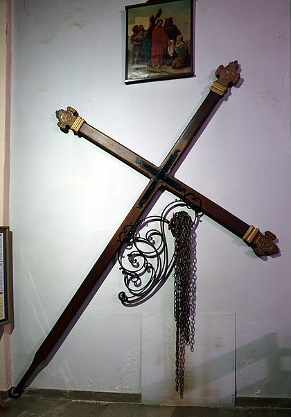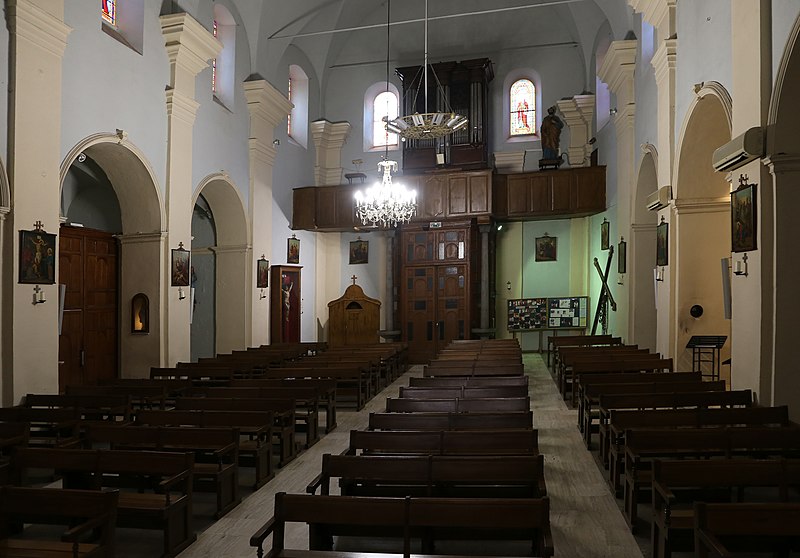 La construction commence en 1766, l'ancienne église s'étant effondrée l'année précédente. Les travaux se poursuivent tout au long du XIXe siècle, tandis que la construction du clocher débute en 1768. La façade-pignon est percée d'une porte à deux vantaux et de deux hautes fenêtres en demi-cercle. La nef, couverte d'une voûte, est séparée du chœur par une balustrade en marbre polychrome. Le clocher, composé de trois niveaux aveugles et de trois niveaux percés de baies, est couronné d'un clocheton à coupole.