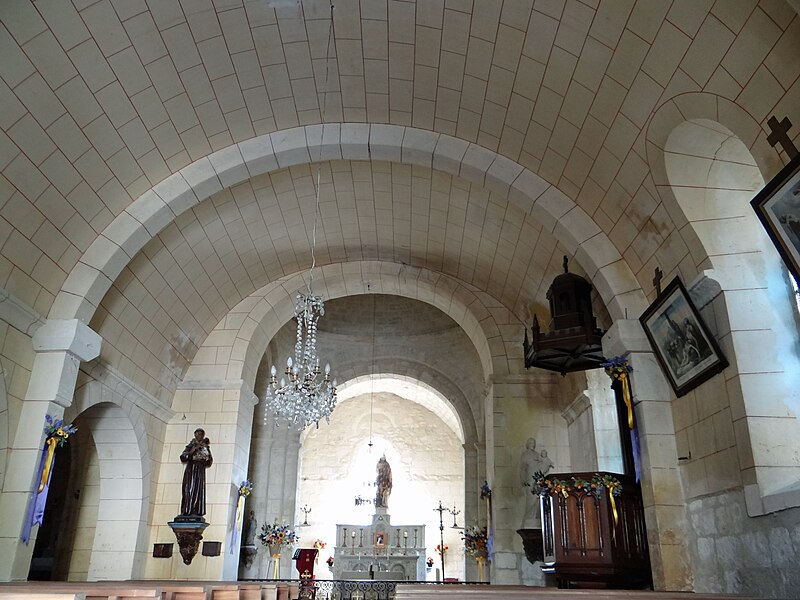 L'architecture intérieure comprend une nef voûtée en berceau sauf la dernière travée, couverte par la coupole sur pendentifs qui porte le clocher, et un chœur rectangulaire ; le bas-côté nord longe la nef. Le clocher présente à son étage supérieur une galerie en bois à claire-voie sur trois faces, surmontée d'une toiture à quatre versants aigus, évoquant les hourds militaires ; son mur ouest loge les cloches dans deux arcades. De nombreuses sépultures, la dernière datée de 1778, ont été alignées sous le dallage et sont aujourd'hui recouvertes par le pavement actuel. Le portail conserve deux sculptures figurant sainte Marie-Madeleine et le buste d'un pèlerin portant un bâton et des coquilles sur son chapeau. La grosse cloche date du XVIIIe siècle (marraine Marie du Rieu, parrain Louis du Rieu) et la petite cloche de 1855, fondues pendant le long ministère de l'abbé Boyer (marraine Nelly de Larmandie, parrain Louis de Larmendie).
