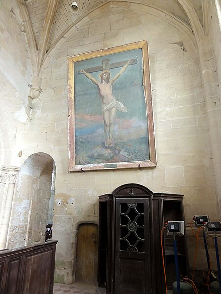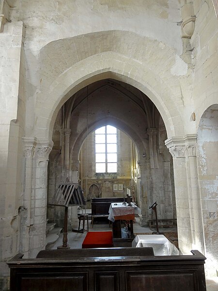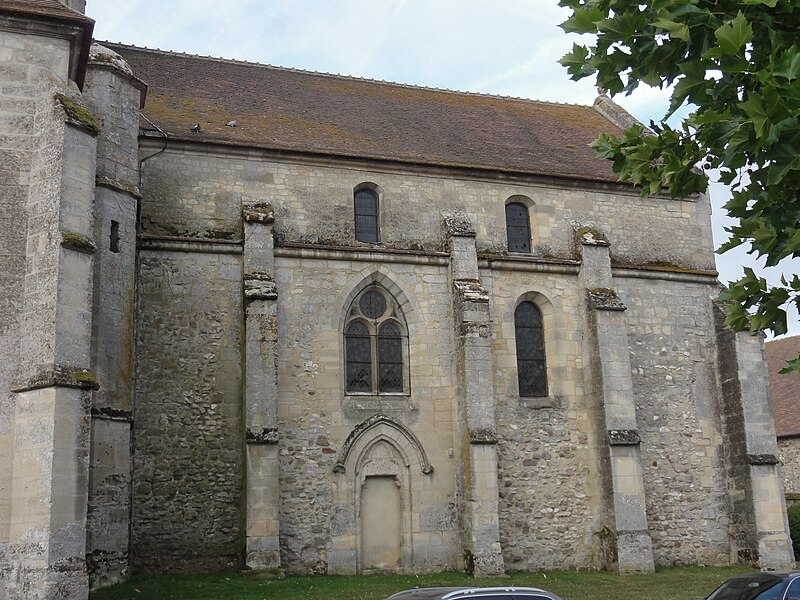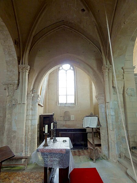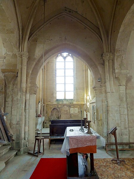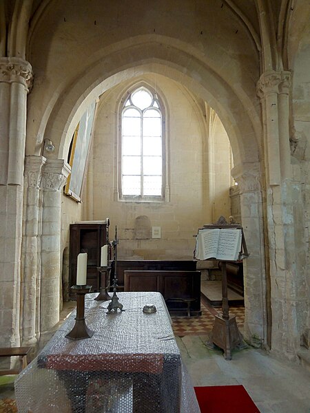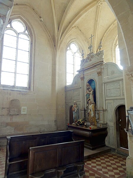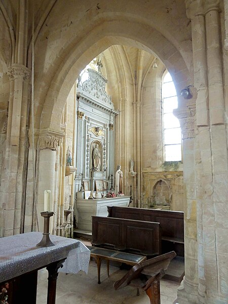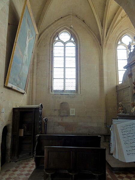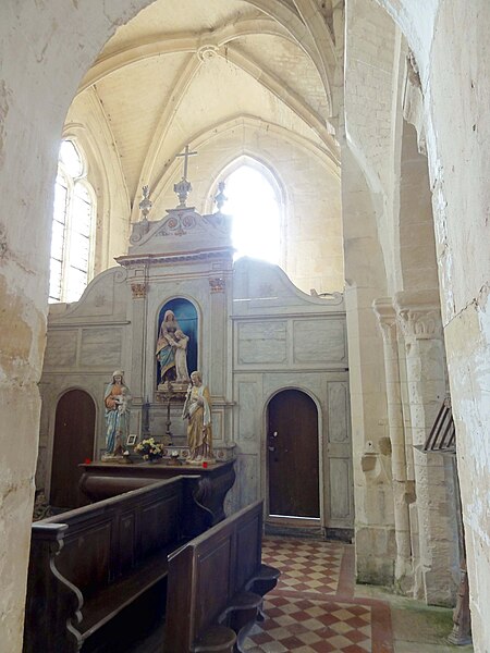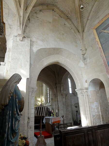 L'église Sainte-Marie-Madeleine du Bellay-en-Vexin, située au centre du village dans le Val-d'Oise, est une paroisse catholique d'origine romane dont le plan cruciforme a peu changé malgré de nombreuses campagnes de travaux. Sa structure associe une nef-grange romane remaniée, la base du clocher qui sert de croisée du transept, un croisillon sud reconstruit en chapelle gothique rayonnante, une chapelle nord flamboyante en deux travées et un chœur carré de style Renaissance. L'intérêt principal réside dans les chapiteaux romans de la base du clocher, issus de plusieurs campagnes et visibles surtout depuis l'intérieur, tandis que la voûte et les colonnettes datent de la fin du XIIIe siècle. L'aspect extérieur sobre, dominé par un clocher en bâtière richement décoré et par deux portails dont l'un est aujourd'hui bouché, témoigne surtout de la période rayonnante. Classée monument historique depuis 1965, l'église est aujourd'hui en bon état mais les célébrations y sont rares, la paroisse étant affiliée à une plus vaste paroisse de Magny-en-Vexin. L'édifice occupe l'ancien cimetière du village, où subsiste une croix de pierre gravée de 1643, et forme un ensemble remarquable avec la ferme de l'hôtel-Dieu voisine, manoir classé depuis 1913. La date exacte de la fondation paroissiale reste incertaine; des études anciennes la situent au milieu du XIIe siècle et la présentent dédiée à sainte Marie-Madeleine. Aux XIIe et XIIIe siècles la cure et une partie des dîmes furent l'objet de donations et de conflits entre la famille locale du Bellay et l'abbaye Saint-Martin de Pontoise, des litiges qui se prolongent pendant plus d'un siècle. Les éléments romans de la base du clocher, notamment des arcades en plein cintre et leurs chapiteaux, pourraient remonter à la fin du XIe ou au début du XIIe siècle, tandis que l'apparition de l'arc brisé dans la région après 1125 conduit certains spécialistes à situer la transformation de la base en croisée du transept vers 1140. À la fin du XIIIe siècle la chapelle dite de la Vierge remplace le croisillon sud roman et la base du clocher est revoûtée dans un style rayonnant, avec l'adjonction de faisceaux de colonnettes aux angles. La chronologie du clocher suscite des avis divergents chez les auteurs, certains proposant une construction à la fin du XIVe siècle et d'autres une datation plus ancienne; des trompes visibles à l'intérieur témoignent d'un projet de flèche octogonale inachevé. Durant la période rayonnante la nef reçoit de nouveaux portails et certaines fenêtres sont percées ou modifiées; au début du XVIe siècle le croisillon nord est remplacé par une chapelle flamboyante et le chœur est rebâti dans un goût de la Renaissance. Des interventions ultérieures incluent des réparations du plafond et du chœur vers 1720, l'ouverture de passages berrichons en 1750 qui ont endommagé les contreforts du clocher, puis des travaux de sacristie et de vitrerie en 1857. L'église conserve une nef non voûtée et des parties voûtées d'ogives dans les autres espaces; la base du clocher présente une cohabitation visible d'éléments romans et gothiques, avec arcades en plein cintre et en tiers-point reposant sur tailloirs et faisceaux de colonnettes. Les chapiteaux romans, sculptés de palmettes, feuilles d'acanthe, rinceaux et quelques figures humaines ou monstrueuses, sont de grande qualité; d'autres chapiteaux de la fin du XIIIe siècle affichent un décor de feuillage plus stylisé. La chapelle sud rayonnante présente un remplage orné d'un grand hexalobe encadré de colonnettes et une niche d'autel peu profonde largement prise par le retable; la chapelle nord en deux travées et le chœur montrent des remplages et des profils d'ogives caractéristiques des périodes flamboyante tardive et Renaissance. À l'extérieur, le beffroi visible sous le toit en bâtière est percé de paires de baies abat-son en tiers-point encadrées par colonnettes et frises de crochets, et des têtes sculptées en saillie animent les faces du clocher. Le portail occidental, mutilé, et le portail latéral nord, aujourd'hui bouché, portent des traces de moulures et d'un tympan largement disparu; la façade ouest, simple et scandée par bandeaux, révèle la hauteur primitive des murs romans. Le mobilier comporte plusieurs pièces remarquables et classées : la cloche datée de 1535, un grand tableau de retable de Charles-Alphonse Du Fresnoy représentant l'Adoration des bergers, un tableau de la Madeleine pénitente attribué traditionnellement à Jean-Baptiste Santerre, ainsi que des sculptures dont une Vierge de Pitié du XVe siècle et une statue de sainte Madeleine. La cloche, restaurée à la fin du XXe siècle, porte un décor en bas-relief et une inscription mentionnant son nom; certaines œuvres anciennes ont été déclassées ou ont disparu. Depuis l'érection du diocèse de Pontoise, la paroisse du Bellay est desservie par les prêtres du secteur pastoral du Vexin ouest et les messes dominicales s'y tiennent de manière irrégulière; depuis 2012 une communauté religieuse, la communauté Mère du Divin Amour, est implantée au Bellay.