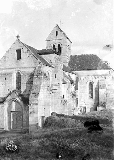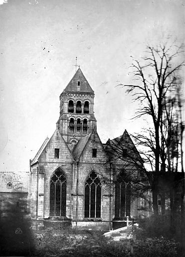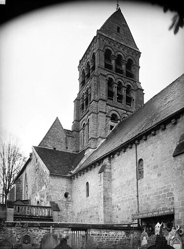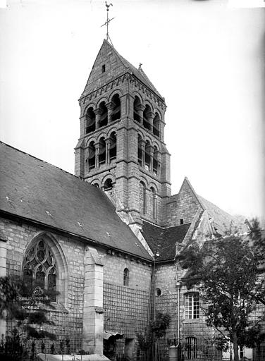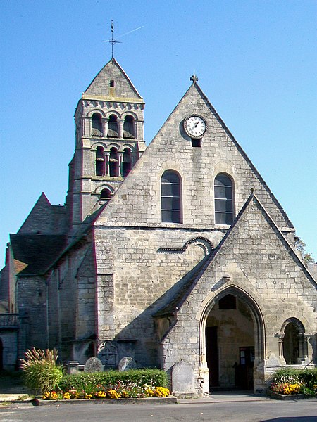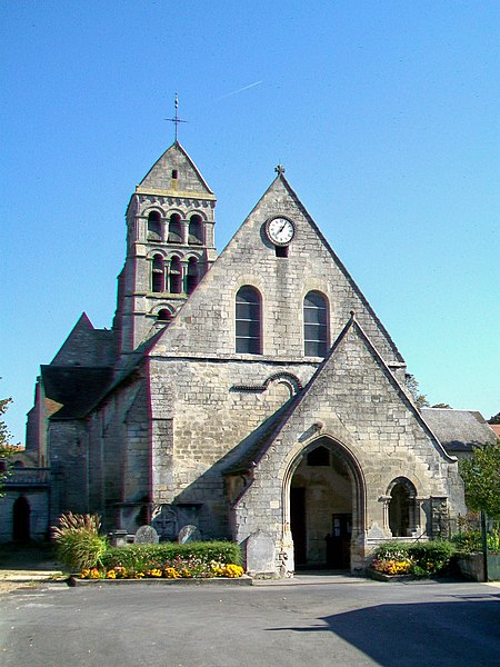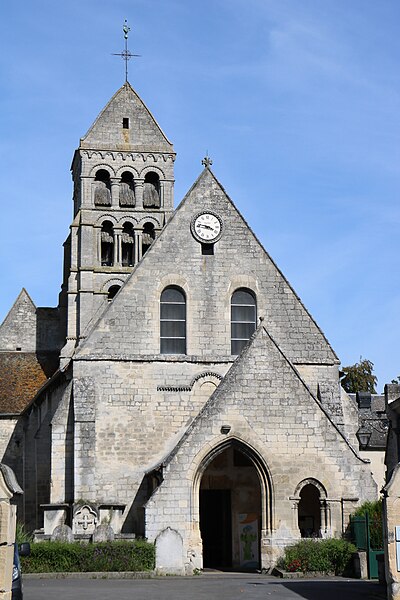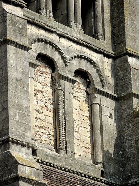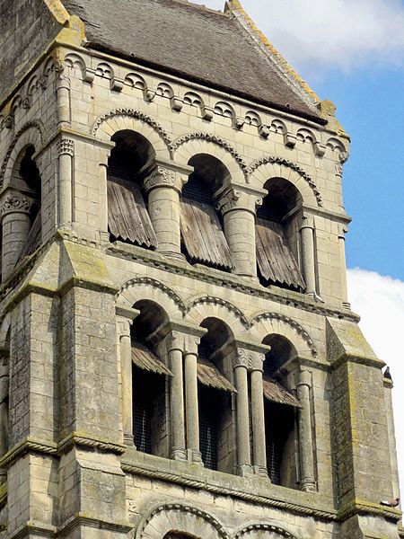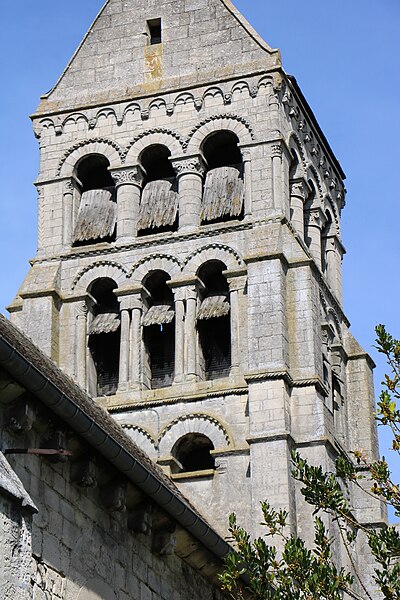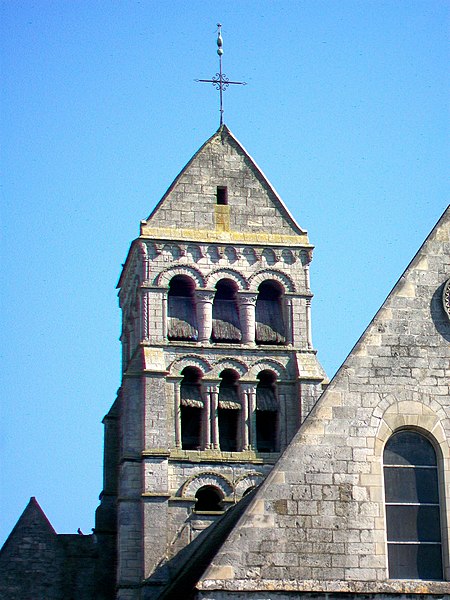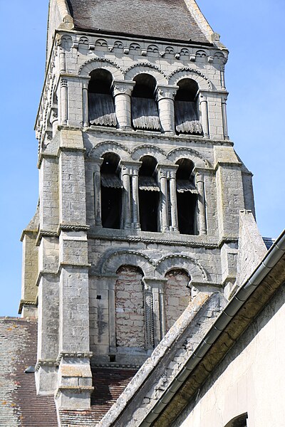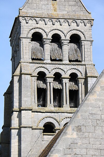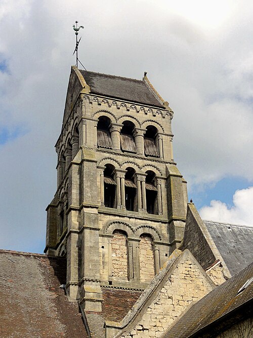 Le clocher roman, remarquable et considéré comme l'un des plus beaux de la vallée de l'Oise, compte trois étages avec respectivement deux et trois baies par face selon les niveaux, et se pare de cordons de billettes et de motifs en pointe-de-diamant ; les colonnettes et colonnes monolithes qui encadrent les arcatures portent des chapiteaux aux décors variés, et la corniche sommitale fait alterner petites arcatures plein cintre et corbeaux sculptés.