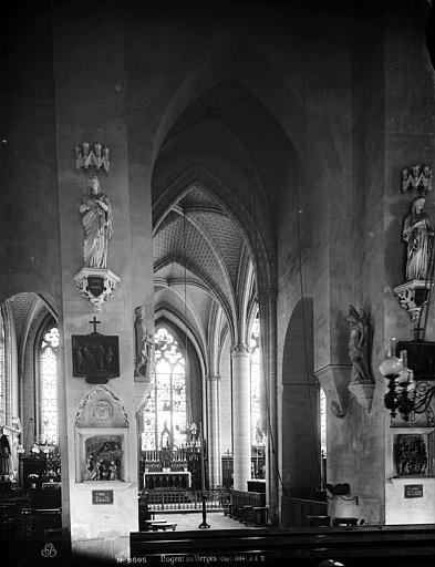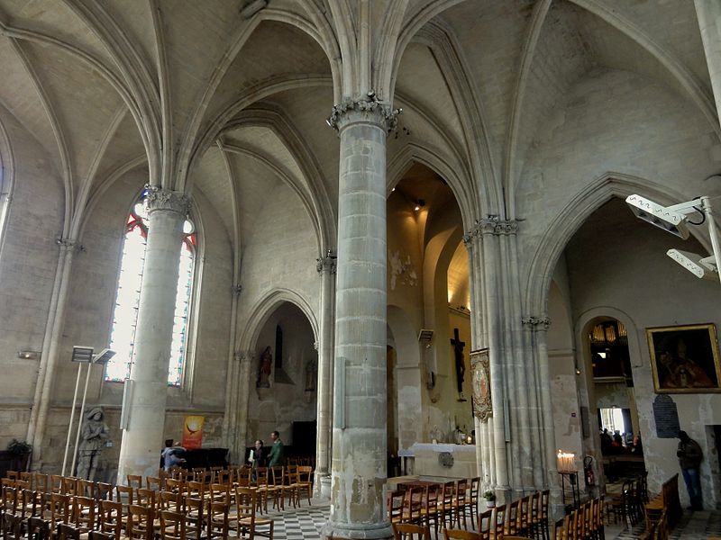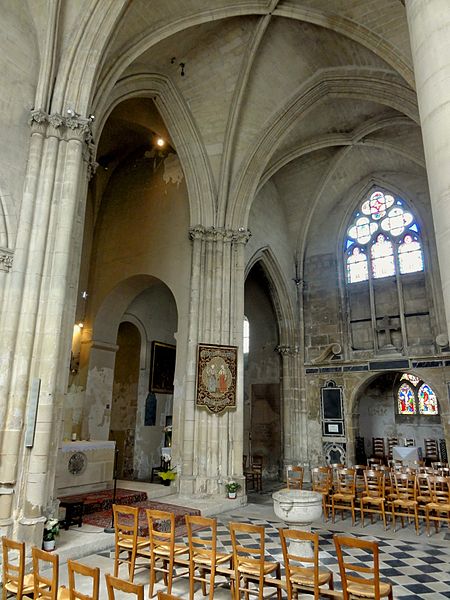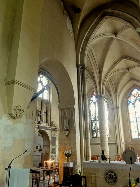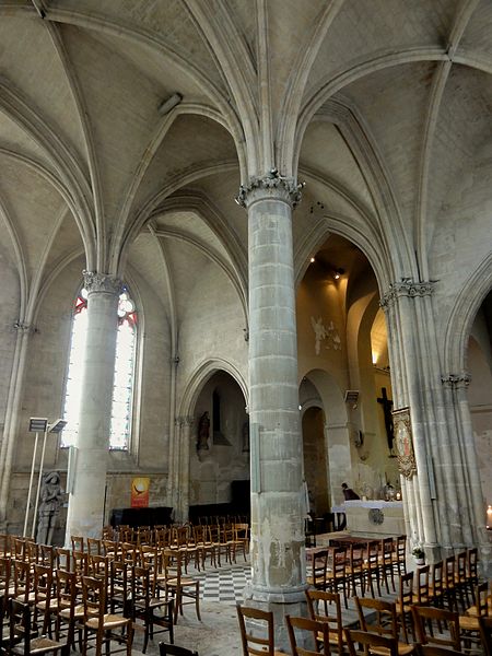 L'intérieur de la nef est sobre et peu orné ; elle est éclairée par trois petites baies plein cintre de chaque côté et coiffée d'une fausse voûte en berceau en bois plâtré. Le transept conserve une grande simplicité : les croisillons sont voûtés en berceau perpendiculairement à l'axe de l'édifice, la base du clocher a été renforcée dès le XIIe siècle et de petits oculi assurent l'éclairage latéral. Le chœur-halle, qui appartient à un groupe régional de chœurs-halle du nord du bassin parisien, combine des choix d'économie (clés de voûte non décorées, absence de formerets, soubassements de fenêtres nus) et une exécution d'une grande qualité ; cinq des six travées sont strictement identiques, voûtes et supports sont uniformes et les sept fenêtres présentent le même remplage à trois lancettes surmontées de trois oculi quadrilobés.