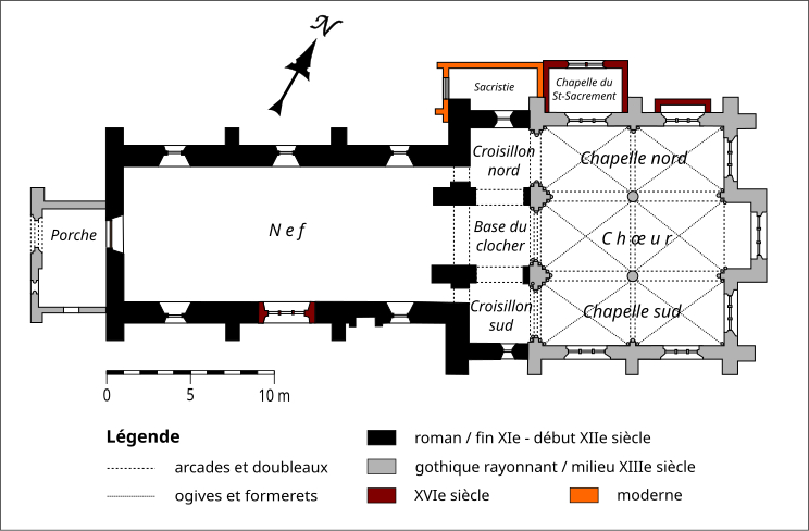 Orientée de façon irrégulière sud-ouest — nord-ouest, l'église se compose d'une nef romane de trois travées sans bas-côtés, d'un transept de la même époque supportant un clocher central et d'un chœur-halle gothique rayonnant de trois fois deux travées, d'une grande homogénéité et harmonie. Le porche qui précède le portail est désaxé vers la droite ; les croisillons du transept débordent largement sur la nef et communiquent avec elle par deux passages berrichons. Les toitures en bâtière du chœur recouvrent l'extrémité orientale des croisillons.
