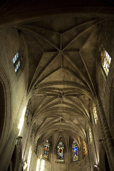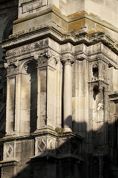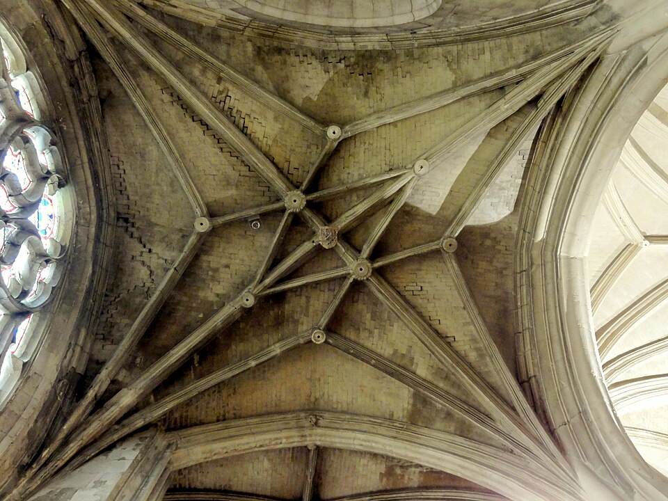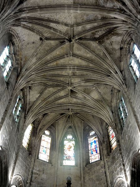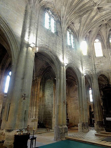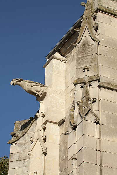 La façade occidentale reste le principal décor extérieur flamboyant, tandis que le clocher, marqué par des éléments de la Renaissance et une plate‑forme couronnée d’une coupole et d’un lanternon, contraste avec le reste de l’édifice. Les élévations latérales et le chevet reflètent l’organisation intérieure et l’emploi de contreforts simples et d’arcs‑boutants discrets. À l’intérieur, la lumière favorise nettement la nef grâce à la hauteur relative des collatéraux et au calcaire clair utilisé, alors que le chœur demeure plus réservé et tamisé.