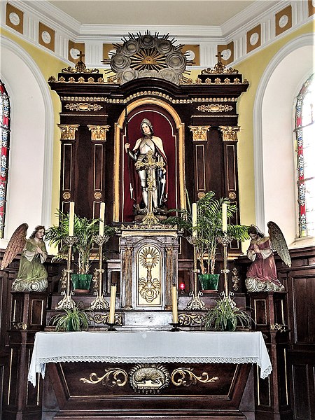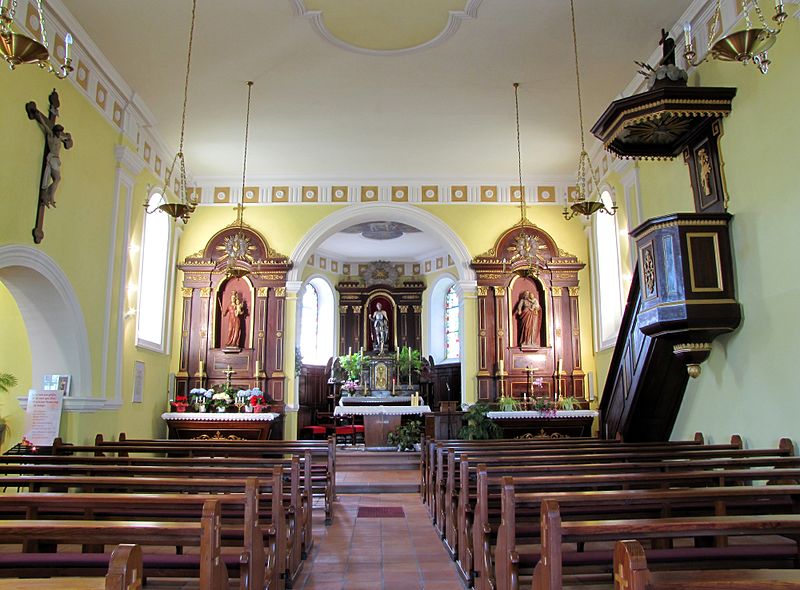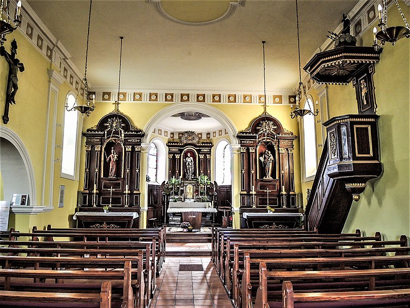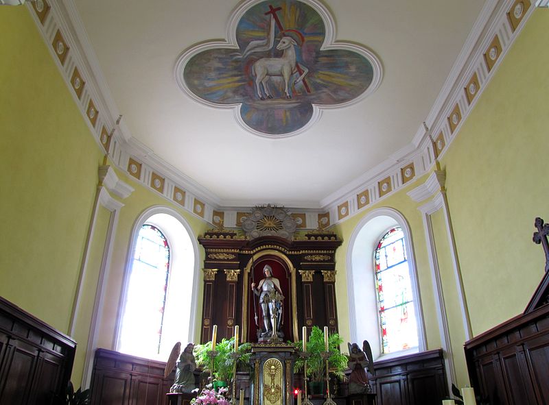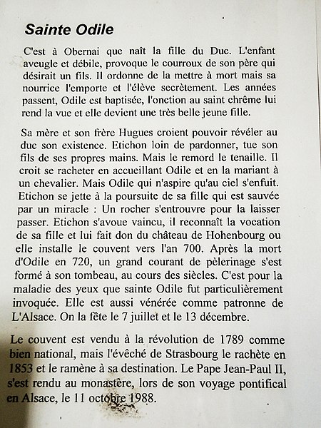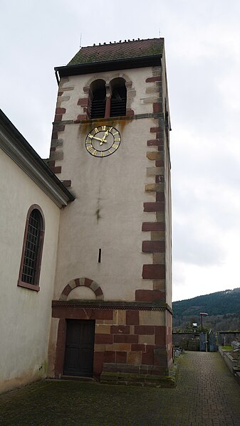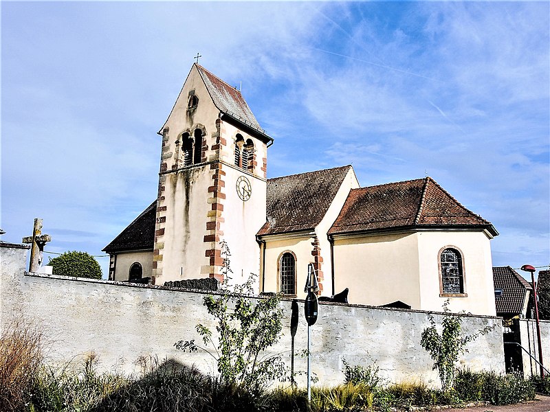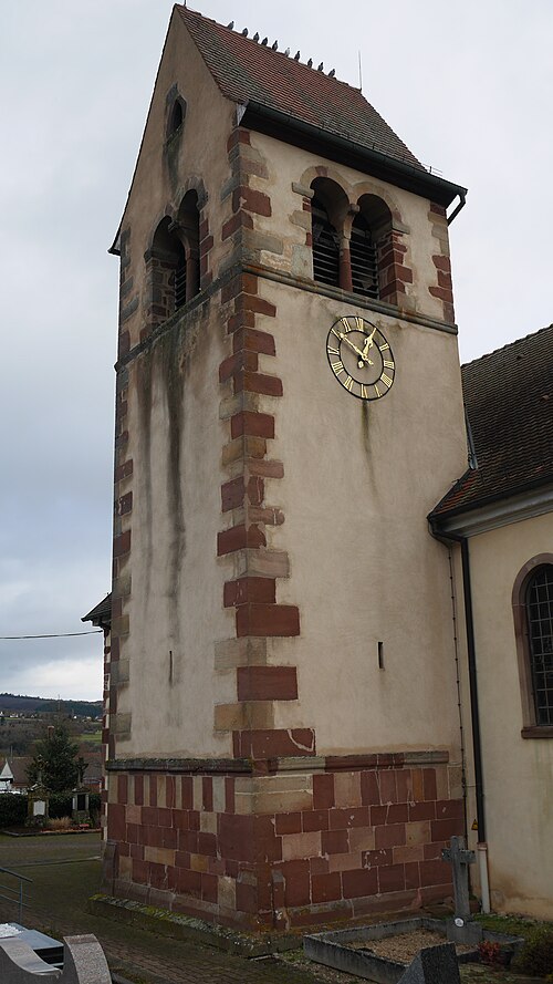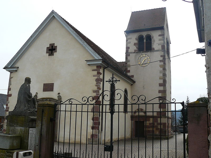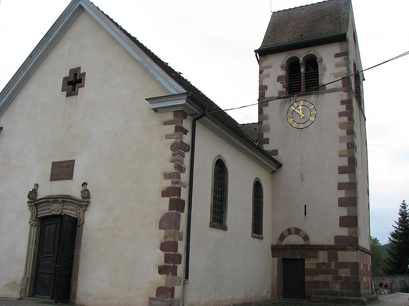 L'église catholique Sainte-Odile se situe à Wintzfelden, commune de Soultzmatt, dans le Haut-Rhin. L'édifice, inscrit au titre des monuments historiques depuis 1995, présente des éléments de plusieurs périodes. Elle est mentionnée dès 1336 comme filiale de la paroisse de Soultzmatt. La première église de Wintzfelden était dédiée à saint Georges ; depuis 1862 elle est consacrée à sainte Odile. L'église actuelle a été élevée en 1859, mais intègre des vestiges beaucoup plus anciens. Elle a conservé une tour datée de la seconde moitié du XIIe siècle, peut-être utilisée comme porche, et l'ancien chœur à chevet plat, aujourd'hui transformé en chapelle latérale. Ce chœur aurait été remanié au XIVe siècle, notamment par le percement d'une baie en arc brisé. Le clocher porte la date 1702 au sommet, vraisemblablement liée à une restauration. Un portail baroque au chambranle sculpté a été ajouté en 1778. En 1859, l'église, jugée en fort mauvais état, a vu la construction d'une nouvelle nef et d'un nouveau chœur, placés transversalement par rapport à l'ancienne nef. Les travaux furent dirigés par l'agent voyer du canton, Dicker, et la population participa au transport des matériaux ; la date 1859 est gravée à la base de l'élévation antérieure. Des pierres provenant du couvent de Schwartzenthann auraient été réemployées lors de ces travaux.