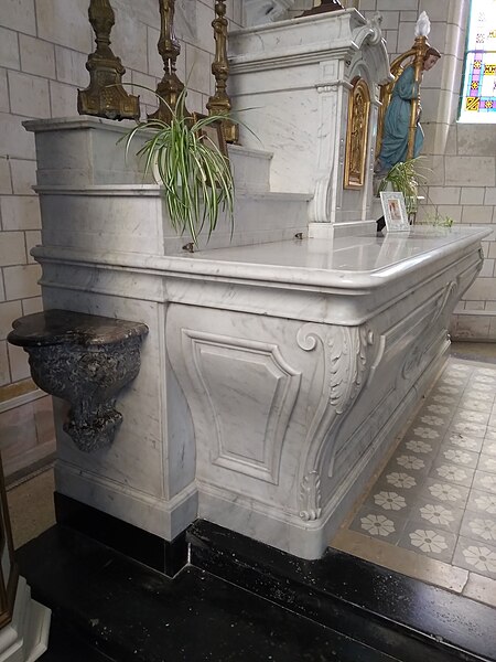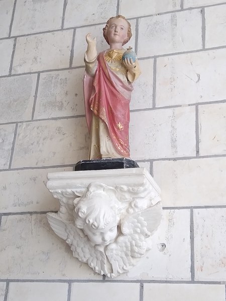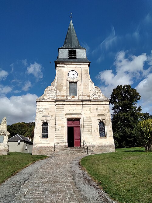 De plan rectangulaire, l'édifice présente une nef unique prolongée par un chœur en demi-cercle à trois pans et, sur la gauche, une chapelle seigneuriale. La façade-écran, en pierre et d'inspiration néo-classique avec des décors d'influence classique et baroque, s'organise sur deux niveaux. Elle ouvre par un portail encadré de pilastres, surmonté d'une haute fenêtre rectangulaire et d'une horloge, et coiffée d'un clocher en ardoise ; des fenêtres à sommet arrondi et des volutes complètent la composition, ainsi qu'un cadran solaire.