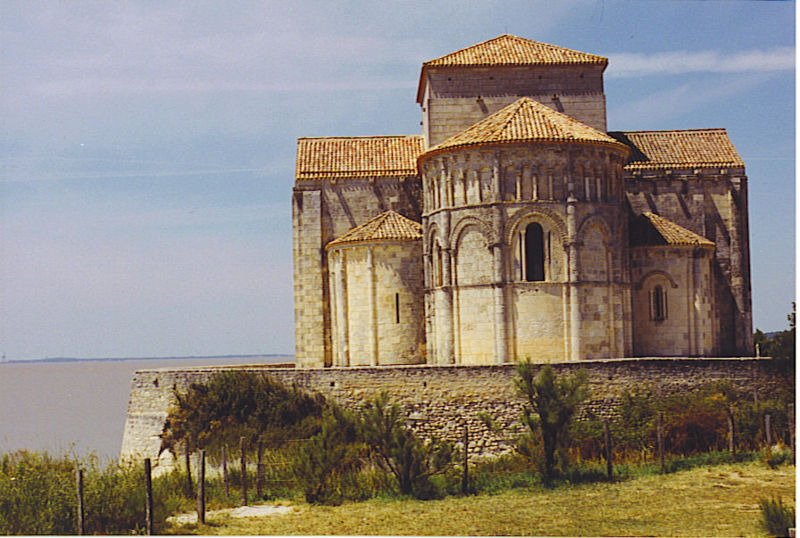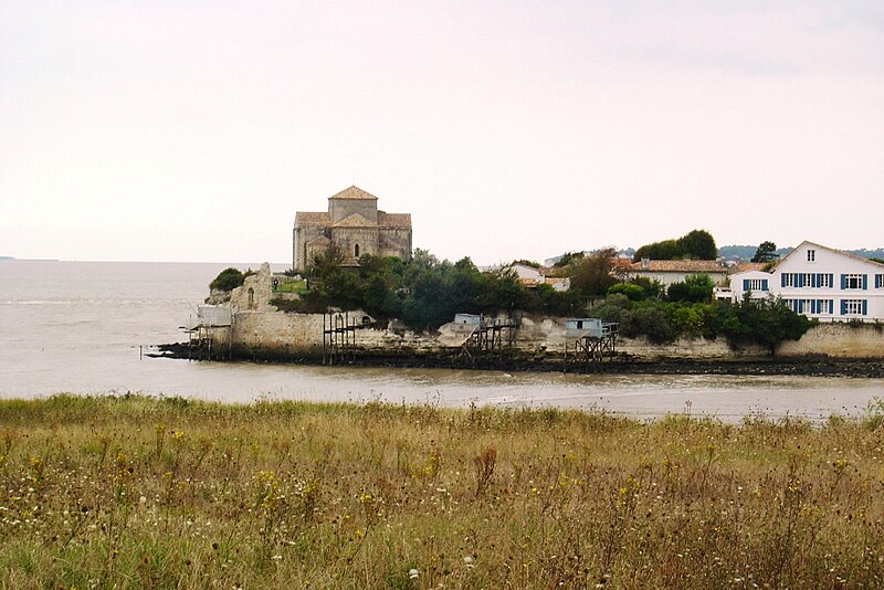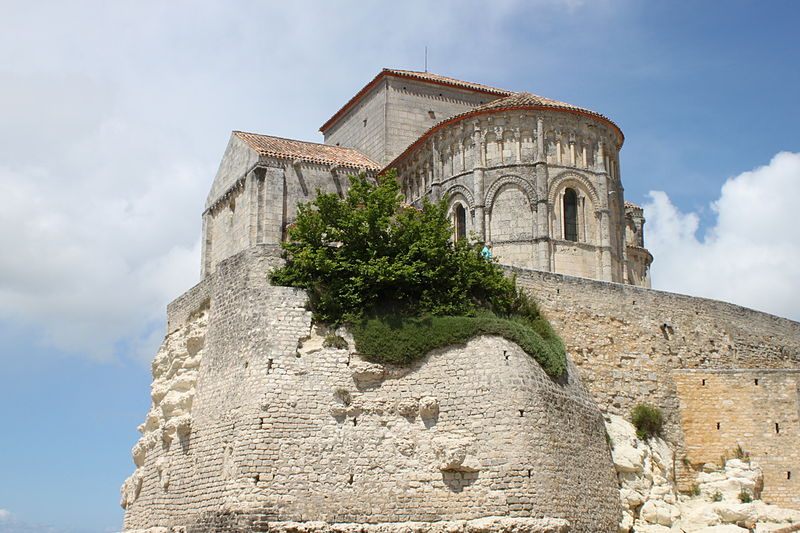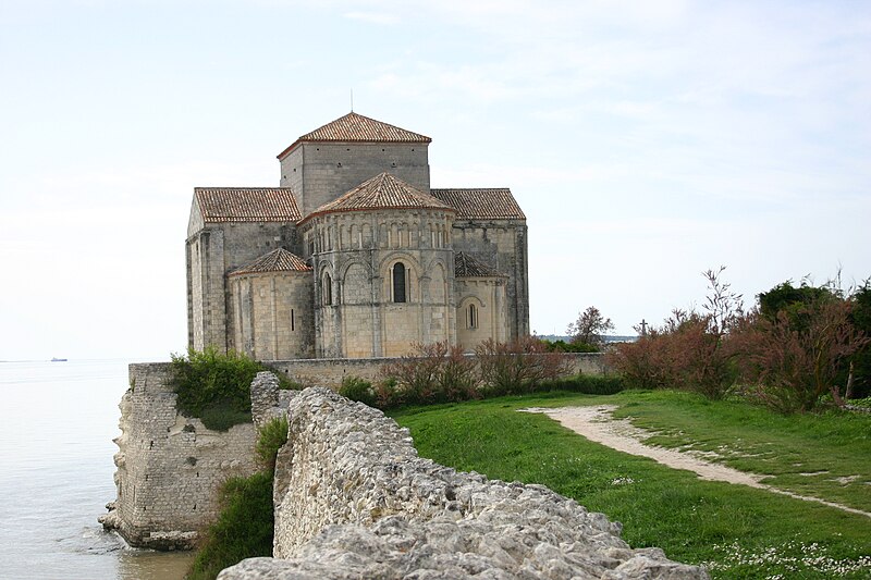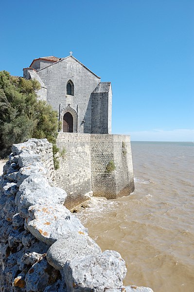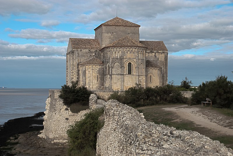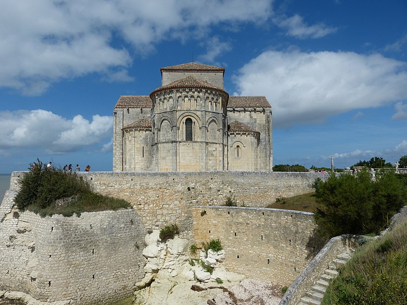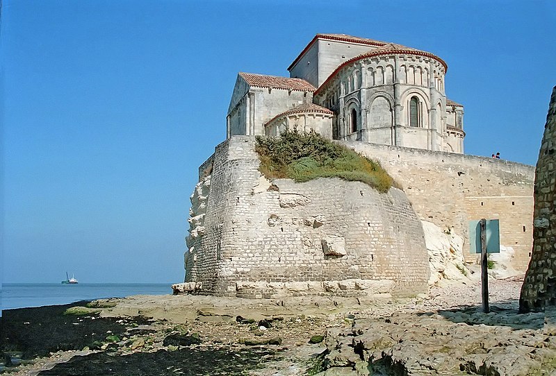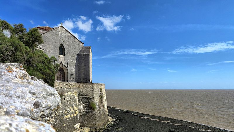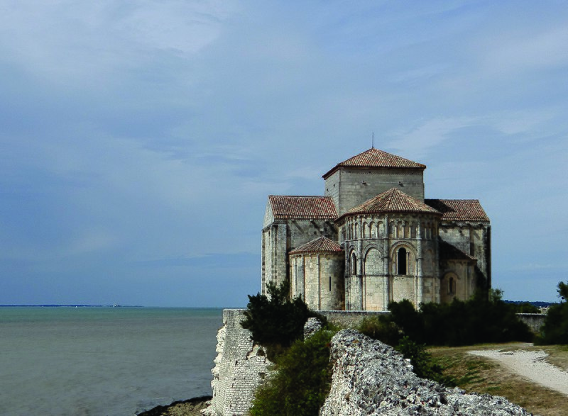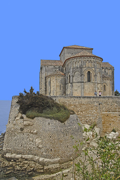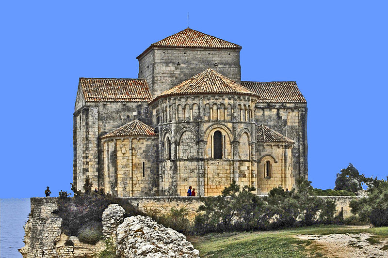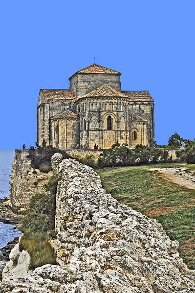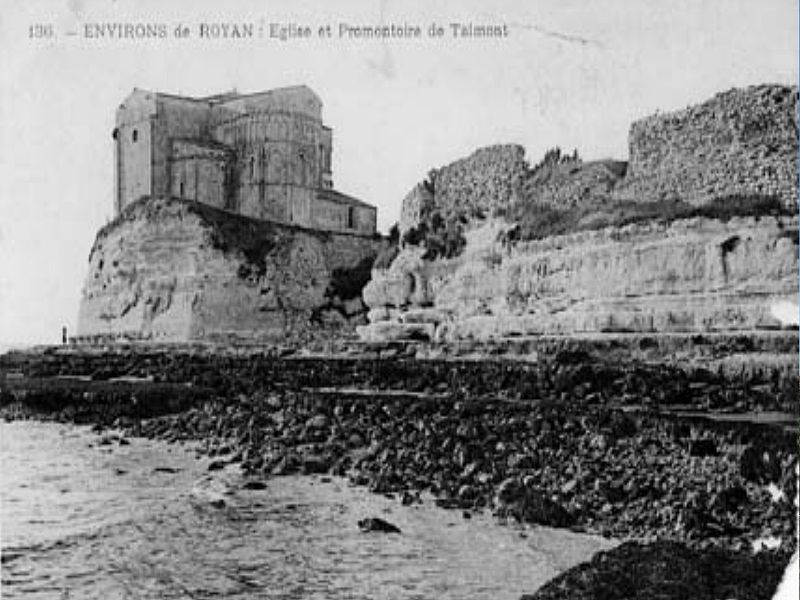 L'édifice a été élevé à partir du XIe siècle par les bénédictins de l'abbaye de Saint-Jean-d'Angély, qui en firent une halte possible sur une des voies de Saint-Jacques-de-Compostelle. Après la Via Turonensis jusqu'à Saintes, certains pèlerins auraient embarqué à Talmont pour gagner la basilique de Soulac et poursuivre vers Compostelle. Une plaque placée par la Société des amis de Saint-Jacques rappelle ce rôle, mais l'importance ou la réalité du pèlerinage manque de preuves antérieures au milieu du XXe siècle. La transformation du village en bastide par le roi d'Angleterre Édouard Ier entraîna la fortification d'une partie de l'église et la construction d'un chemin de ronde au-dessus de l'abside. Ce n'est pas la guerre mais une violente tempête qui provoqua l'effondrement d'une portion de la falaise, emportant les deux premières travées de la nef et une part de la crypte. Des travaux de consolidation suivirent et une façade gothique fut édifiée à l'ouest. L'église est classée monument historique depuis le 30 août 1890.