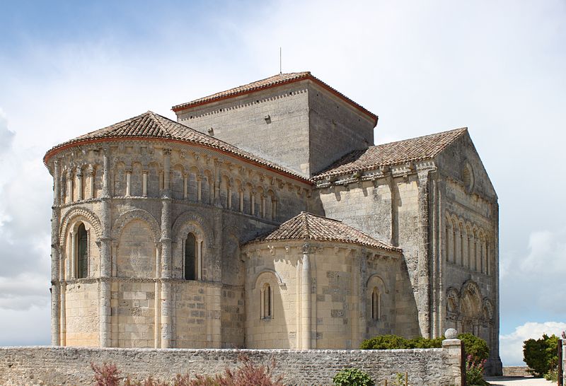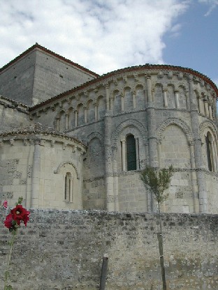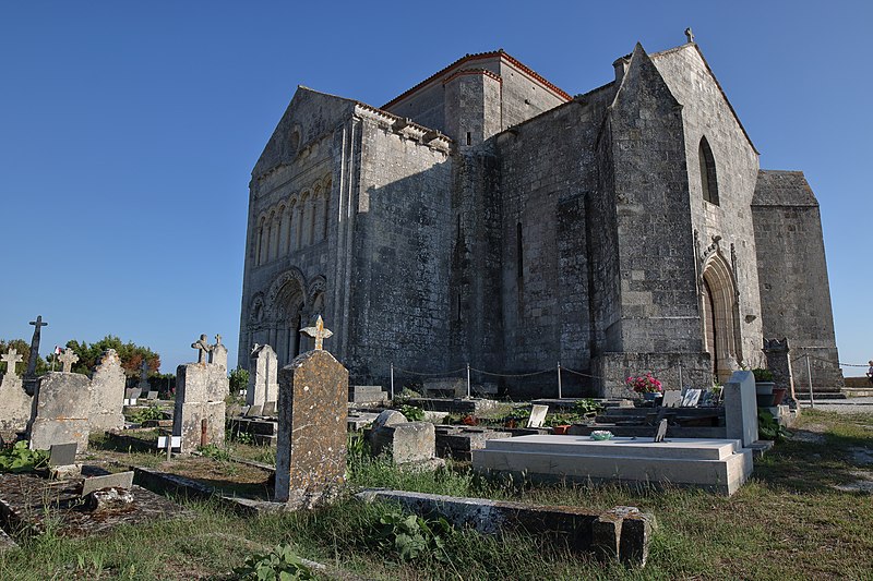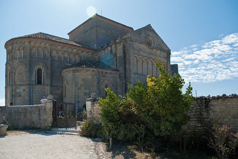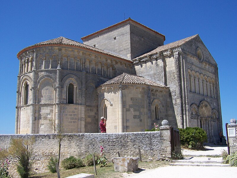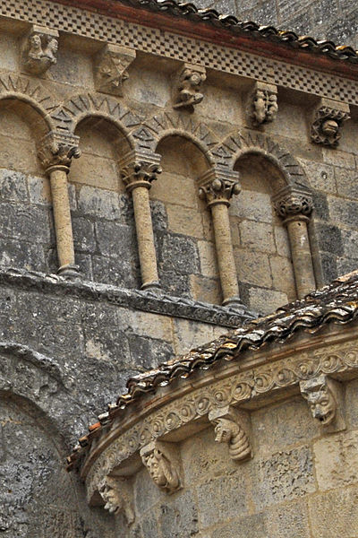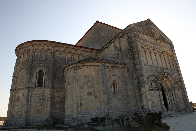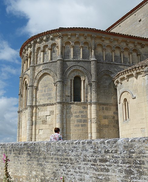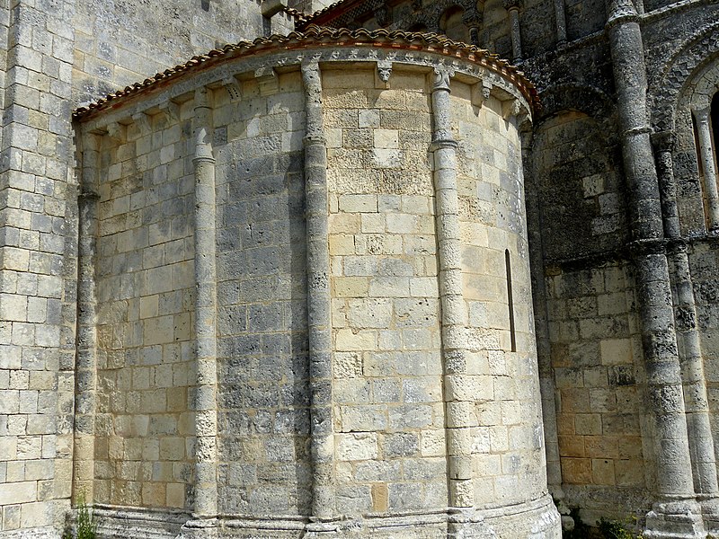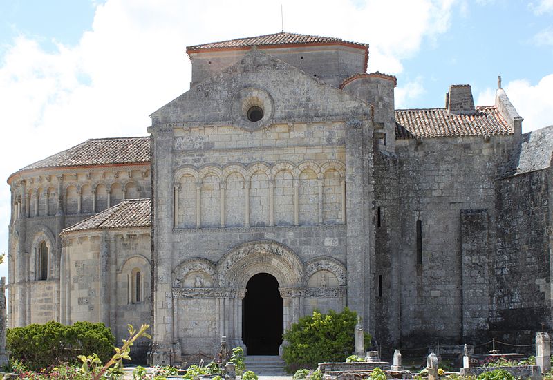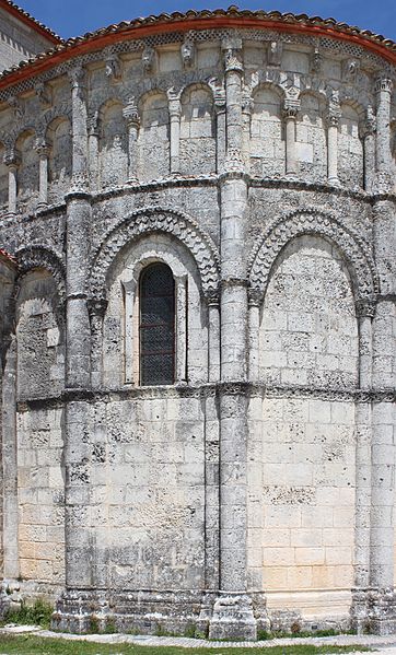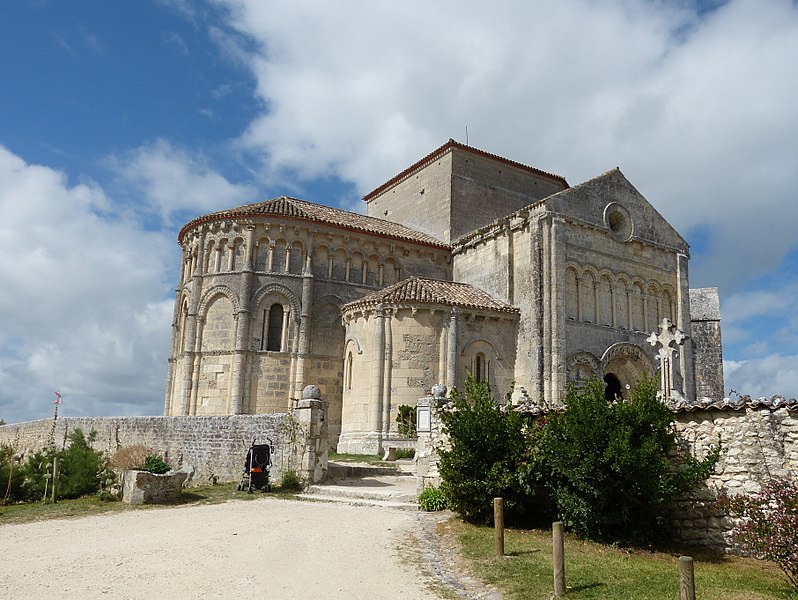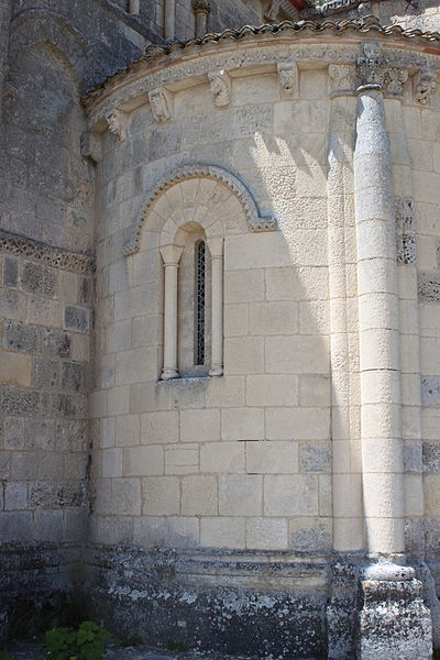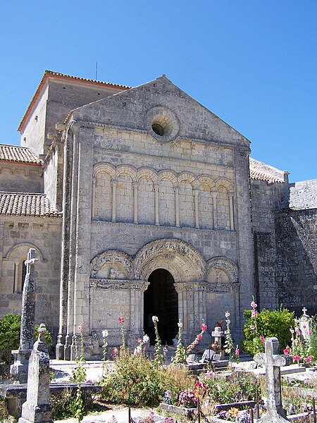 À l'extérieur, la façade latérale nord exemplifie le roman saintongeais et contraste avec la sobriété de la façade occidentale de style gothique et avec la face sud exposée aux intempéries. La façade nord se structure en trois registres : au bas un portail à trois voussures flanqué de deux arcades, au milieu une série de sept arcades supportées par des colonnettes et en haut un pignon percé d'un oculus. Les sculptures du portail fonctionnent comme des sermons illustrés : la voussure supérieure montre des hommes tirant un animal prisonnier, la voussure centrale représente des hommes portés les uns par les autres — image possible de la communauté chrétienne — et la voussure inférieure des anges honorant l'Agneau pascal. Les arcades latérales opposent l'enfer et le paradis : à gauche des dragons ailés amphicéphales, à droite des pampres de vigne symbolisant la vie nouvelle. Le chevet est divisé en cinq registres horizontaux par des contreforts-colonnes ; une partie du décor, notamment les modillons, a été refaite lors des restaurations engagées depuis les années 1960, et un cadran solaire gravé sur une colonnette porte la date de 1586.