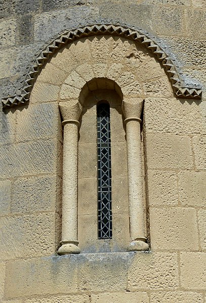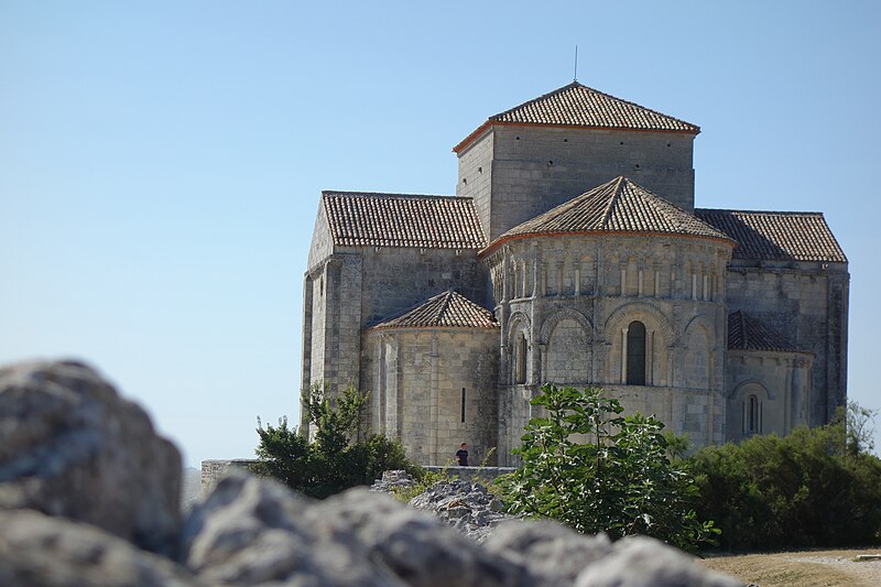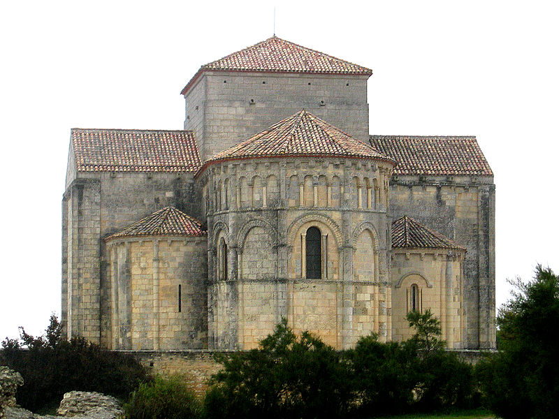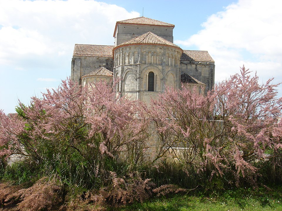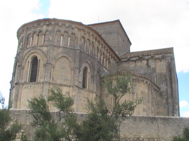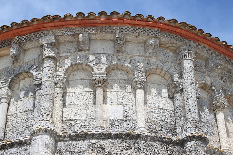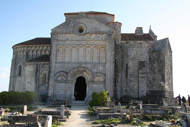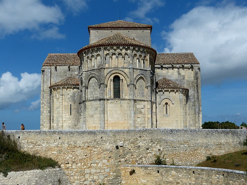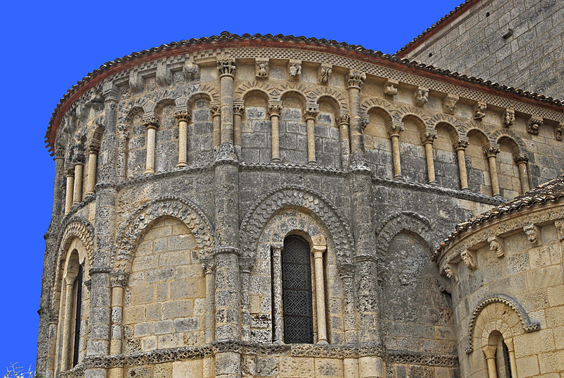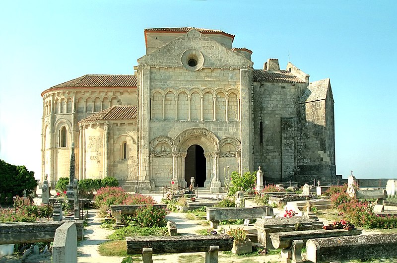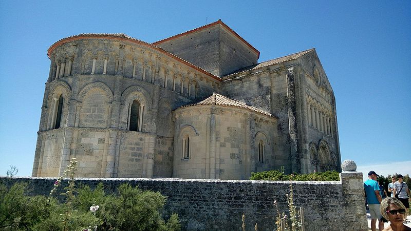 À l'extérieur, la façade latérale nord exemplifie le roman saintongeais et contraste avec la sobriété de la façade occidentale de style gothique et avec la face sud exposée aux intempéries. La façade nord se structure en trois registres : au bas un portail à trois voussures flanqué de deux arcades, au milieu une série de sept arcades supportées par des colonnettes et en haut un pignon percé d'un oculus. Les sculptures du portail fonctionnent comme des sermons illustrés : la voussure supérieure montre des hommes tirant un animal prisonnier, la voussure centrale représente des hommes portés les uns par les autres — image possible de la communauté chrétienne — et la voussure inférieure des anges honorant l'Agneau pascal. Les arcades latérales opposent l'enfer et le paradis : à gauche des dragons ailés amphicéphales, à droite des pampres de vigne symbolisant la vie nouvelle. Le chevet est divisé en cinq registres horizontaux par des contreforts-colonnes ; une partie du décor, notamment les modillons, a été refaite lors des restaurations engagées depuis les années 1960, et un cadran solaire gravé sur une colonnette porte la date de 1586.