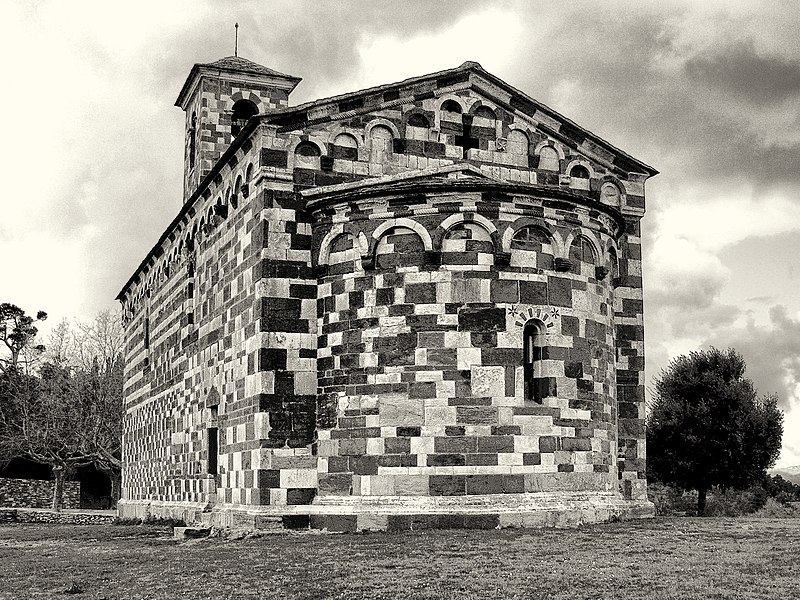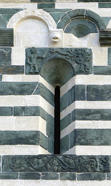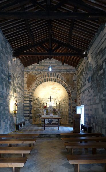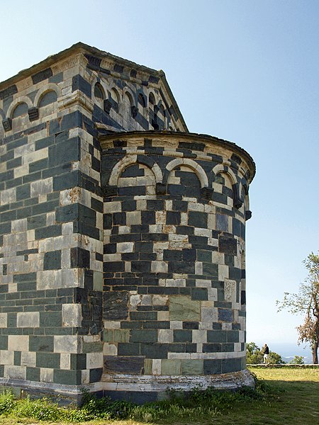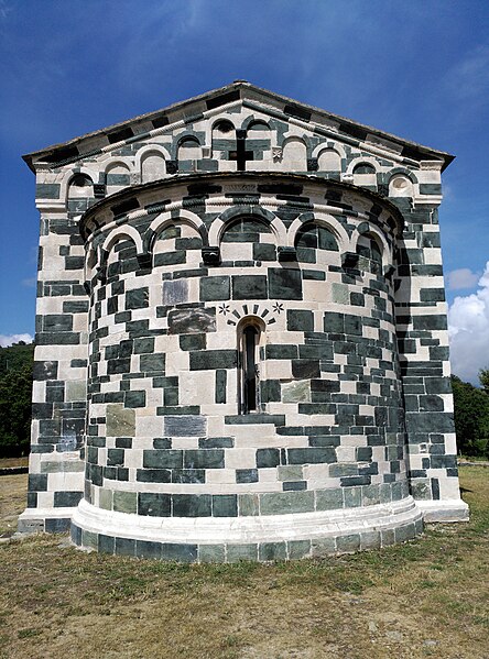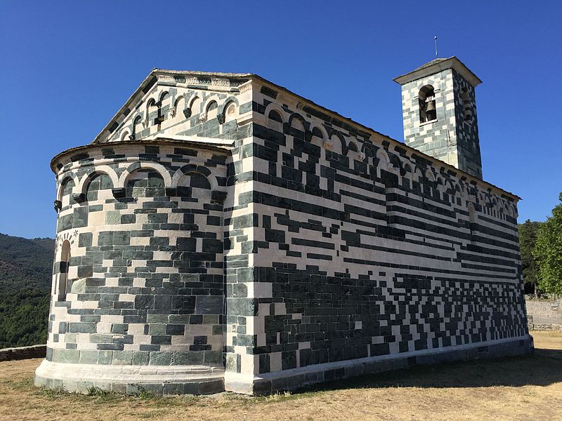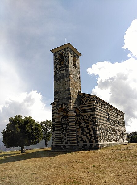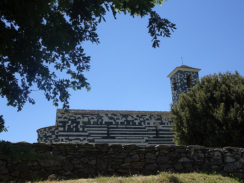De plan simple, elle comporte une nef unique prolongée par une abside semi-circulaire et s'inscrit sur l'axe est‑ouest traditionnel, l'abside étant à l'est. Le haut des murs est orné de lombardes et l'appareillage soigné met en valeur l'alternance des pierres claires et sombres. La façade occidentale est animée par un clocher-porche carré, soutenu par deux piliers cylindriques et par de lourdes colonnes appareillées en alternance claire et sombre ; ce clocher-porche a été surélevé au XIXe siècle et comporte, au-dessus de la porte principale, trois arcatures doubles aux claveaux alternés, l'arcature de droite étant moulurée de plusieurs tores. Le linteau de la porte provient de l'ancienne église principale de la pieve de Bevinco. La façade sud présente une porte latérale ; les façades nord et sud sont équipées chacune de deux fenêtres-meurtrières. La partie haute du chevet comporte une petite ouverture en forme de croix grecque et l'abside possède elle aussi une fenêtre-meurtrière.