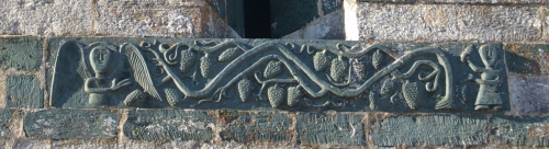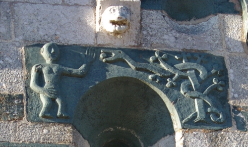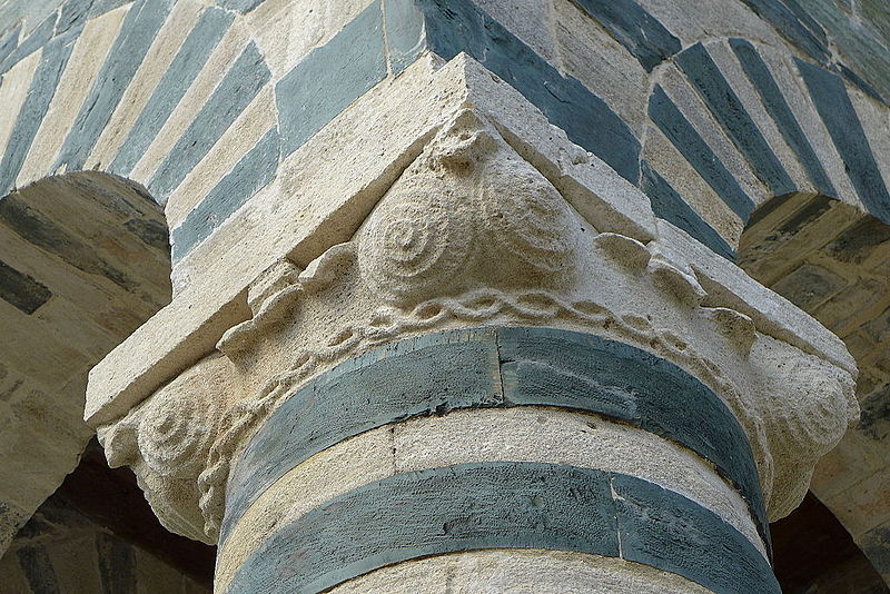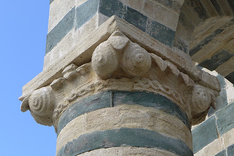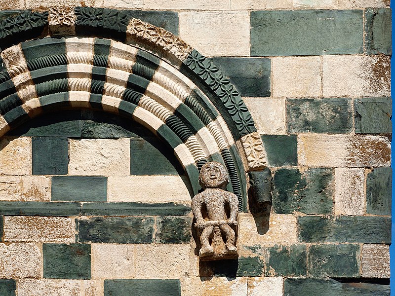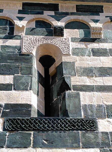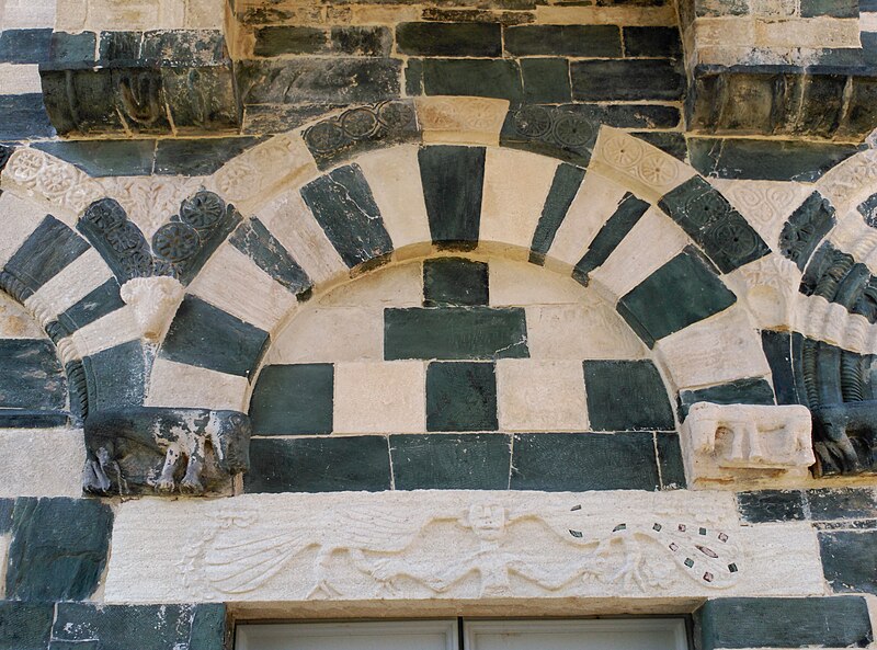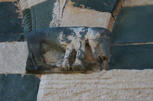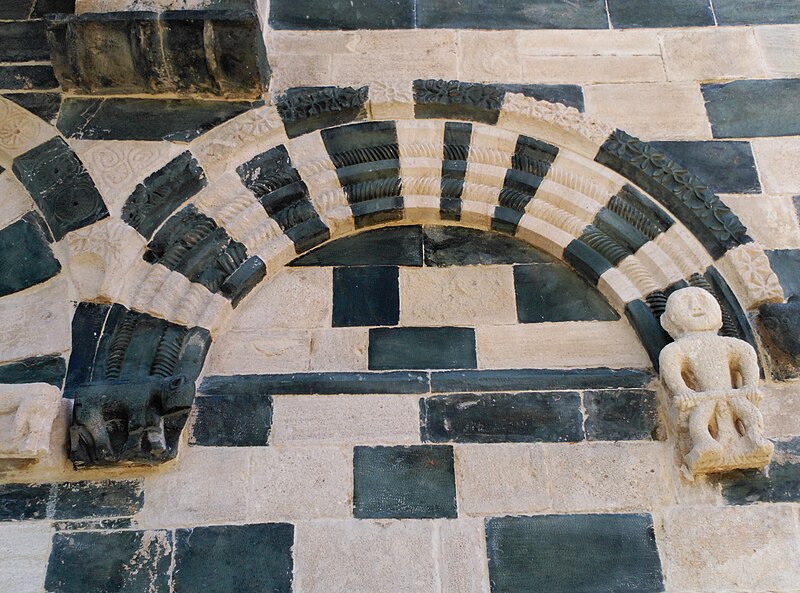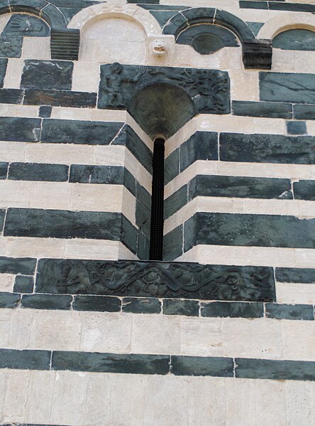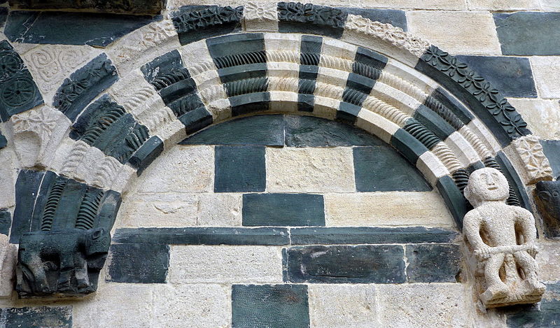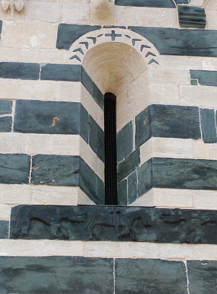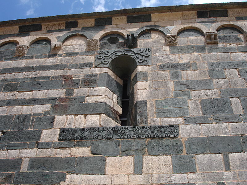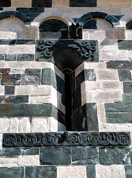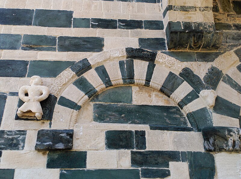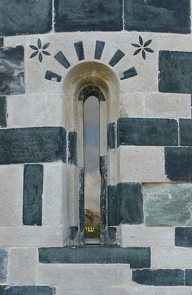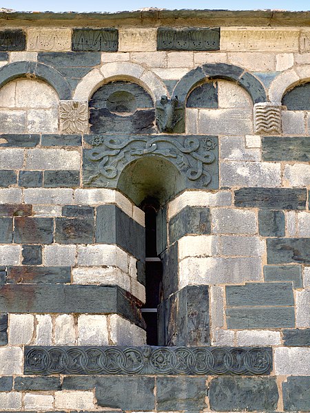 Les décors sculptés sont particulièrement riches et variés : modillons figurant des personnages et des animaux, une frise d'arcatures dont les bases sont sculptées de motifs divers tels que gerbes de blé, pièces, main coupée ou ciseaux, ainsi que des linteaux et entrelacs de serpents ornant les fenêtres. Une fenêtre de la façade sud présente une architrave monolithique creusée d'un petit arc et décorée d'un plat‑relief représentant deux serpents entrelacés, gueules ouvertes, faisant face à deux oiseaux, avec des étoiles entrelacées dans les angles supérieurs ; les modillons voisins montrent notamment un batracien bicéphale et une fleur stylisée. La fenêtre de l'abside, sans sculpture, est incrustée de pierres sombres formant deux rosaces et un arc de décharge. Les modillons sculptés d'animaux évoquent les décors de l'église de la Trinité d'Aregno.