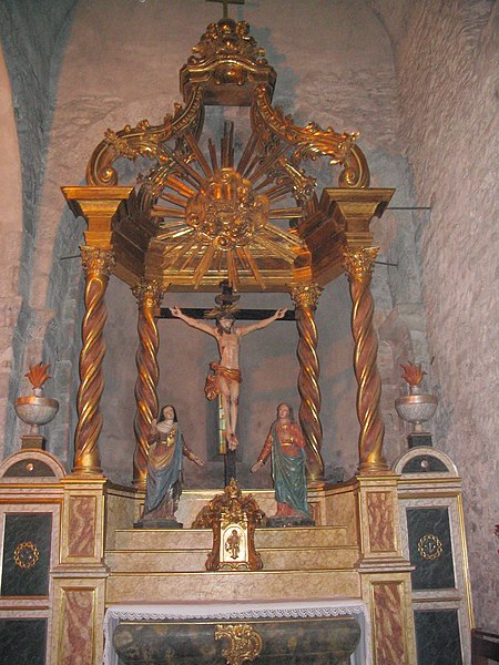 L’église Sainte‑Croix de Quercorb (Santa Creu) est un édifice préroman situé à Fontanils, ancienne commune rattachée en 1823 à Arles‑sur‑Tech, dans les Pyrénées‑Orientales. Le lieu nommé Santa Creu de Quercob est mentionné dès 832 ; Castro corbi apparaît dans les sources en 852, tandis que d’autres formes toponymiques sont attestées en 1158 et en 1571. Le mot roman quer désigne un rocher ou un lieu fortifié et corb dérive du latin Curvum, « courbe ». Selon Jean Sagnes, ces mentions rappellent l’existence d’un château au sommet du roc à l’est de l’église à l’époque carolingienne ; pour Lluís Basseda, la chapelle Sainte‑Croix était alors flanquée de fortifications et d’une petite cellera. L’édifice actuel a été construit entre les Xe et XIe siècles ; son chevet appartient à l’époque préromane et l’arc triomphal a été remanié à l’époque romane. L’église, ainsi que la parcelle sur laquelle elle repose, est protégée au titre des monuments historiques. Orientée, elle présente une nef unique et un chevet plat au plan légèrement trapézoïdal ; un embryon de transept se lit par la présence de deux arcs formerets, et une chapelle a été greffée côté sud. Contrairement à la plupart des églises préromanes, les murs gouttereaux convergent ici vers l’ouest plutôt que vers l’est. La nef est couverte d’un berceau plein cintre ; le chœur, surélevé de trois marches, reçoit un berceau surbaissé très bas qui était autrefois éclairé à l’est par une baie préromane caractéristique munie d’un linteau monolithe échancré en demi‑lune. La porte d’entrée sud, en arc plein cintre, est montée en blocs de grès taillés et dépourvue d’ornement ; elle date des XVIIe ou XVIIIe siècles. Sur le mur pignon est de la travée de chœur s’élève un clocher à deux arcades ; après un séisme au XVe siècle il avait été occulté puis, au XVIIIe siècle, surmonté d’un clocheton à une seule arcade. Des travaux menés en 1986 lui ont donné son aspect actuel.