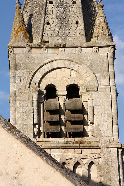 La base du clocher, de plan carré, abrite une baie romane haute et fortement ébrasée ; sa voûte d’ogives, discutée par les auteurs, repose sur des culs‑de‑lampe moulurés implantés aux angles. L’étage intermédiaire du clocher est orné d’arcatures plaquées en plein cintre reposant sur des colonnettes à chapiteaux sculptés, tandis que l’étage de beffroi s’ouvre par des baies gémelées encadrées de colonnettes et surmontées d’un arc de décharge. La flèche est octogonale, en pierre, percée de trous de boulin et cantonnée de clochetons.
