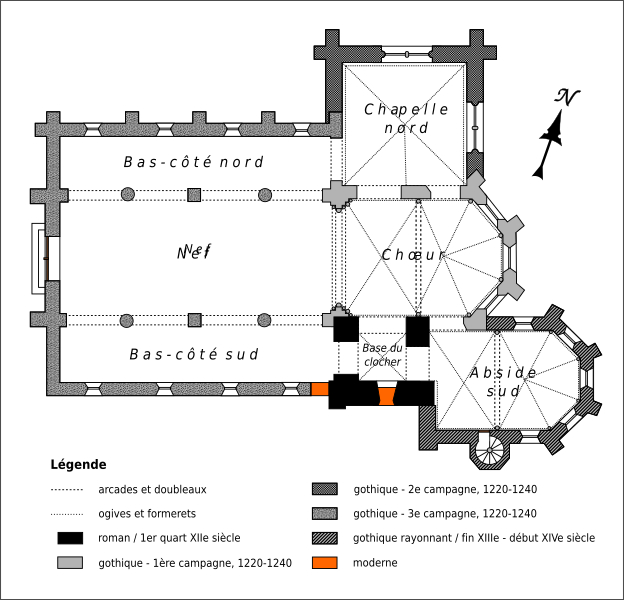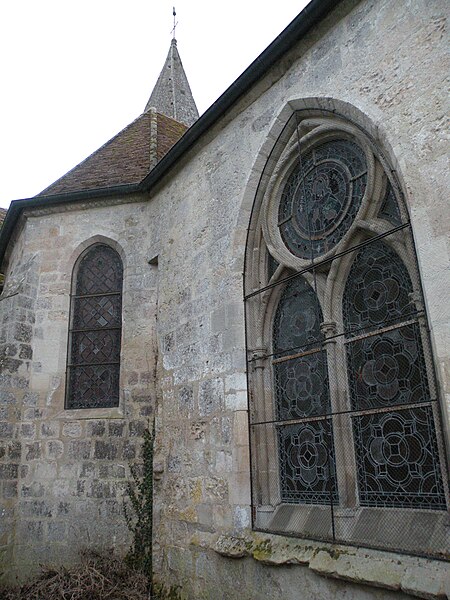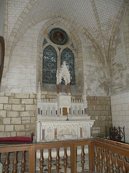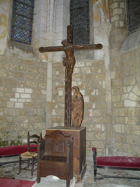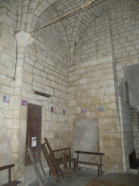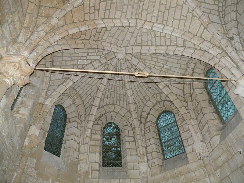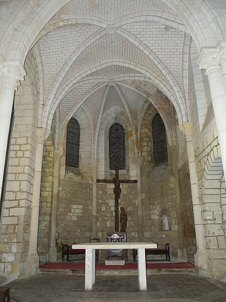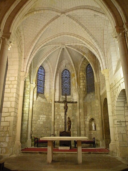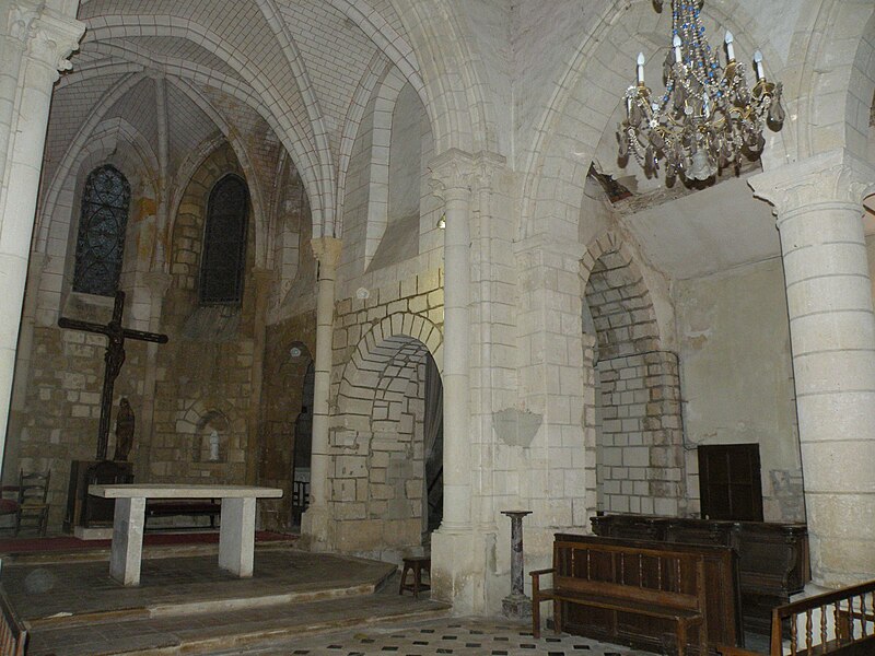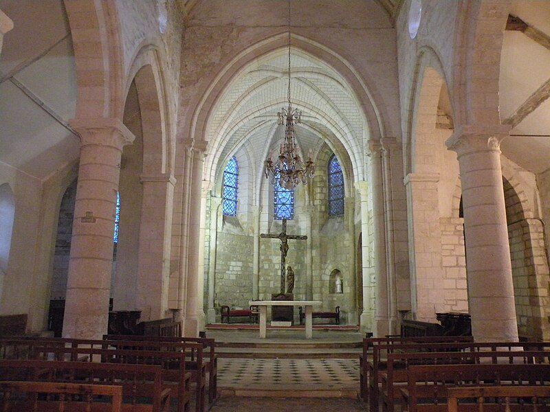 Les bas‑côtés sont éclairés par des lancettes en arc brisé et bordés de bancs de pierre. L’arc triomphal ouvre sur un chœur stylistiquement proche de la nef mais légèrement dévié sur son axe ; ses voûtes d’ogives retombent sur des faisceaux de colonnettes à chapiteaux et sur des tailloirs à bec typiques de la première période gothique. Le chevet conserve trois fenêtres en tiers‑point et une ancienne piscine liturgique. Plusieurs percements et transformations intérieures résultent de restaurations anciennes, dont certaines—en particulier celles de 1925 concernant l’abside méridionale—ont été vivement critiquées pour leur exécution et leurs joints en ciment.