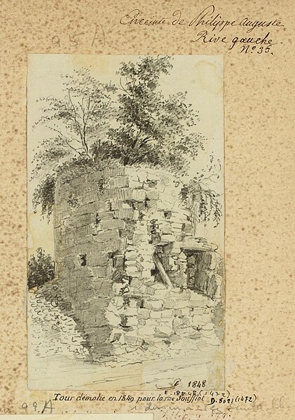 L'enceinte de Philippe-Auguste est un système de fortification urbaine construit à Paris à partir de la fin du XIIe siècle ; elle est la plus ancienne enceinte médiévale dont le tracé soit connu avec précision. Édifiée pour protéger la capitale pendant les luttes avec la dynastie des Plantagenêt, elle visait à prévenir des attaques venant surtout du nord et de l'ouest et fut ordonnée avant le départ du roi pour la troisième croisade. La muraille, initialement dépourvue de fossé extérieur, fut d'abord bâtie sur la rive droite puis sur la rive gauche en raison des enjeux stratégiques et de la construction du château du Louvre. Cet ouvrage accompagna le développement urbain : Philippe-Auguste encouragea l'urbanisation des quartiers inclus dans la nouvelle enceinte, procéda à des transferts de foires et concéda des clos pour lotir des habitations, contribuant à faire de Paris un centre politique et culturel. La rive droite, longue de 2 850 mètres, et la rive gauche, longue de 2 535 mètres, enfermaient un espace de 253 hectares peuplé d'au moins 50 000 habitants à la fin du règne. Le coût des travaux est partiellement connu : un mémoire indique 7 020 livres pour la rive gauche à la charge du Trésor royal, tandis que la rive droite, sans document précis, fut plus onéreuse et impliqua vraisemblablement les bourgeois aux côtés de l'administration royale ; l'ensemble du programme de fortifications, incluant le Louvre et les châtelets, atteint au moins 20 000 livres. L'enceinte comprenait un rempart crénelé de six à huit mètres de hauteur (jusqu'à neuf avec le parapet) et d'une épaisseur de quatre à six mètres à la base, construit en moyen appareil et pourvu d'un chemin de ronde d'environ deux mètres. Elle était flanquée de 73 tours semi‑cylindriques intégrées à la courtine — 39 en rive droite et 34 en rive gauche — plus quatre tours d'extrémité face à la Seine, espacées en moyenne de 55 à 60 mètres mais avec des intervalles variables selon les secteurs. Les tours, d'environ six mètres de diamètre hors murailles et hautes d'une quinzaine de mètres, comportaient trois niveaux et une terrasse sommitale ; quatre grosses tours de 25 mètres et 10 mètres de diamètre, situées aux jonctions avec la Seine, permettaient de contrôler la navigation et d'y tendre des chaînes. À l'origine l'enceinte était percée de quatorze portes principales et de plusieurs poternes ; d'autres ouvertures furent ajoutées au XIIIe siècle en raison de l'expansion urbaine et de la saturation du trafic. Les portes de la rive droite étaient de forme quadrangulaire et flanquées de tours, tandis que celles de la rive gauche formaient de petits châtelets débordant vers l'intérieur et furent renforcées au milieu du XIVe siècle. Par la suite, des adaptations défensives furent entreprises : creusement de fossés devant la muraille, creusement d'arrière‑fossés sur certaines sections, inondation de secteurs au même niveau que la Seine, renforcement des portes par barbacanes et construction de chemins de ronde intérieurs pour l'artillerie. Malgré l'édification au XIVe siècle de l'enceinte de Charles V qui engloba la rive droite, la muraille de Philippe-Auguste ne fut pas démolie et restait au XVe siècle réputée très solide. À partir du XVIe siècle, les terrains de l'ancienne enceinte furent progressivement vendus ou loués, entraînant le démantèlement de larges portions ; les fossés proches de la Seine furent couverts puis comblés au XVIIe siècle et les dernières portes furent rasées dans les années 1680, rendant l'enceinte largement invisible. La Cité étant au centre, l'enceinte renfermait plusieurs bourgs et quartiers alors distincts, notamment au nord le Beau Bourg, Tiboust, Saint‑Germain‑l'Auxerrois et les Champeaux avec le marché des Halles, ainsi que le cimetière des Innocents, et au sud le bourg Sainte‑Geneviève. Son tracé traversait les actuels 1er, 4e, 5e et 6e arrondissements et a laissé une empreinte durable sur la voirie : sur la rive droite, l'orientation en biais de rues comme la rue Jean‑Jacques‑Rousseau et la rue des Jardins‑Saint‑Paul évoque l'ancien rempart, et sur la rive gauche plusieurs rues formées sur d'anciens fossés conservent la mémoire du tracé, notamment la rue des Fossés‑Saint‑Bernard, la rue des Fossés‑Saint‑Jacques et la rue Monsieur‑le‑Prince. Le détail topographique comprenait de nombreuses portes et poternes repérables par des alignements de voies et des noms de rues, ainsi que des fausses portes et ouvertures secondaires. De très nombreux vestiges subsistent, souvent intégrés à des bâtiments privés ou masqués par des constructions ultérieures, ce qui rend leur repérage difficile ; vingt portions sont classées au titre des monuments historiques depuis 1889. Parmi les vestiges accessibles ou identifiables figurent des tronçons consolidés à l'angle de la rue Charlemagne et de la rue des Jardins‑Saint‑Paul (la plus longue portion visible d'environ 60 mètres), des tours et courtines visibles dans des cours, caves ou gymnases, des bases de tours mises au jour lors de fouilles et des traces dans la voirie ou l'alignement des immeubles. Ces vestiges, parfois difficiles d'accès, témoignent de l'importance architecturale et urbaine de l'enceinte, qui a modelé durablement le plan de Paris médiéval et moderne.