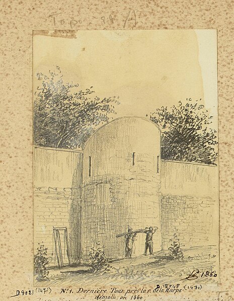 L'enceinte de Philippe-Auguste, réalisée à la fin du XIIe siècle pour mettre Paris à l'abri d'attaques imprévues, est la première fortification connue dont le tracé est précisément identifiable et qui englobe pour la première fois les deux rives de la Seine. Elle répondait au contexte des luttes avec la dynastie angevine ; la forteresse du Louvre, flanquant l'enceinte à l'ouest, constituait la pièce maîtresse d'une défense tournée vers un assaillant attendu depuis l'ouest. La muraille a été édifiée en priorité sur la rive droite, puis sur la rive gauche, et a incorporé des marchés et quartiers jusque-là extra-muros, comme le futur emplacement des Halles sur la rive droite ; elle enferma aussi le quartier Latin sans intégrer certains bourgs développés autour des abbayes. Construite en pierre, la défense se composait de deux parements en moyen appareil reliés par un blocage de moellons et de mortier ; son épaisseur était d'environ trois mètres et sa hauteur moyenne d'environ neuf mètres. Le sommet formait un chemin de ronde dallé, protégé par un parapet crénelé, et la courtine était flanquée à intervalles réguliers de tours semi-cylindriques. Treize portes ouvraient initialement sur la ville ; elles étaient encadrées par de puissantes tours et fermées par des vantaux de chêne bardés de fer. Au total, l'enceinte comportait un grand nombre de tours — 73 au total selon les comptes — et quatre tours d'extrémité importantes, implantées au contact de la Seine pour contrôler la navigation et, au besoin, servir de points d'ancrage à des chaînes destinées à fermer le fleuve. L'ouvrage a été utilisé pendant plus d'un siècle et demi ; au cours du XIVe siècle la rive droite fut doublée et partiellement englobée par l'enceinte de Charles V, tandis que la rive gauche conserva la muraille de Philippe-Auguste plus longtemps. Pour faire face aux nouvelles techniques de siège, le mur fut ensuite adapté : creusement de fossés et arrière-fossés, inondations contrôlées sur certaines portions, renforcement des portes par des barbacanes et installation de cheminements intérieurs pour l'artillerie. À partir du XVIe siècle, des démolitions partielles, la vente et la location des terrains d'enceinte et la transformation des fossés en égouts entraînèrent la disparition progressive des élévations ; au XVIIe siècle les fossés furent recouverts puis remblayés et les dernières portes furent rasées dans les années 1680, rendant l'enceinte largement invisible dans le tissu urbain. L'empreinte de la fortification reste cependant sensible dans la morphologie de la ville : l'orientation de certains alignements et la trace de rues adossées à l'ancien rempart témoignent de son influence sur l'urbanisation médiévale, notamment sur la rive droite et le long des anciens fossés rive gauche (rues des Fossés-Saint-Bernard, des Fossés-Saint-Jacques, Monsieur-le-Prince, etc.). De nombreux vestiges subsistent, souvent intégrés à des constructions postérieures et parfois inaccessibles parce que situés sur des propriétés privées ; la portion la plus longue encore visible se trouve à l'angle de la rue Charlemagne et de la rue des Jardins-Saint-Paul. Vingt portions de l'enceinte sont classées au titre des monuments historiques depuis 1889, et des découvertes archéologiques continuent d'en préciser les éléments et l'implantation dans plusieurs arrondissements de Paris.