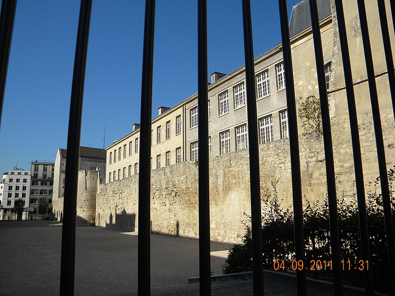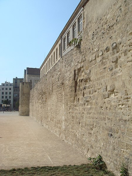 L'enceinte de Philippe-Auguste est un système de fortification urbaine construit à Paris à partir de la fin du XIIe siècle ; elle constitue la deuxième enceinte médiévale et la plus ancienne dont on connaisse le tracé avec précision. Édifiée dans le contexte des luttes entre Philippe Auguste et la dynastie des Plantagenêt, sa construction fut ordonnée pour prémunir la ville contre des attaques, notamment venues du nord et de l'ouest, avant le départ du roi pour la troisième croisade. La rive droite fut fortifiée en premier puis la rive gauche, et l'enceinte englobait un espace de 253 hectares peuplé d'au moins 50 000 habitants à la fin du règne. À l'origine dépourvue de fossé extérieur du fait de la proximité des voiries, elle fut ensuite adaptée par des aménagements défensifs. Le rempart, crénelé et doté d'un chemin de ronde, mesurait entre six et huit mètres de hauteur, parfois neuf avec le parapet, pour une épaisseur de quatre à six mètres à la base. Il était flanqué de 73 tours semi‑cylindriques intégrées à la courtine et de quatre tours majeures au contact de la Seine, destinées à contrôler la navigation fluviale et à servir de points d'attache pour de fortes chaînes. Quatorze portes principales furent aménagées à l'origine, complétées au fil du temps par d'autres portes et de nombreuses poternes ; les portes principales étaient protégées par des tours talutées, des vantaux et des herses. Pour renforcer la défense, on creusa ultérieurement un large fossé au-devant du mur, parfois complété par un arrière‑fossé, on utilisa les déblais pour consolider l'arrière du mur, on inonda certaines sections au niveau de la Seine et l'on ajouta des barbacanes, herses et ponts, ainsi que des chemins de ronde intérieurs permettant la circulation de l'artillerie. Le financement impliqua l'indemnisation des propriétaires expropriés et des charges prises en compte par le Trésor royal ; certains ouvrages furent vraisemblablement financés par des bourgeois, comme l'atteste le nom de la porte Barbette. L'enceinte accompagna le développement urbain : le roi encouragea l'extension des quartiers inclus dans la nouvelle frontière, transféra des foires et attribua des clos pour lotir des habitations, favorisant ainsi l'essor administratif et culturel de Paris. Malgré l'édification au XIVe siècle d'une nouvelle enceinte englobant la rive droite, la muraille de Philippe-Auguste ne fut pas systématiquement démolie et resta encore solide dans certains secteurs. La rive gauche conserva la vieille enceinte jusqu'au XVIe siècle, mais dut être adaptée aux nouvelles techniques de siège par les aménagements déjà mentionnés. À partir de la seconde moitié du XVIe siècle la mise en location et la vente des terrains conduisirent au démantèlement progressif de larges portions du mur ; les fossés, insalubres près de la Seine, furent au XVIIe siècle remplacés par des galeries couvertes puis remblayés, et les dernières portes furent rasées dans les années 1680, rendant l'enceinte largement invisible. Le tracé suivait la Cité comme centre et traversait les actuels 1er, 4e, 5e et 6e arrondissements, renfermant au nord plusieurs bourgs et le quartier des Champeaux et, au sud, le bourg Sainte‑Geneviève. Sur la rive droite, le mur long d'environ 2 850 mètres était interrompu au niveau du Louvre et s'articulait autour de portes telles que Saint‑Honoré, Montmartre, Saint‑Denis et Saint‑Antoine ; un dispositif défensif devait de plus fermer l'Île Saint‑Louis entre tours riveraines. Sur la rive gauche, le tracé se lit encore dans l'orientation des rues extérieures et comprenait à l'origine six portes principales complétées par des ouvertures ajoutées au XIIIe siècle. Les vestiges sont dispersés, souvent intégrés à des constructions postérieures ou situés sur des propriétés privées ; vingt portions sont classées aux monuments historiques depuis 1889 et plusieurs tronçons, tours et courtines restent visibles dans les arrondissements concernés, parfois en sous‑sol ou après des découvertes archéologiques. L'absorption du mur par l'urbanisme successif et la difficulté d'accès rendent ces vestiges parfois discrets, mais leur empreinte sur la voirie et l'architecture urbaine témoigne encore du tracé de la fortification médiévale.