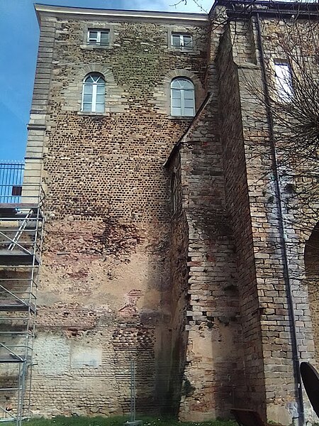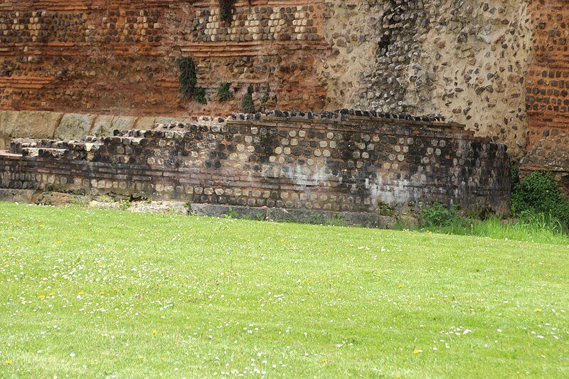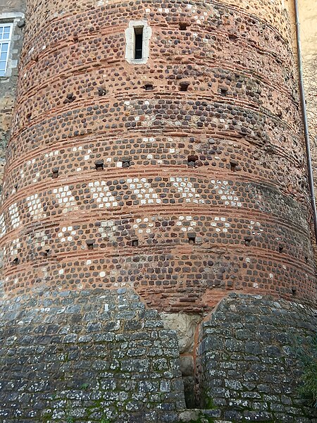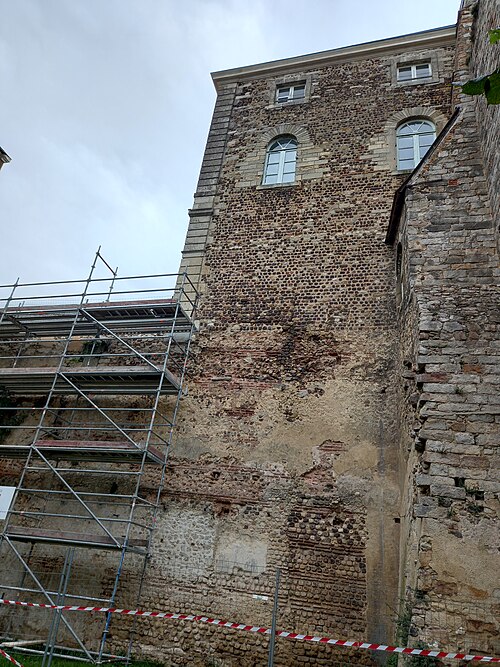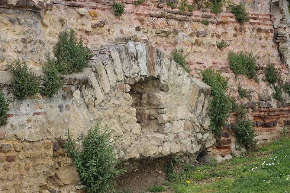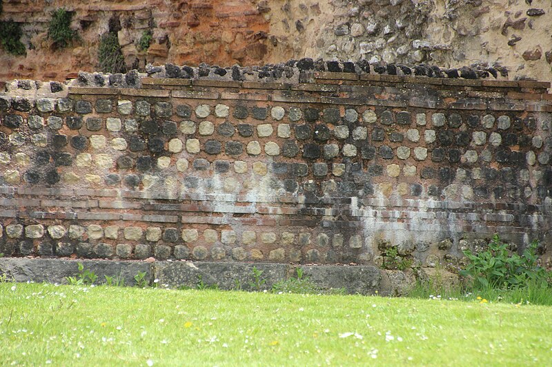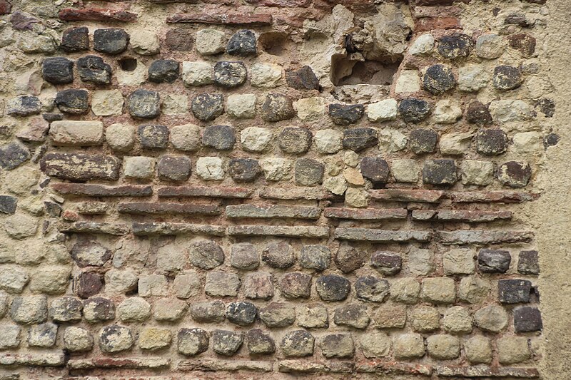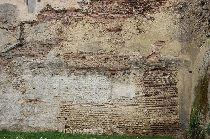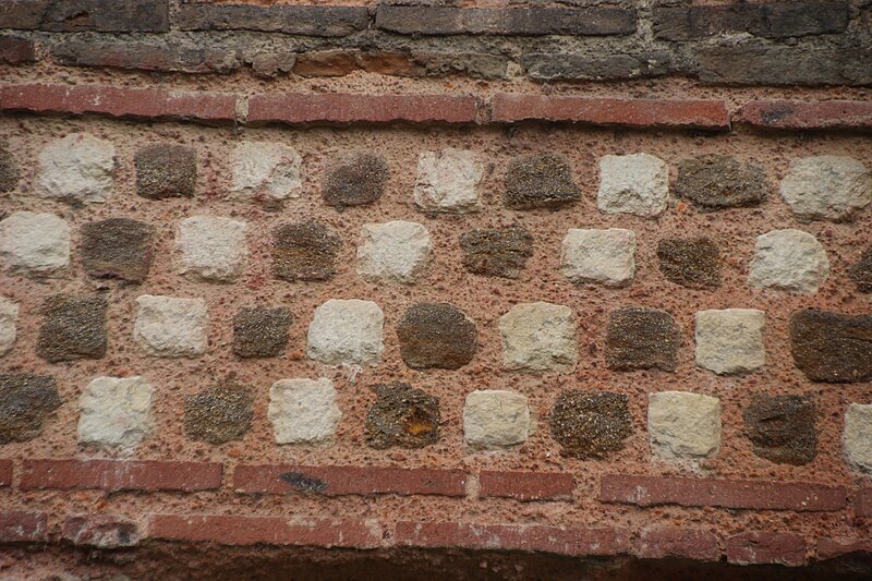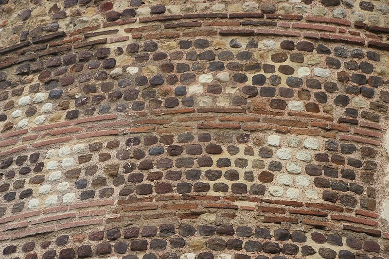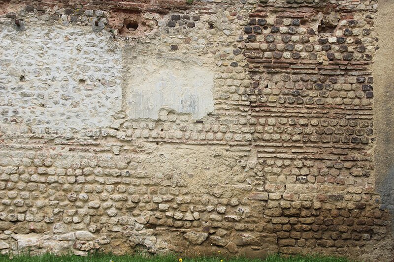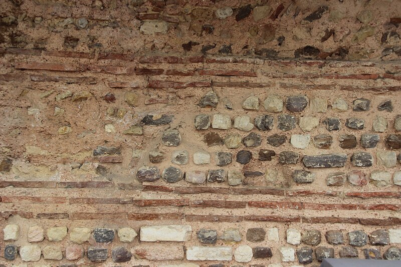 Le parement extérieur se distingue par une polychromie soignée — grès roussard, calcaires clairs et briques rouges — et par des motifs géométriques variés disposés en registres réguliers ; quatorze types de décors ont été répertoriés et combinés pour éviter la monotonie, traduisant une tradition constructive locale attestée sur d'autres vestiges de la région tout en trouvant des parallèles plus éloignés. Les blocs de réemploi, choisis avec soin et parfois ciselés, figurent sur une à trois assises à la base de la muraille et proviennent d'éléments monumentaux ou funéraires antérieurs.