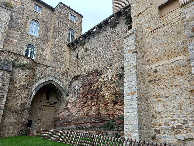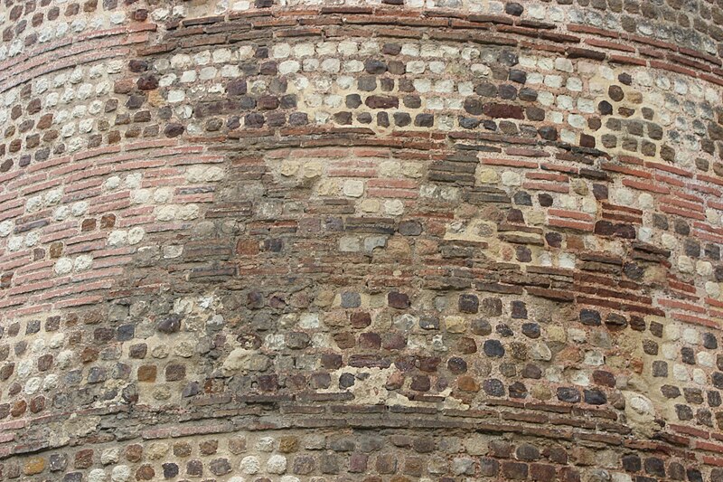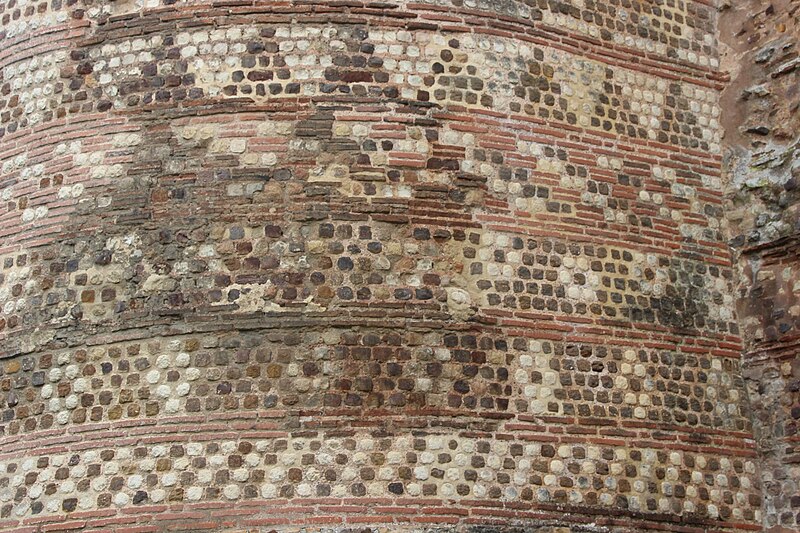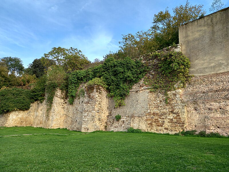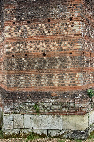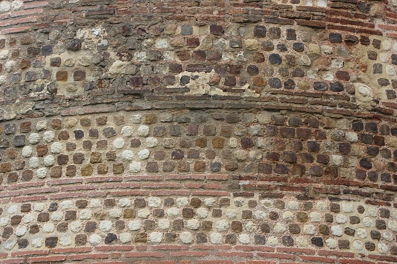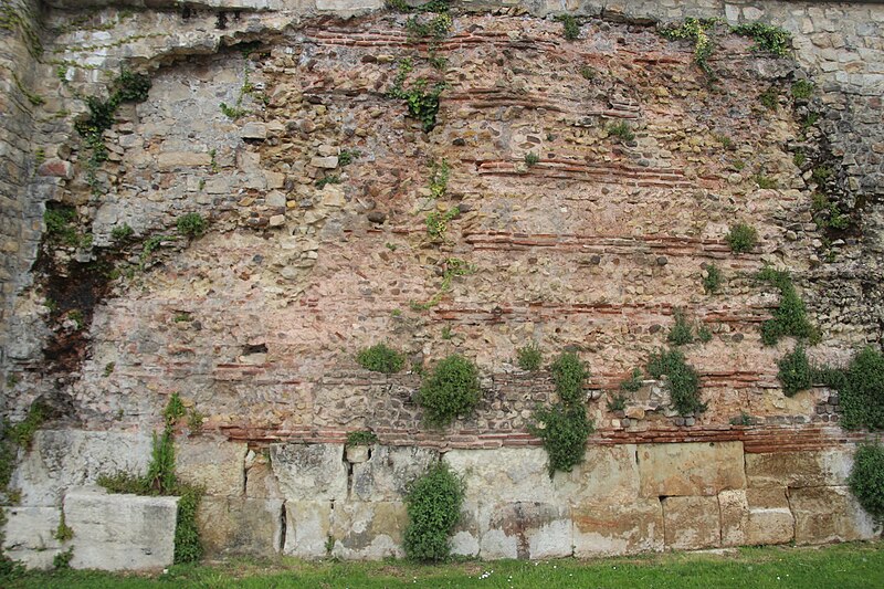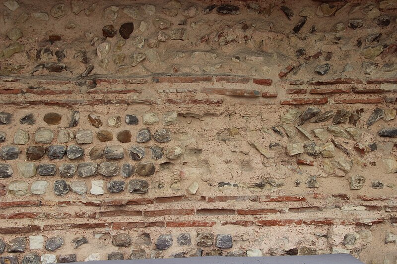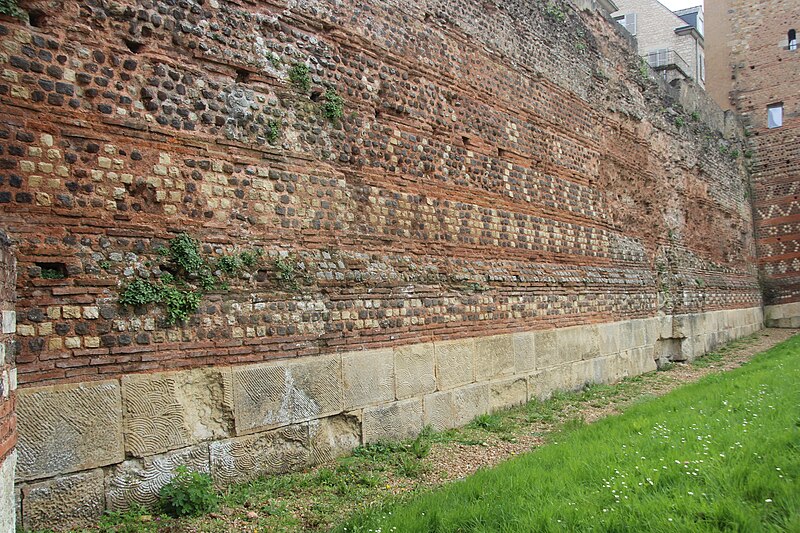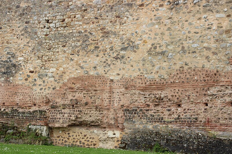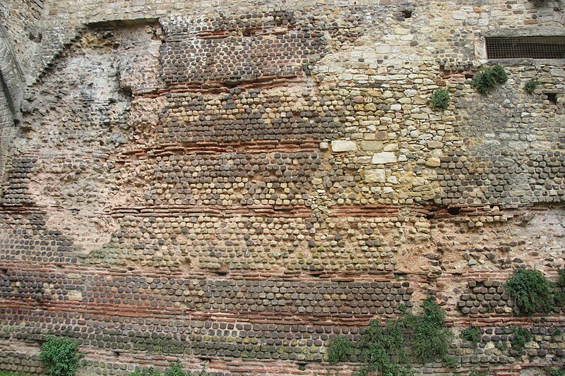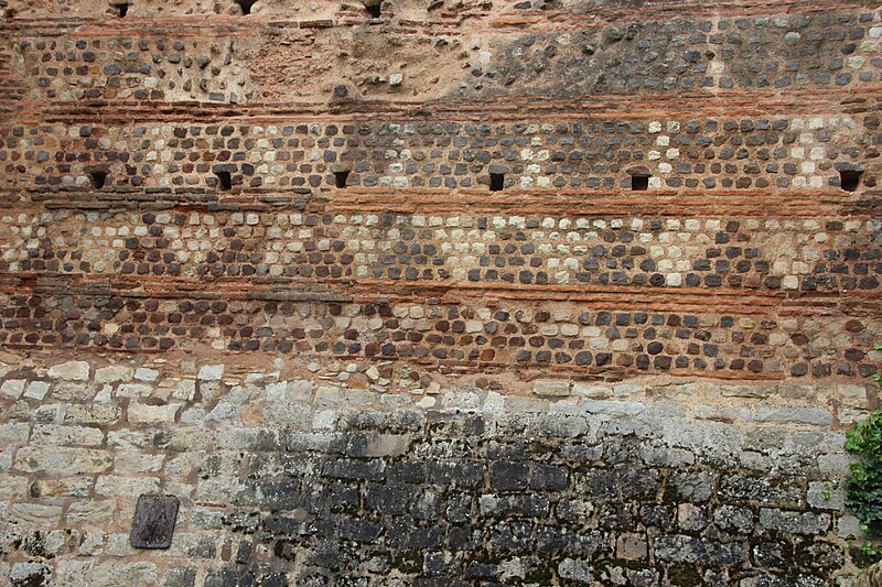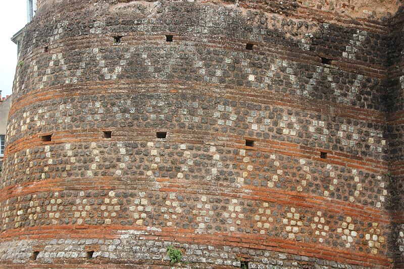 La construction repose sur un noyau d'opus caementicium entre deux parements, avec une succession de bandes de briques plates et de moellons polychromes issus du réemploi et de carrières locales ; le volume de la courtine et des tours a été évalué à quelque 70 000 m3 et les briques utilisées, au nombre d'approximativement 400 000, présentent des dimensions majoritairement de 32 × 26 cm, parfois plus grandes. Le mortier de chaux, estimé à 60 000 tonnes, se décline en deux formules — un noyau blanc-beige et un mortier de parement riche en tuileau de teinte rose — dont l'examen permet de suivre les étapes du chantier. Le bois a servi aux échafaudages et à des pieux de fondation, comme en témoignent des trous de boulins et des pieux mis au jour lors de fouilles.