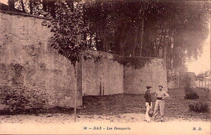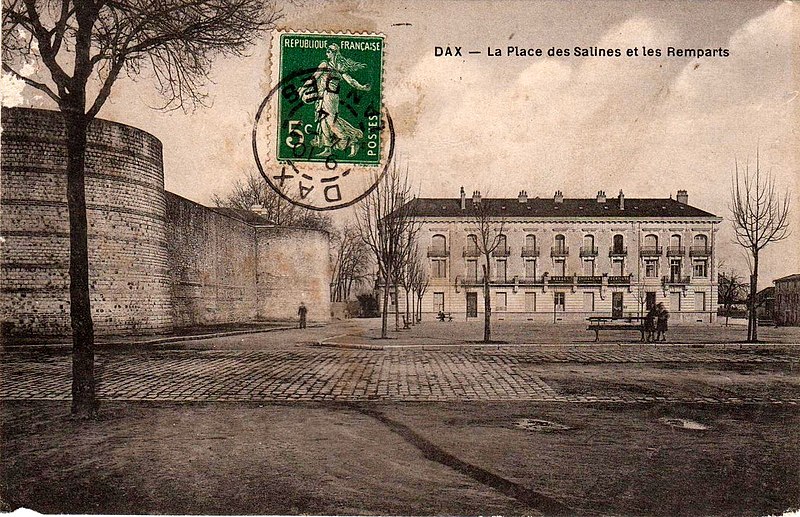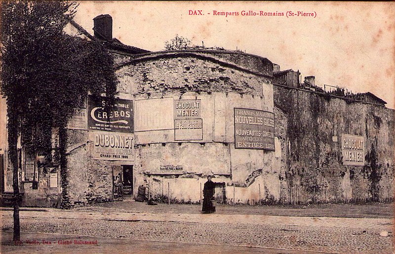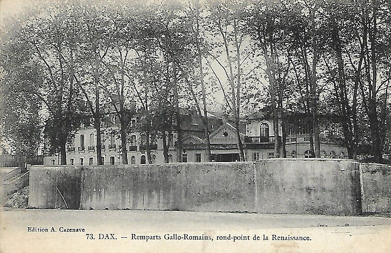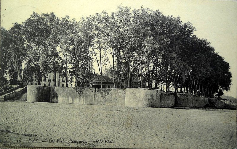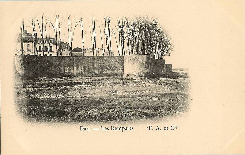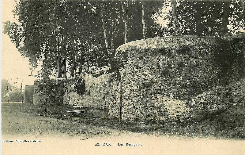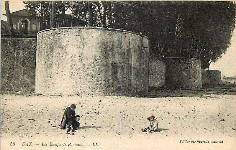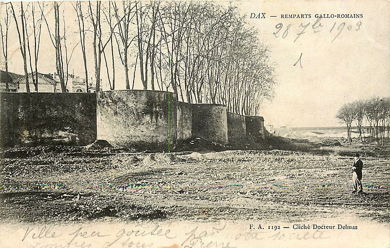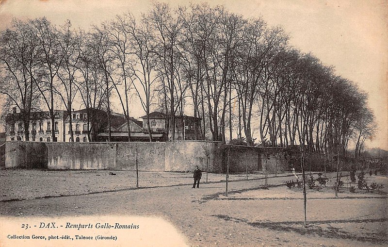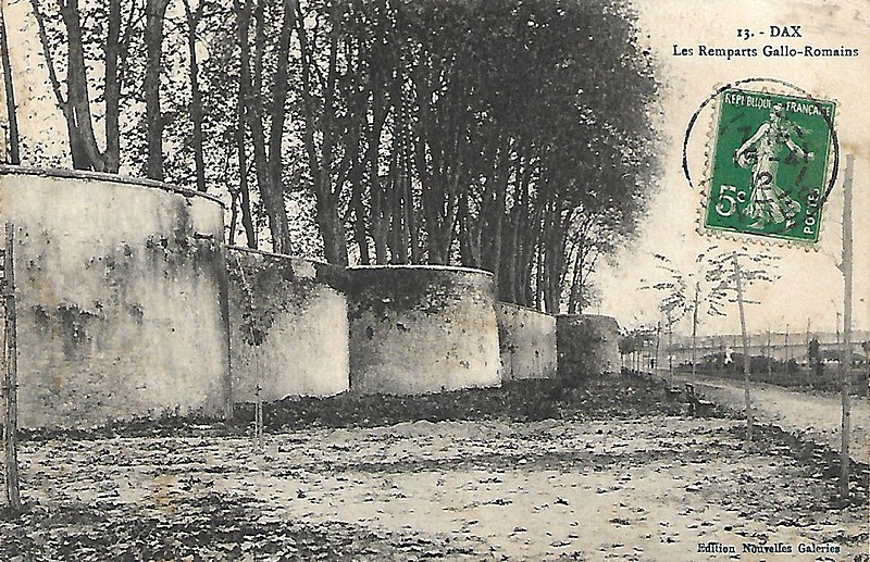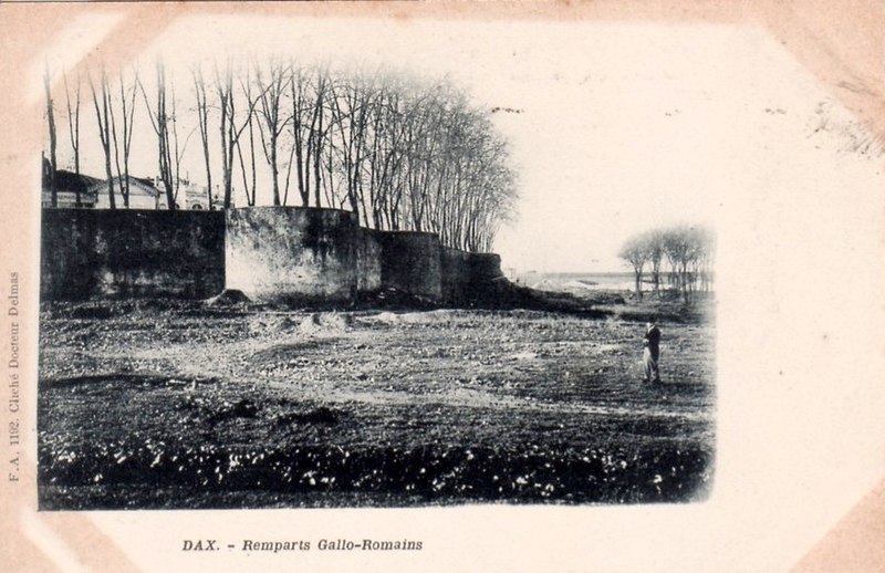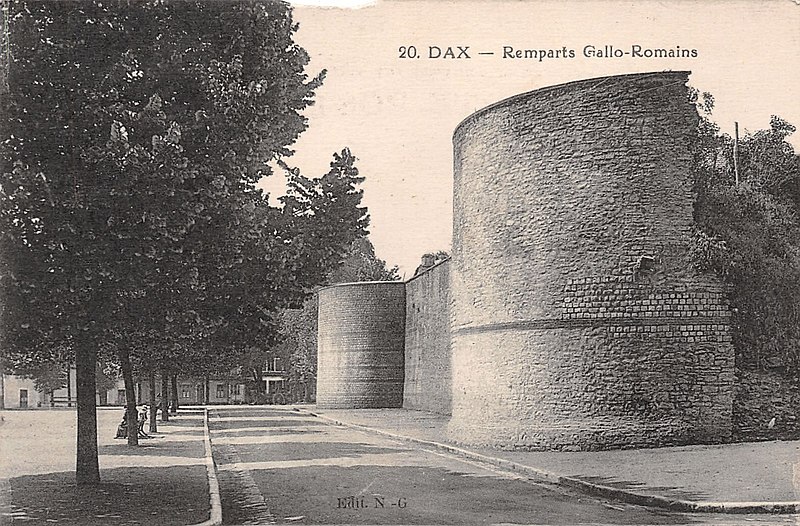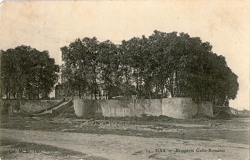 L'enceinte gallo-romaine de Dax est une fortification du Bas-Empire qui entoure la ville sur la rive gauche de l'Adour, son côté septentrional s'approchant à une quinzaine de mètres du fleuve. De forme sensiblement quadrilatère, légèrement allongée du nord au sud, elle présente un périmètre de 1 465 mètres pour une surface protégée de 12,60 hectares. Les remparts sont attribués à la seconde moitié du IVe siècle, peut-être entre 350 et 375, d'après des inscriptions et des monnaies retrouvées dans les fondations et les maçonneries. Classés monuments historiques par arrêté en 1889, les vestiges conservés consistent en importants tronçons de courtine et quelques tours sur les flancs nord et est, visibles place des Salines et dans le parc Théodore Denis. La courtine mesure de 4,20 à 4,50 m d'épaisseur à la base, environ 4 m au sommet et sa hauteur est évaluée à 9,20 m jusqu'au chemin de ronde, plus près de deux mètres pour un crénelage éventuel. Le nombre des tours est estimé entre 38 et 46 selon les auteurs ; elles sont semi‑cylindriques et intégrées à l'épaisseur de la courtine, plus rares du côté de l'Adour où le fleuve assure une protection naturelle. Les fondations reposent sur des plaques calcaires surmontées de blocs, et dans un secteur nord‑est humide un lit de fascines a été intercalé avant le remblai de pierres. Les parements des courtines et des tours sont réalisés en opus mixtum, alternant cinq à sept rangs de petits moellons calcaires et trois lits d'éléments de terre cuite architecturale, l'espace entre parements étant rempli de pierres noyées dans du mortier. Une grande partie de la courtine a été démolie par la municipalité au XIXe siècle, entraînant la disparition de la plupart des portes et poternes ; il ne subsiste aujourd'hui que les tronçons et tours cités précédemment. Des fouilles ont été menées en 2012-2013 sur la face nord en vue d'une restauration et d'une mise en valeur des vestiges. L'enceinte, son état, ses techniques de construction et son implantation urbaine témoignent de l'organisation défensive d'une ville gallo‑romaine au Bas‑Empire.