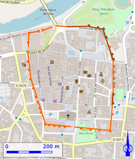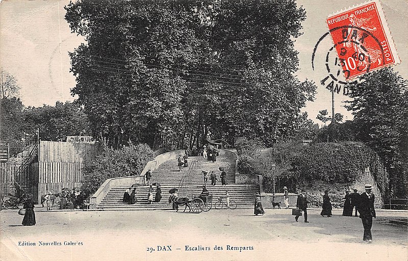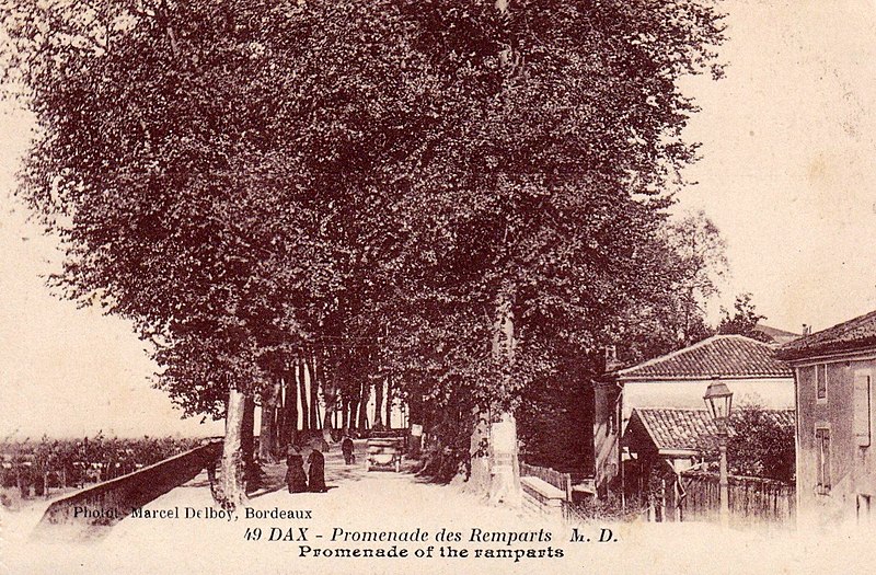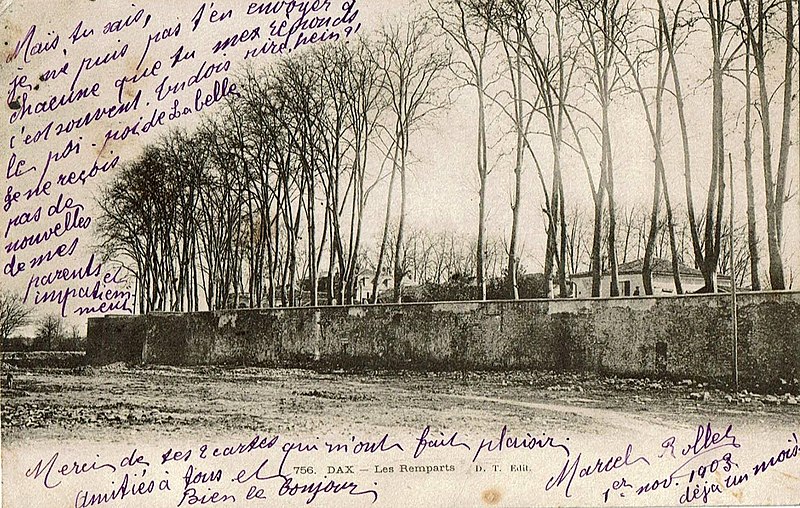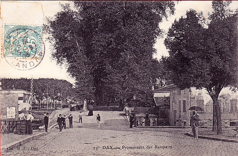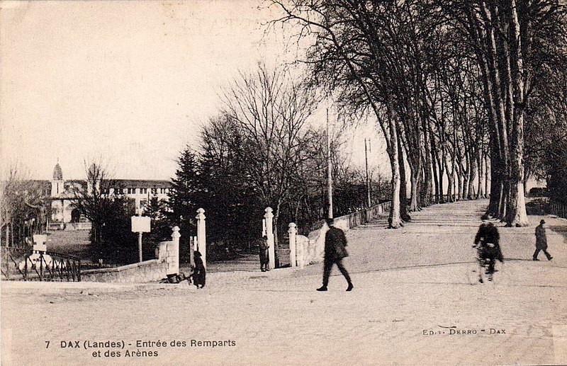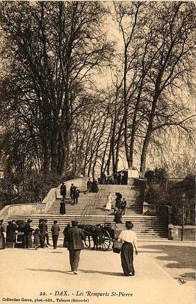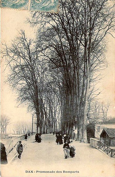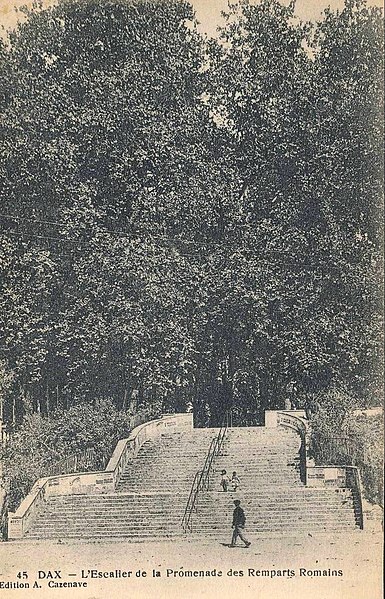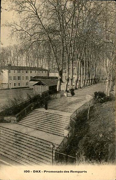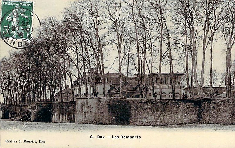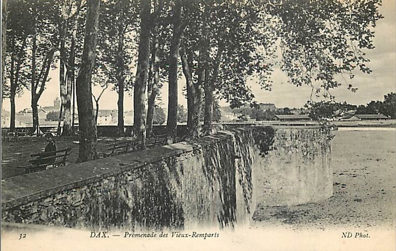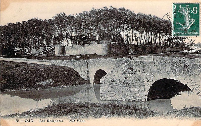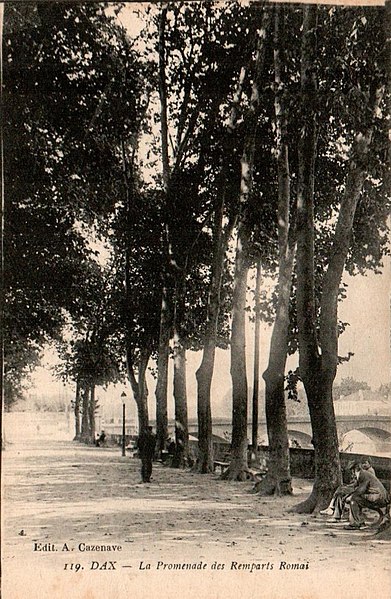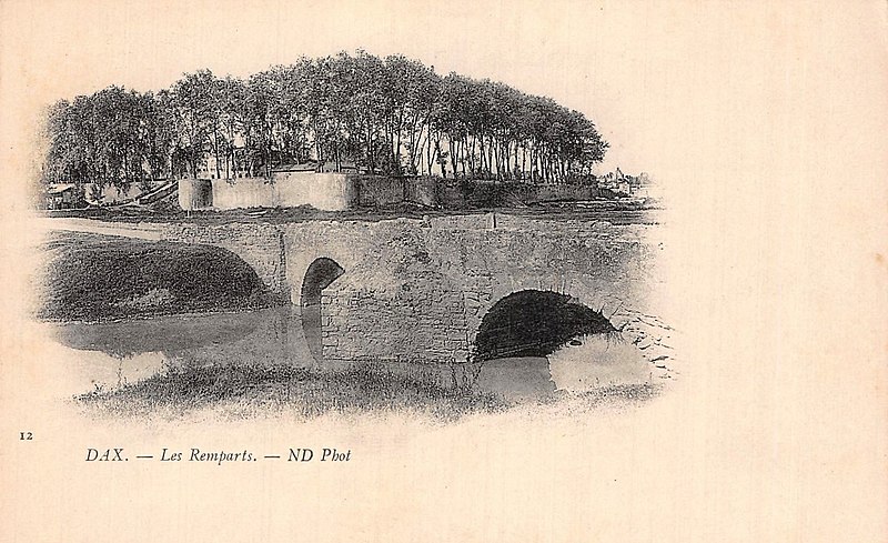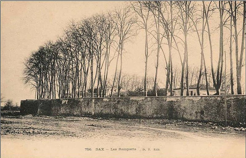 L'enceinte gallo-romaine de Dax est une fortification du Bas-Empire qui entoure la ville sur la rive gauche de l'Adour, son côté septentrional s'approchant à une quinzaine de mètres du fleuve. De forme sensiblement quadrilatère, légèrement allongée du nord au sud, elle présente un périmètre de 1 465 mètres pour une surface protégée de 12,60 hectares. Les remparts sont attribués à la seconde moitié du IVe siècle, peut-être entre 350 et 375, d'après des inscriptions et des monnaies retrouvées dans les fondations et les maçonneries. Classés monuments historiques par arrêté en 1889, les vestiges conservés consistent en importants tronçons de courtine et quelques tours sur les flancs nord et est, visibles place des Salines et dans le parc Théodore Denis. La courtine mesure de 4,20 à 4,50 m d'épaisseur à la base, environ 4 m au sommet et sa hauteur est évaluée à 9,20 m jusqu'au chemin de ronde, plus près de deux mètres pour un crénelage éventuel. Le nombre des tours est estimé entre 38 et 46 selon les auteurs ; elles sont semi‑cylindriques et intégrées à l'épaisseur de la courtine, plus rares du côté de l'Adour où le fleuve assure une protection naturelle. Les fondations reposent sur des plaques calcaires surmontées de blocs, et dans un secteur nord‑est humide un lit de fascines a été intercalé avant le remblai de pierres. Les parements des courtines et des tours sont réalisés en opus mixtum, alternant cinq à sept rangs de petits moellons calcaires et trois lits d'éléments de terre cuite architecturale, l'espace entre parements étant rempli de pierres noyées dans du mortier. Une grande partie de la courtine a été démolie par la municipalité au XIXe siècle, entraînant la disparition de la plupart des portes et poternes ; il ne subsiste aujourd'hui que les tronçons et tours cités précédemment. Des fouilles ont été menées en 2012-2013 sur la face nord en vue d'une restauration et d'une mise en valeur des vestiges. L'enceinte, son état, ses techniques de construction et son implantation urbaine témoignent de l'organisation défensive d'une ville gallo‑romaine au Bas‑Empire.
