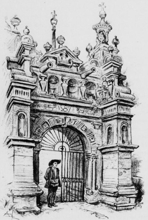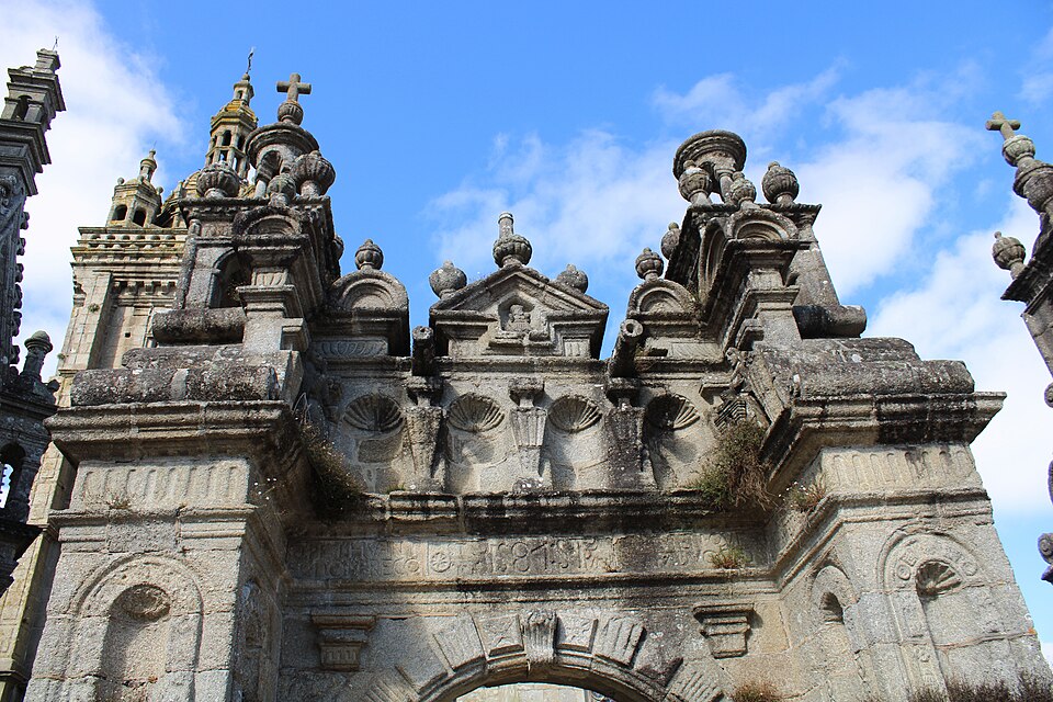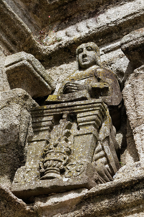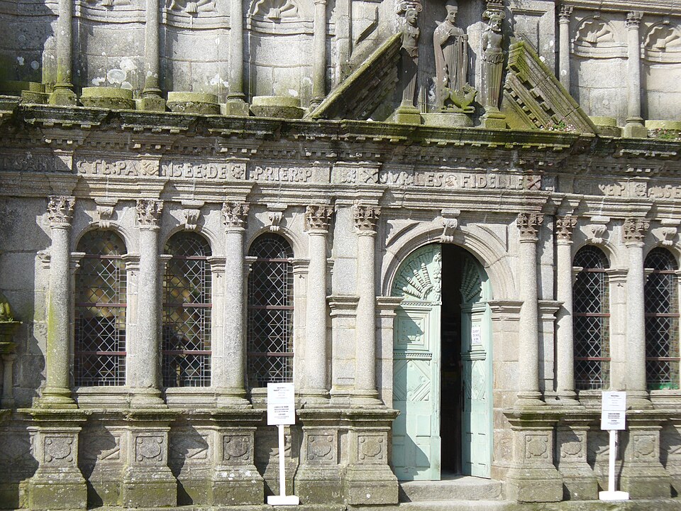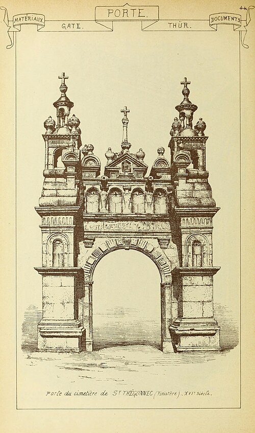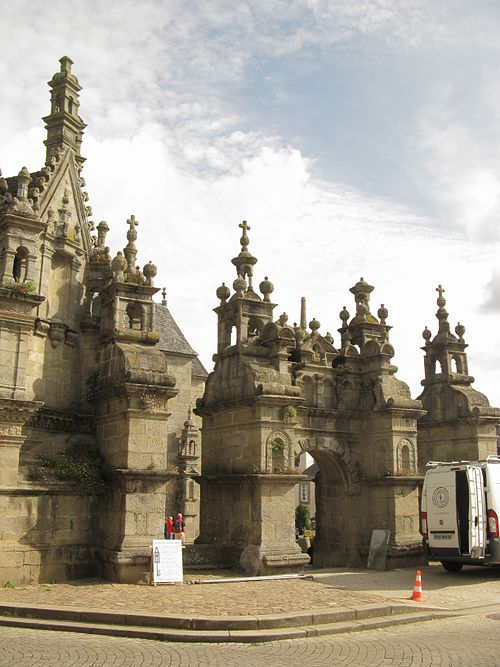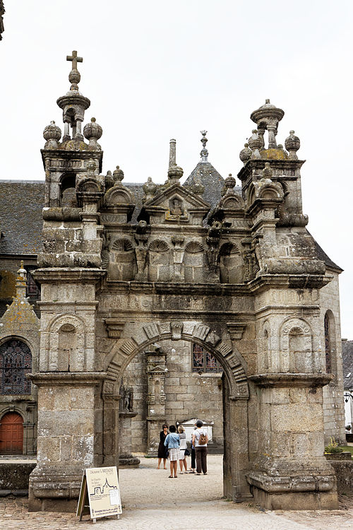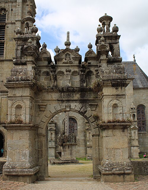 La porte triomphale, ou arc de triomphe, est un édifice de style Renaissance en granit de Plounéour‑Ménez réalisé dans l’atelier du château de Kerjean entre 1587 et 1589. Elle se compose de quatre piliers massifs surmontés de lanternes cubiques et de lanternons ; deux échaliers relient les piliers extérieurs et l’entrée centrale est formée par un arc en plein cintre qui était autrefois fermé par une grille. L’arc est orné de trois statues en kersanton : à droite Notre‑Dame du Vrai Secours, à gauche l’archange Gabriel et, au centre, Dieu le Père entouré de deux canons. L’arc de triomphe est classé monument historique depuis 1914 et le mur de cimetière attenant depuis 1928.